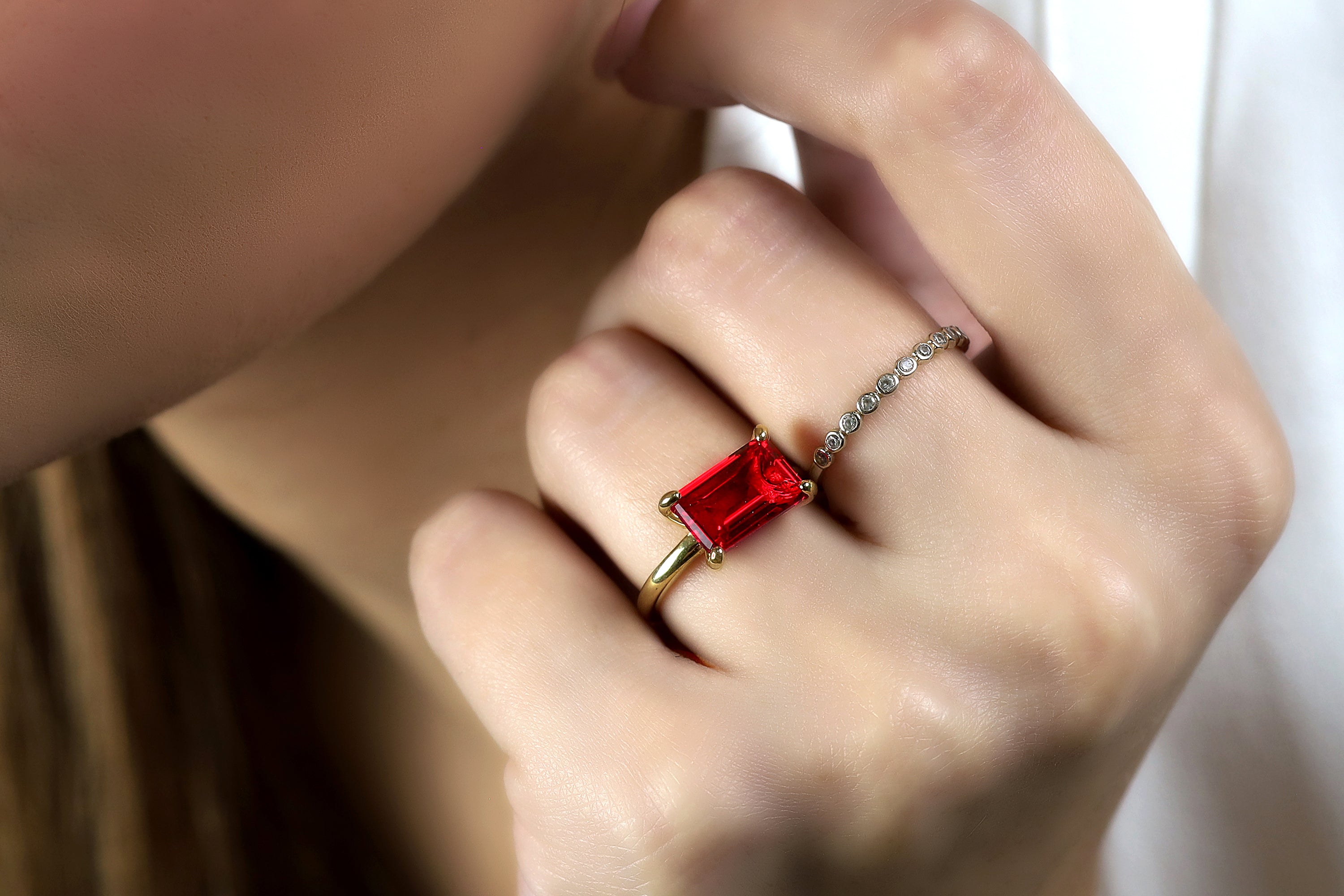 An undeniably elegant gold Ruby ring with a chic and modern design. This timeless Ruby ring is a stunning and memorable gift for a special occasion. Bring happiness to a friend, wife, or girlfriend with this piece as a jewelry gift.