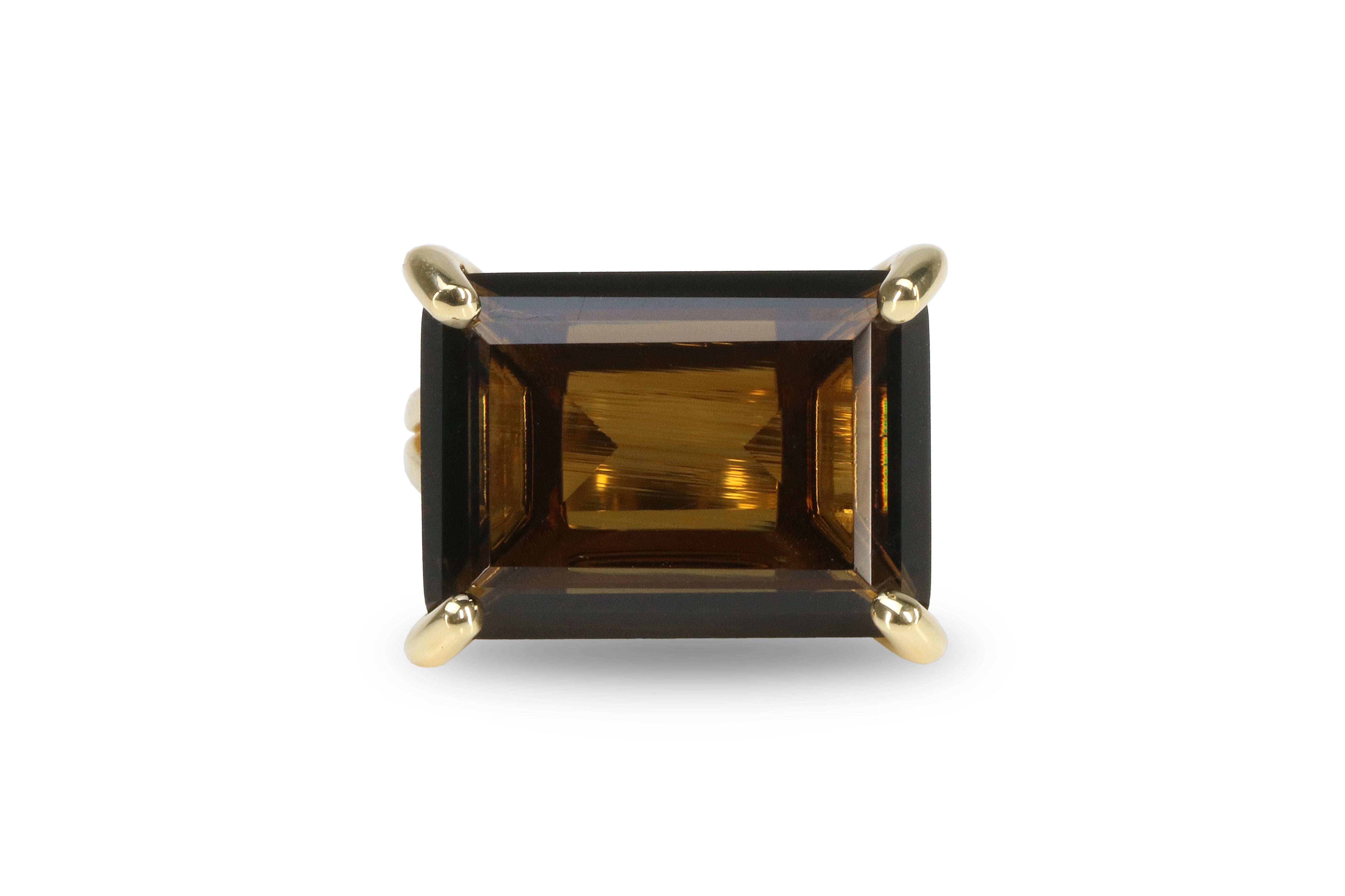 This smoky quartz ring features a horizontal rectangular cut gemstone set in warm 14k gold, blending modern design with classic sophistication. The deep brown hue and clean lines make it a perfect statement piece for any outfit. Ideal as a gift for mom or a self-indulgent treasure, this handmade gemstone ring radiates natural warmth and refined beauty.