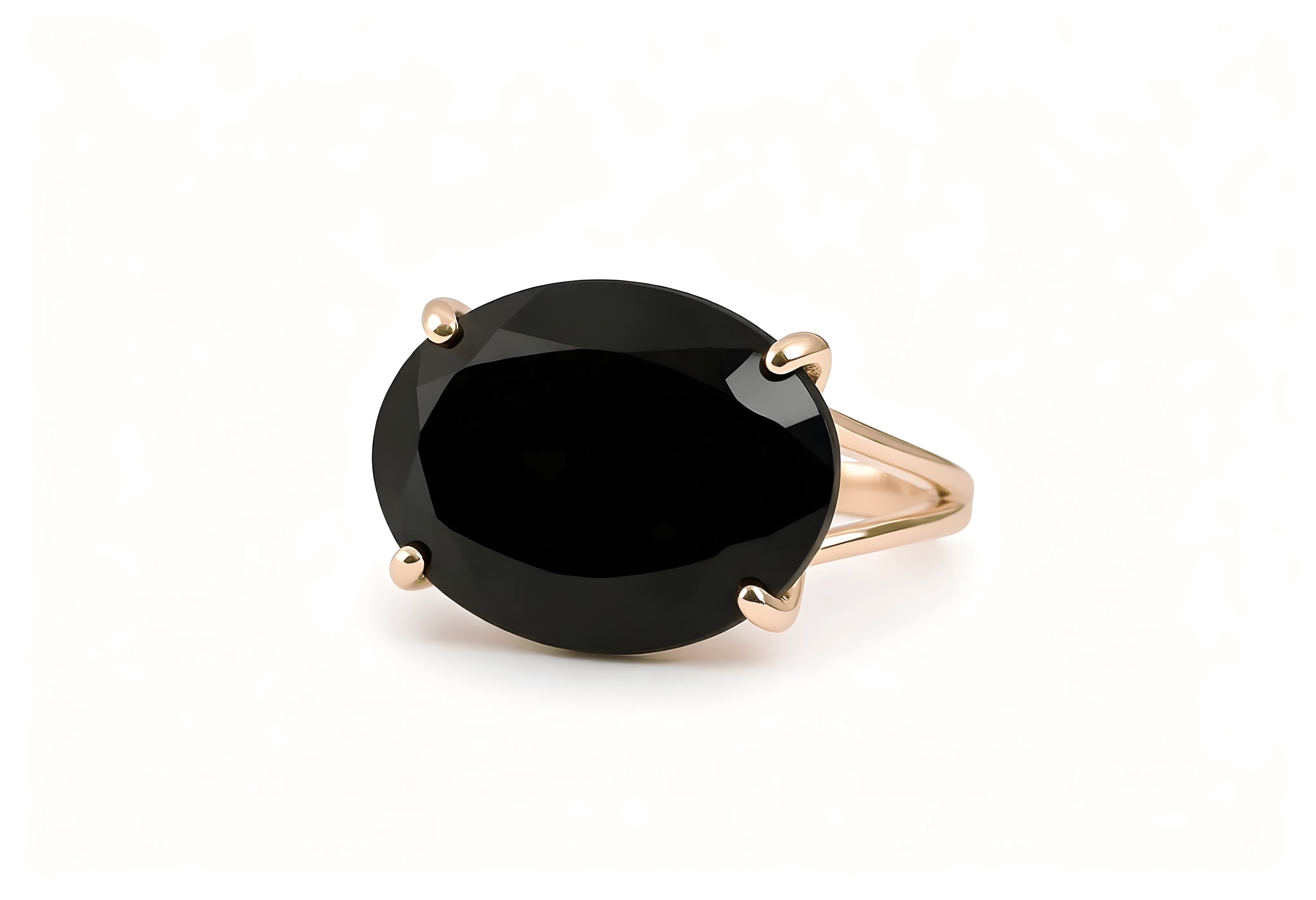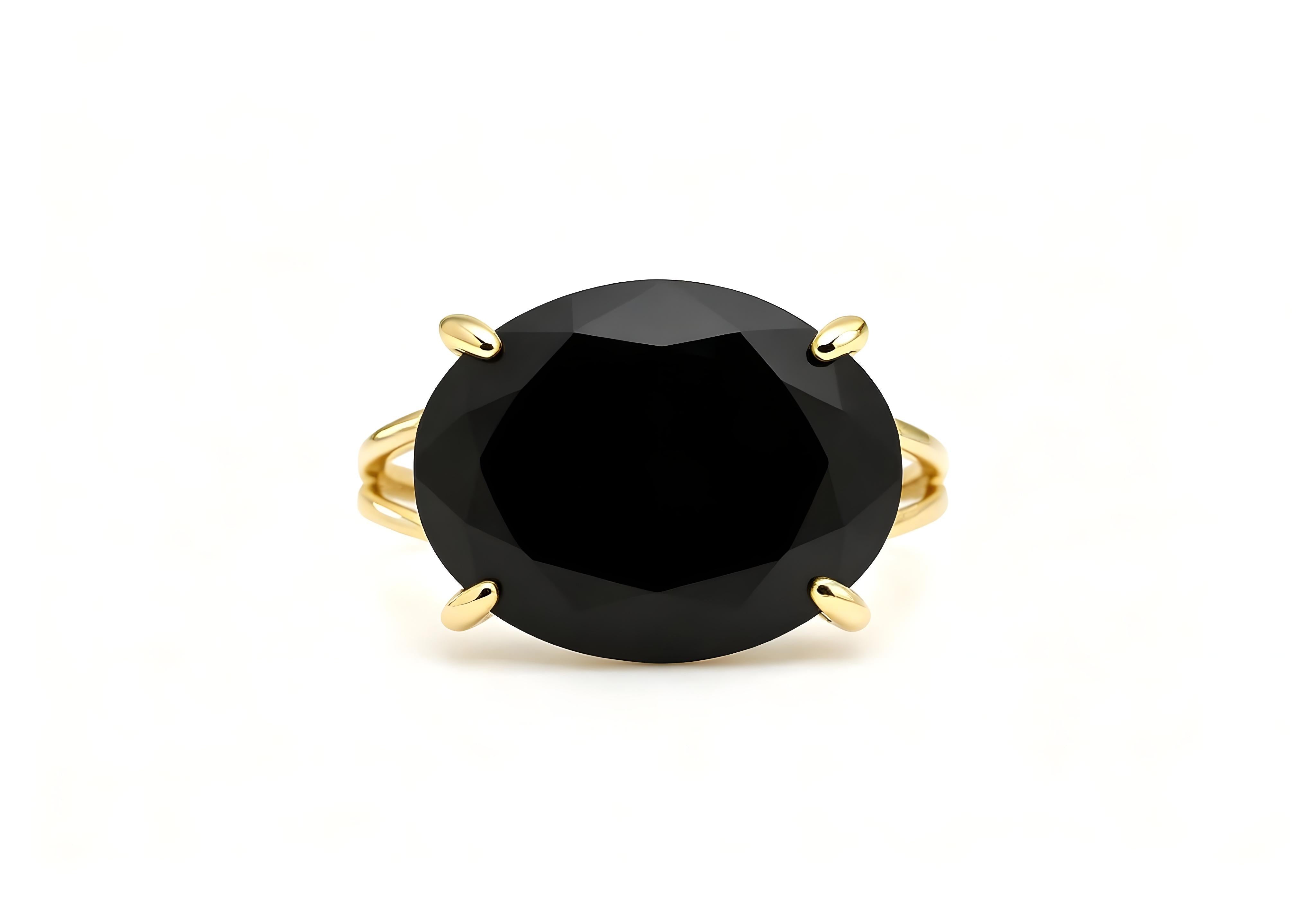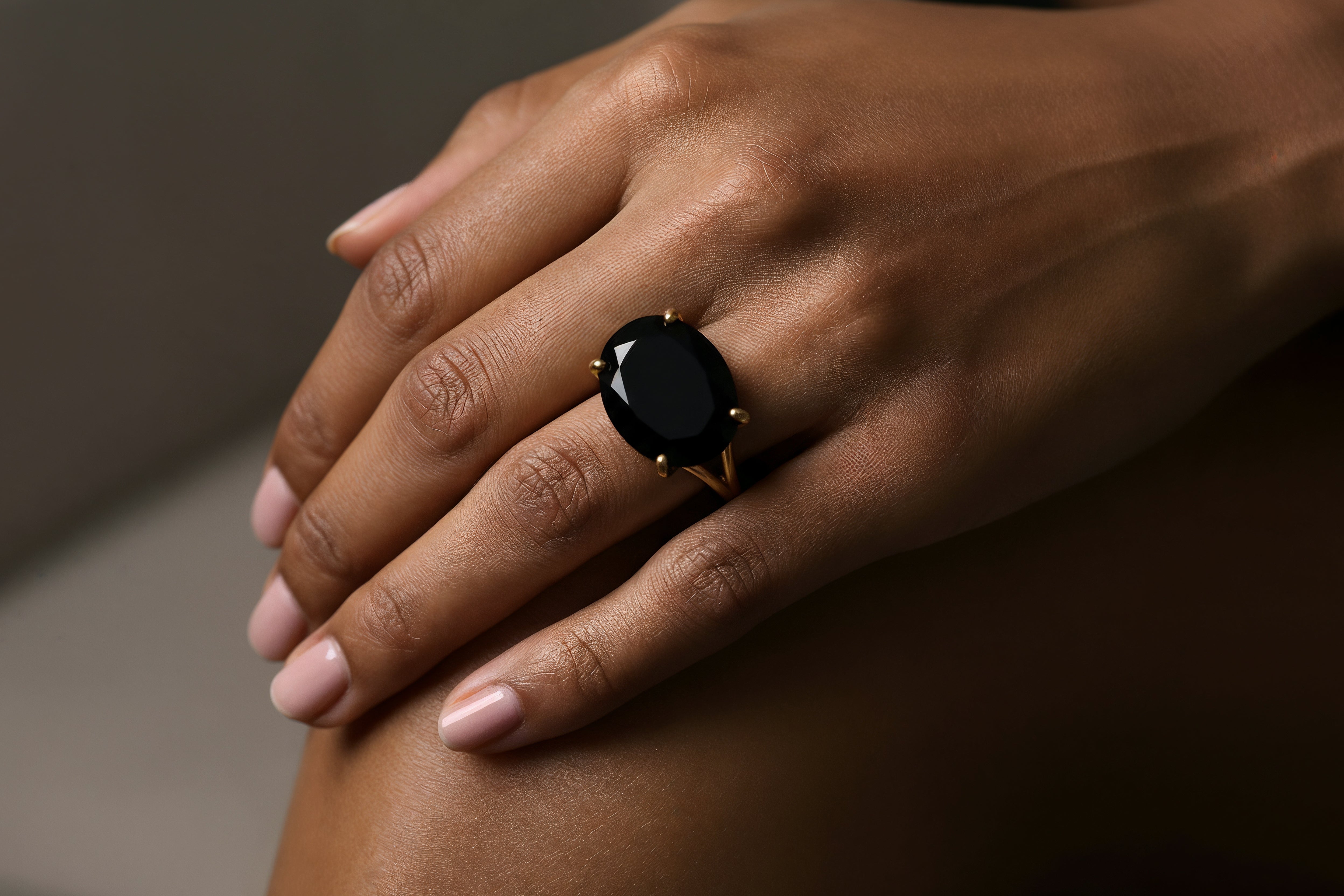 This black onyx ring is designed in gold with an oval-cut gemstone secured by a prong setting. The wide design and bold black stone make it a striking cocktail ring that pairs elegance with strength. Known for its grounding energy, onyx adds both meaning and modern style. Handcrafted with care, this gemstone ring is ideal as a statement piece, a thoughtful handmade gift, or a versatile accessory for women.
