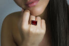 This rectangular garnet ring is crafted in 14k gold filled and features a faceted emerald cut gemstone. Garnet, the January birthstone, is cherished for its deep red tones symbolizing passion, energy, and love. The sleek rectangular cut adds a bold, modern touch, while the option for custom engraving makes it truly personal. Handcrafted with care, this ring is perfect as a statement cocktail ring, a thoughtful gift, or a meaningful keepsake.