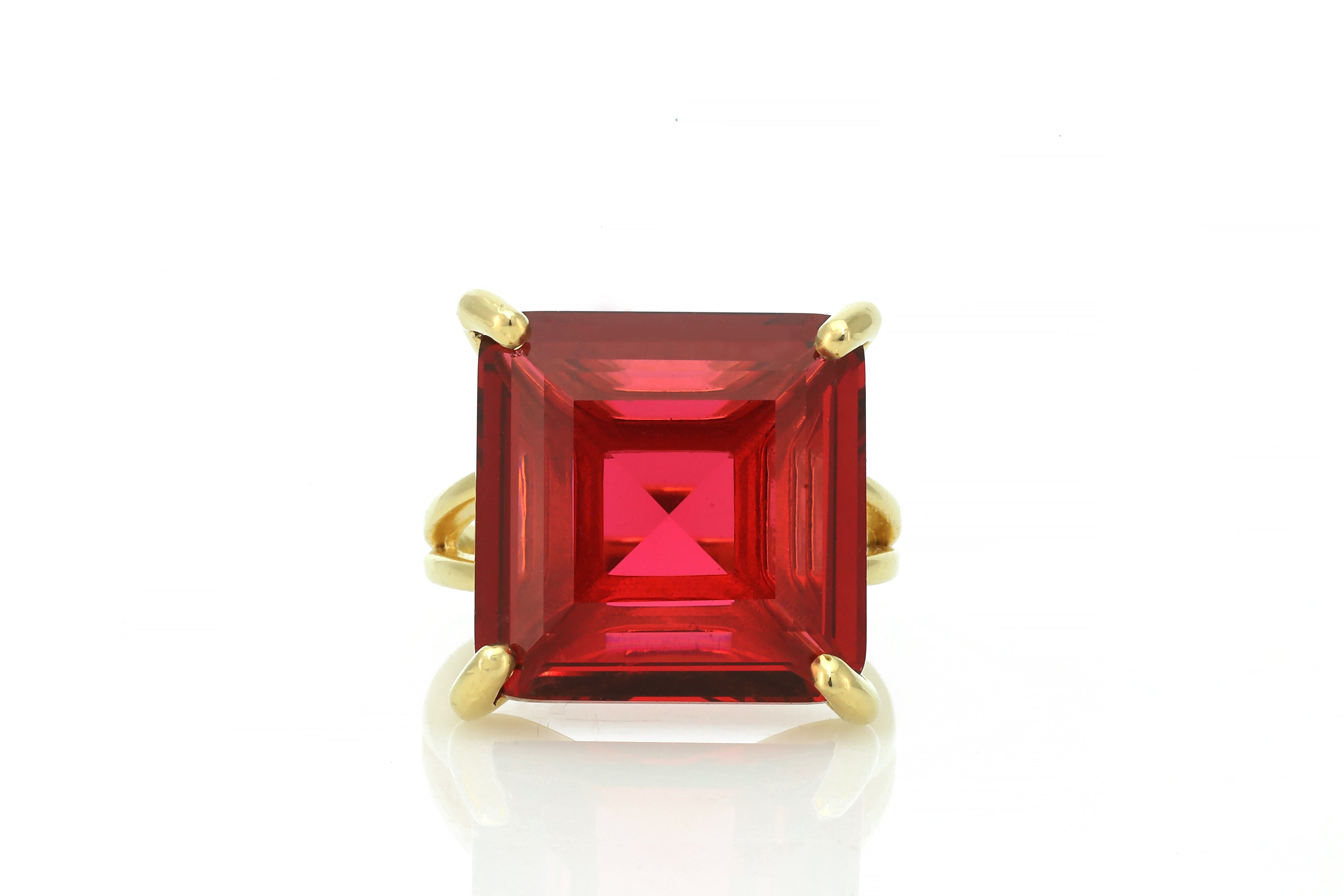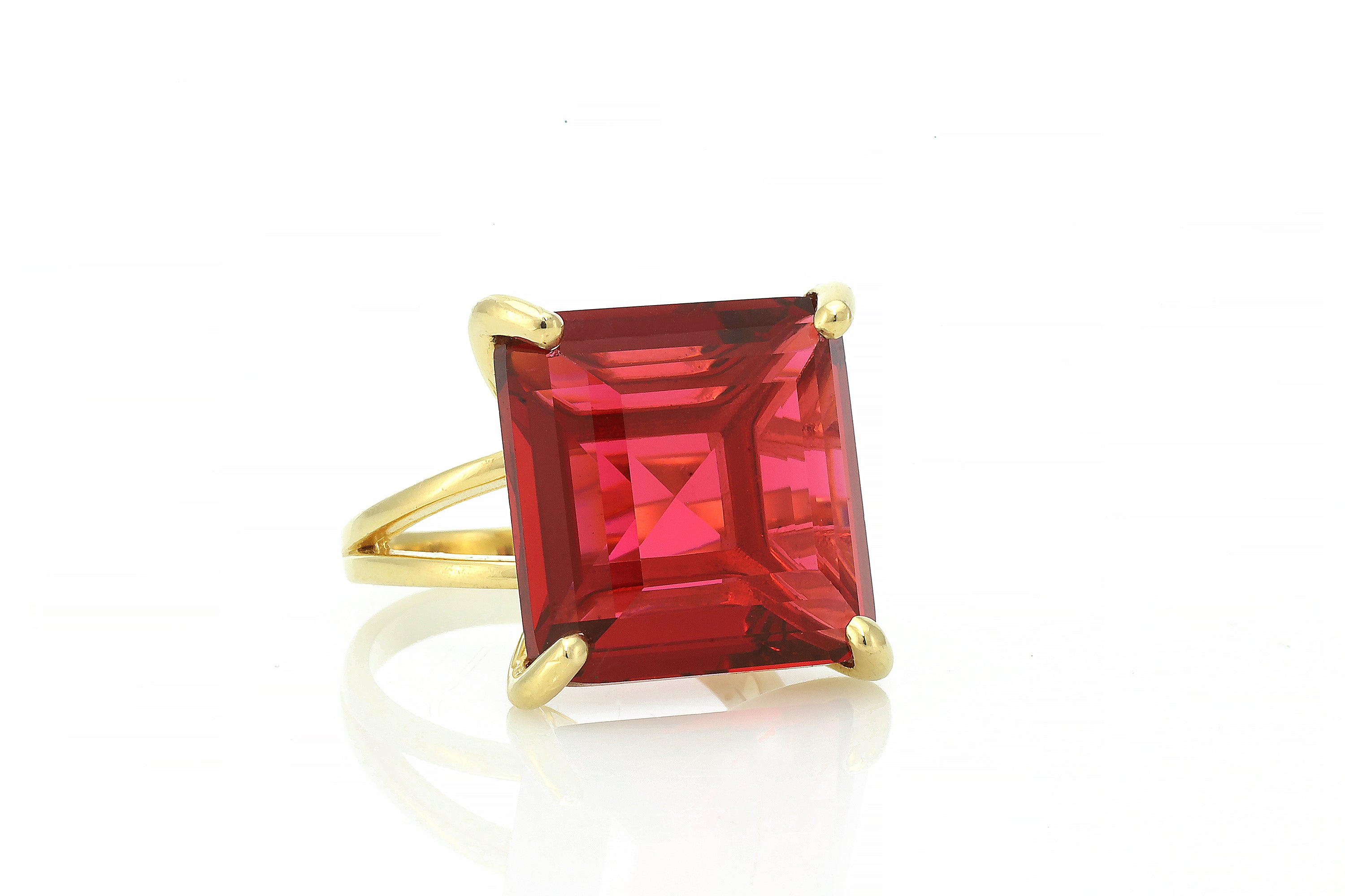 This pink tourmaline ring features a bold princess-cut gemstone set in polished 18k gold vermeil. The square shape accentuates the gem’s natural brilliance, while the four-prong setting adds a timeless and refined touch. Designed for both everyday luxury and special occasions, it’s an elegant way to celebrate October’s birthstone with radiant pink hues and warm golden shine.