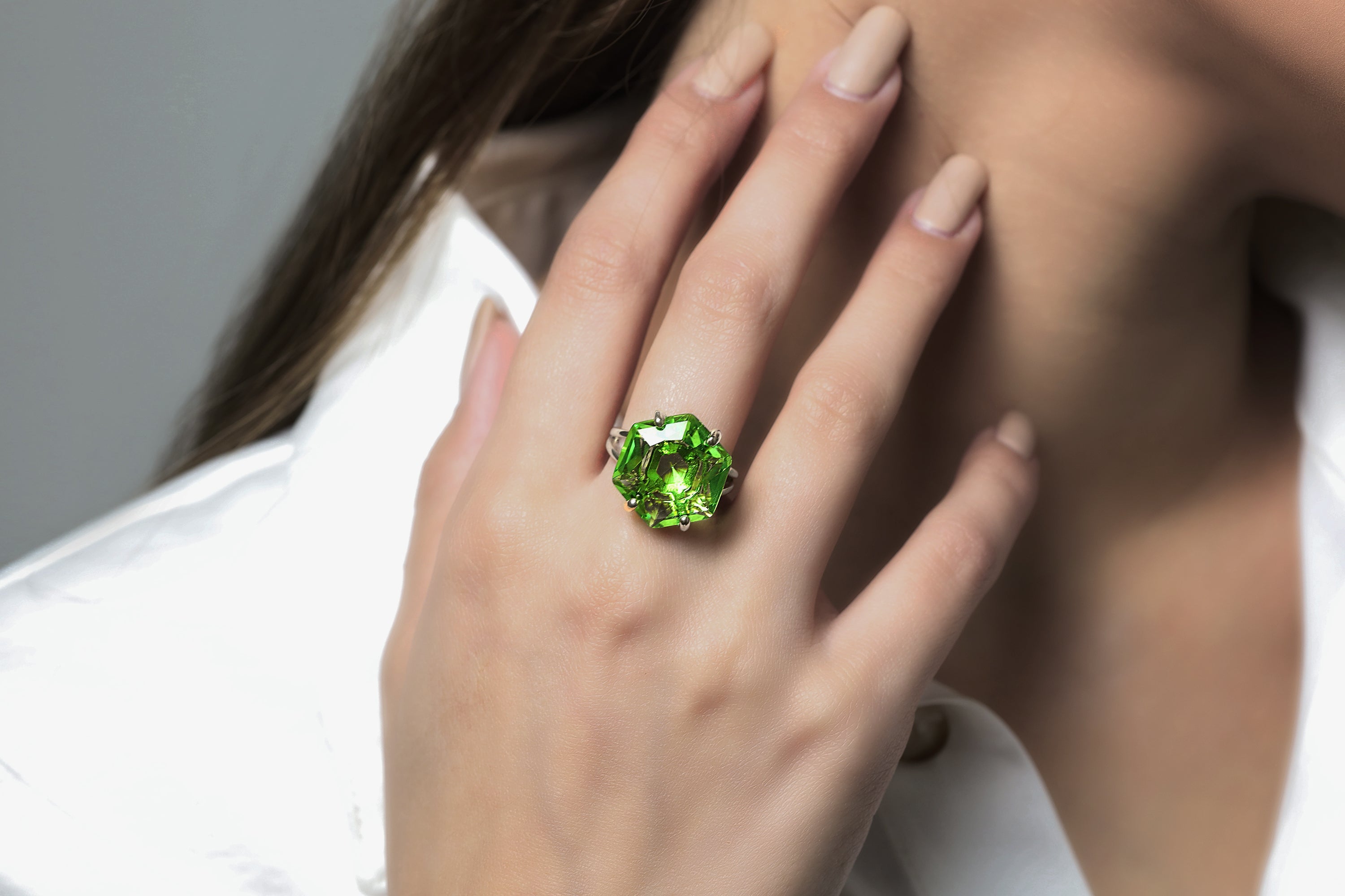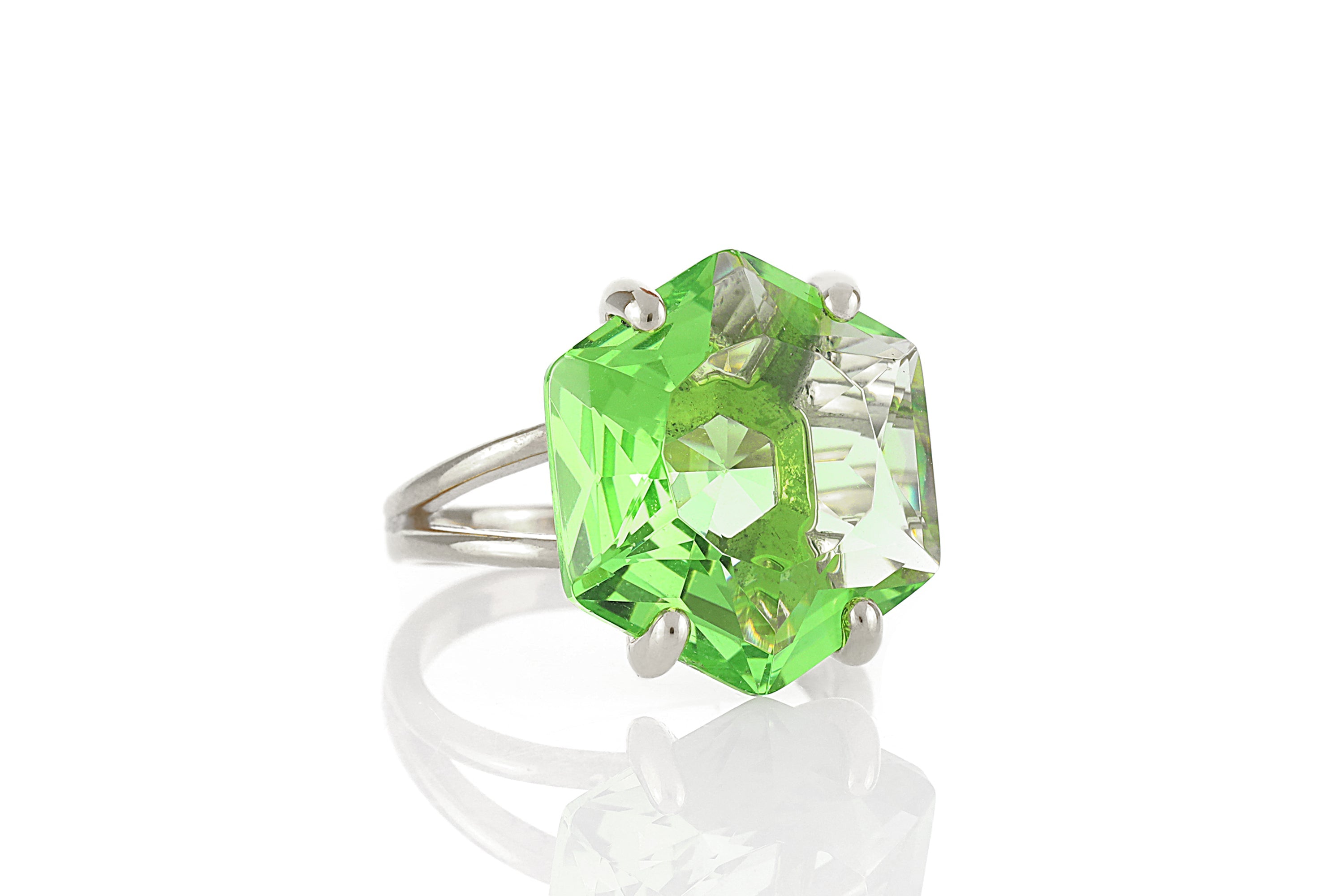 Elevate your evening wear with our Green Tourmaline Hexagon Cut Gemstone Ring. This stunning piece features a vivid green tourmaline, expertly cut into a hexagon shape and set in a classic gold prong setting, making it a perfect choice for sophisticated events or glamorous nights out. The ring's strong green color and shiny facets ensure it catches the light and captures attention. Ideal for those who desire a statement piece that combines elegance with a touch of modern flair.