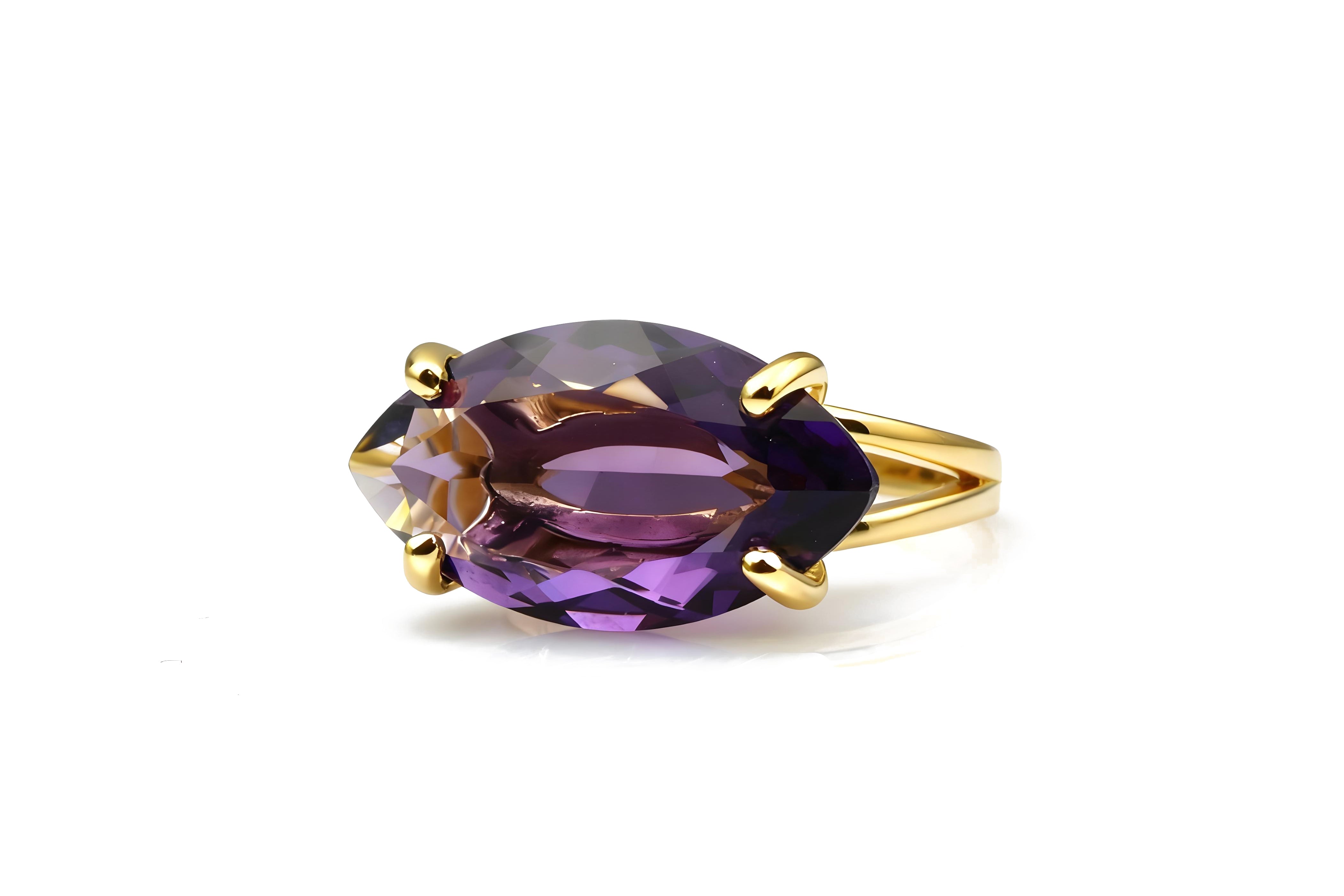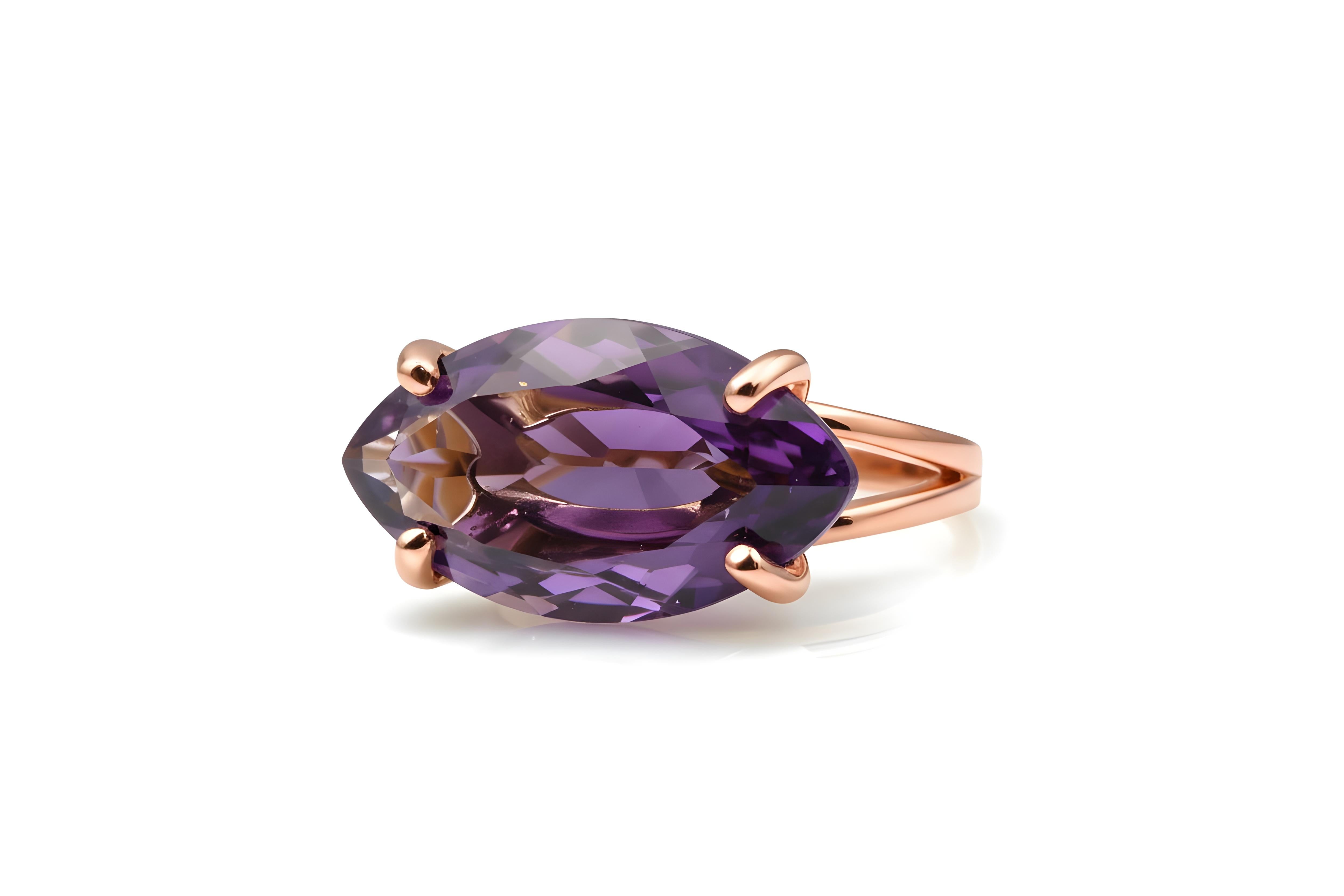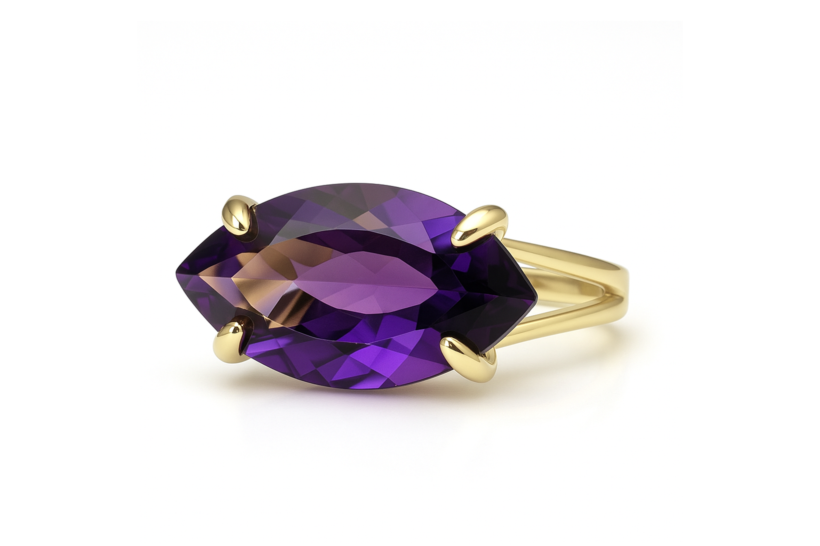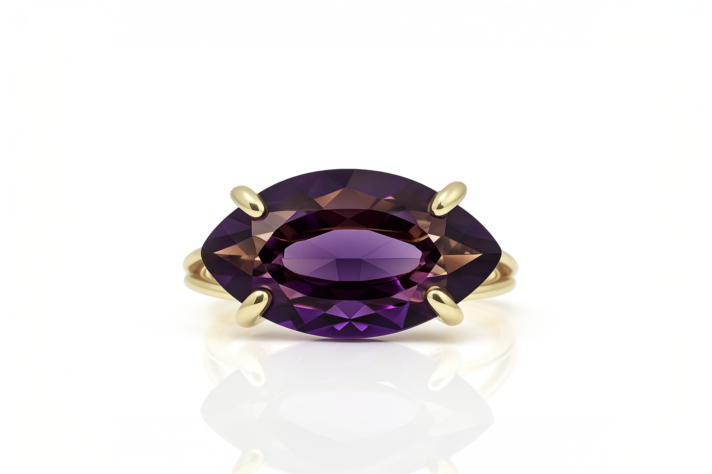 This 14k gold marquise-cut amethyst ring combines elegance with bold character. The elongated gemstone highlights the finger beautifully, while the warm tone of gold enhances the rich purple hue of the amethyst. Known as the February birthstone, amethyst represents peace and clarity. A stunning handmade ring perfect for weddings, gifts, or everyday luxury.