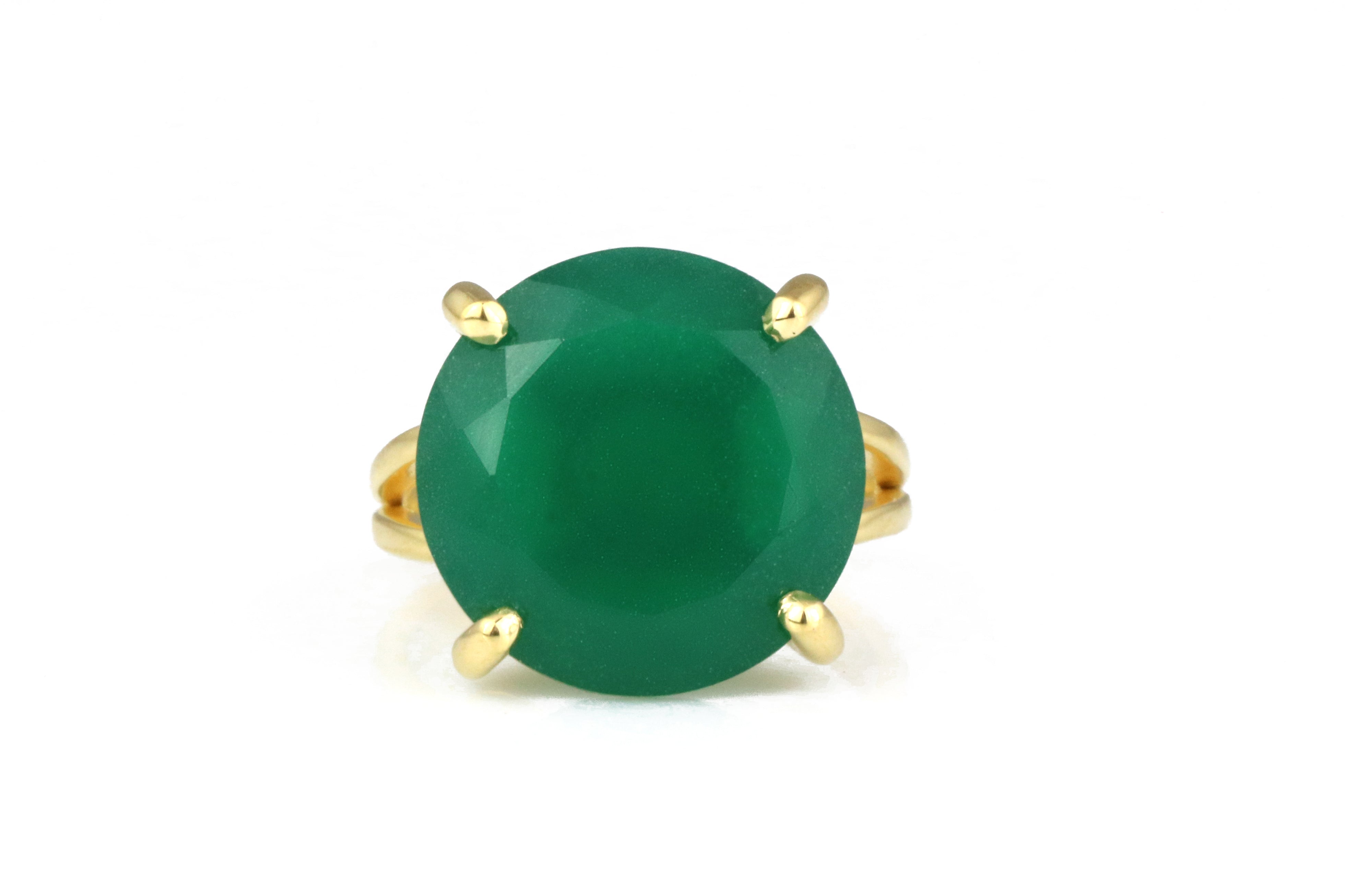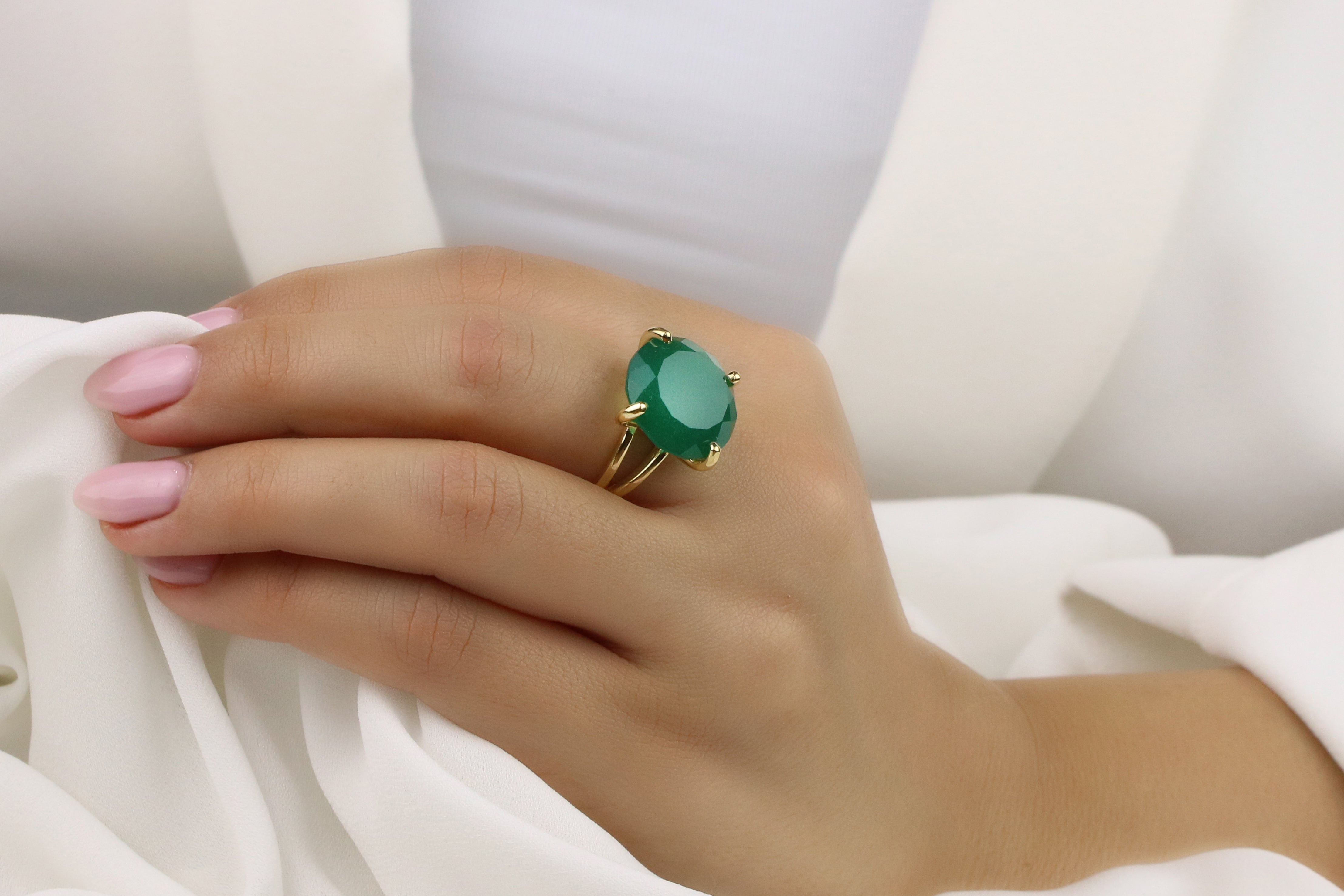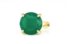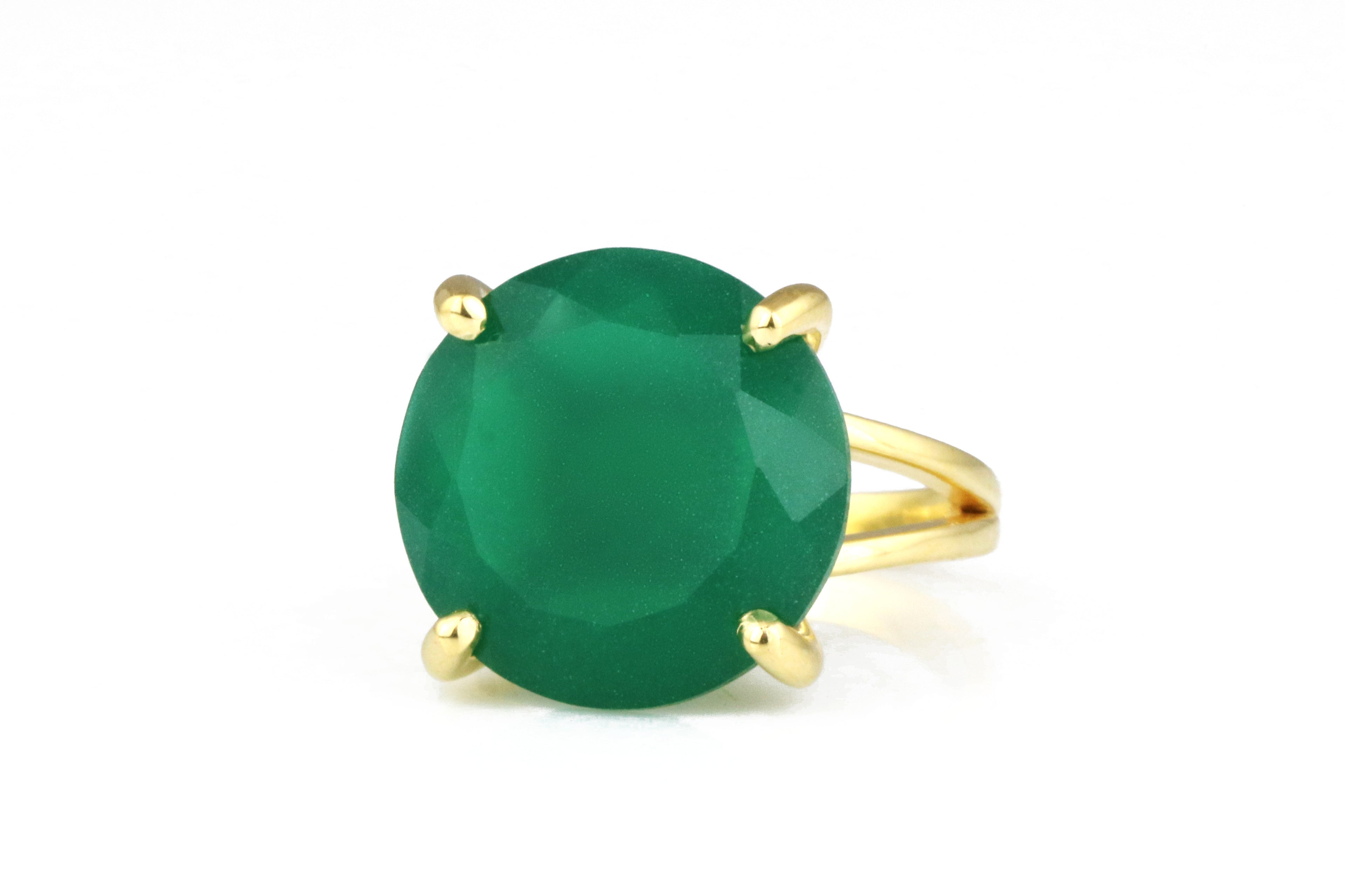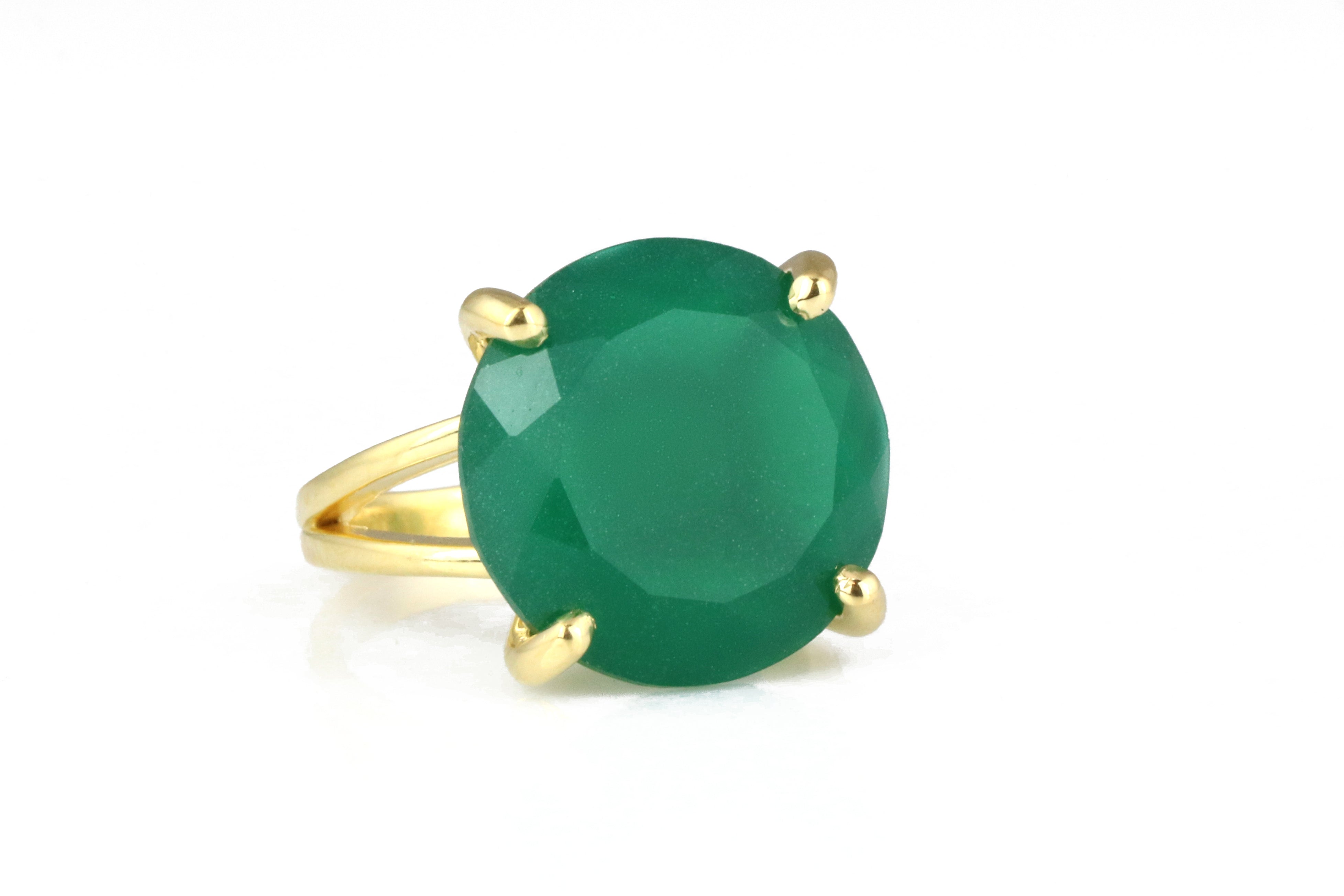 This handcrafted statement ring features a vivid green onyx gemstone set in gold for a bold yet refined look. The round faceted stone catches the light beautifully, making it perfect for everyday wear or special occasions. Each ring is handmade with care and customizable in size and metal type, offering you a truly personal piece of jewelry.