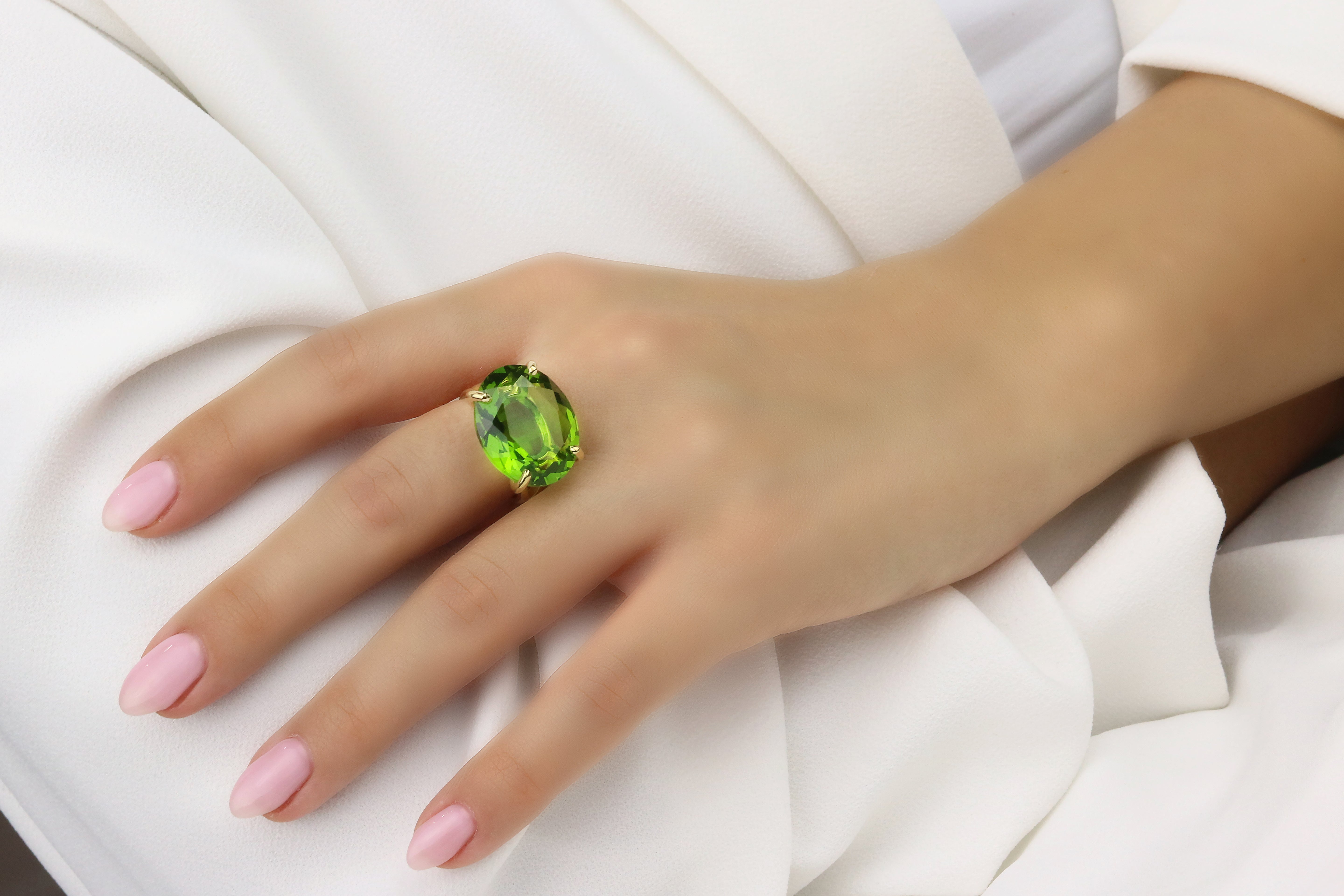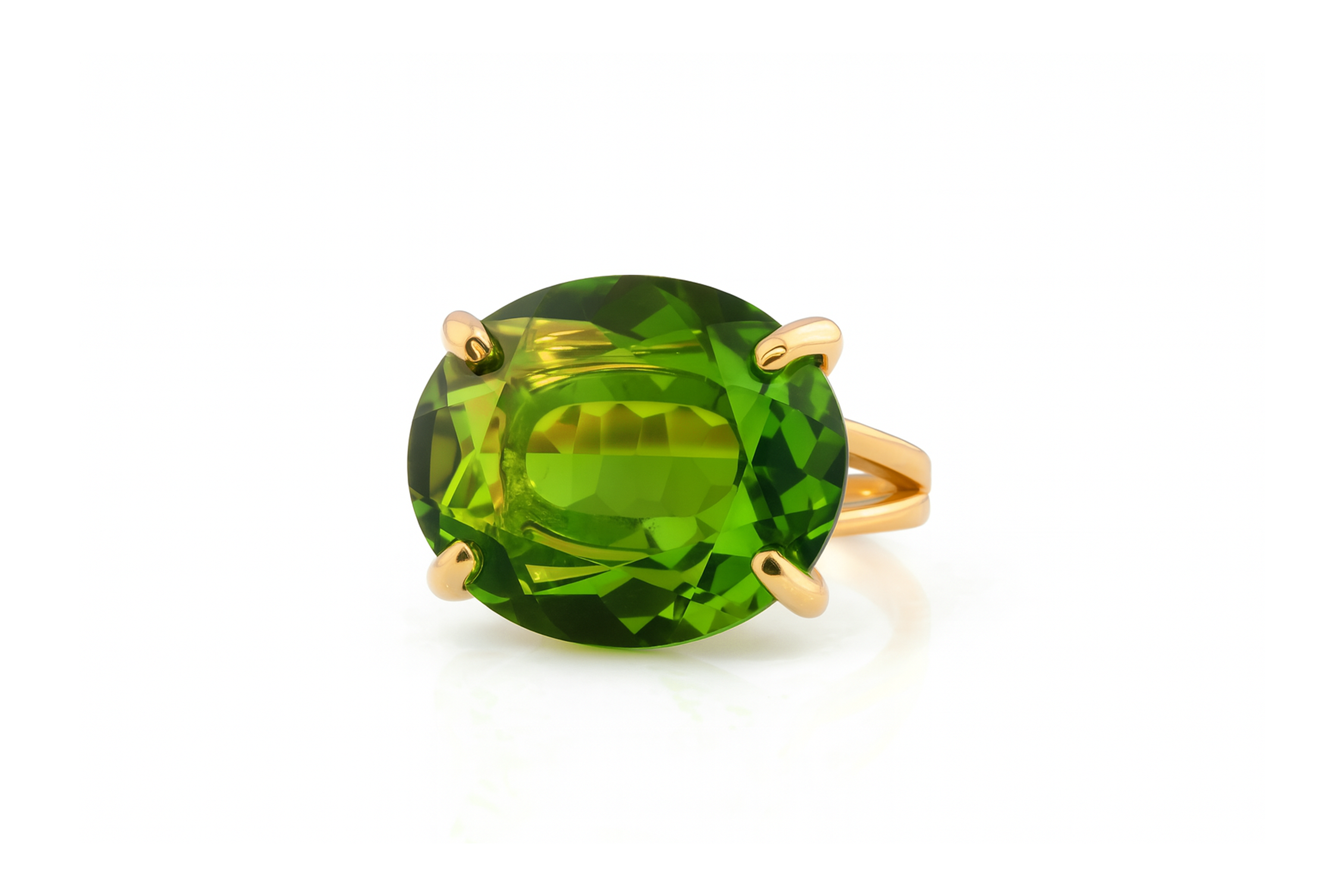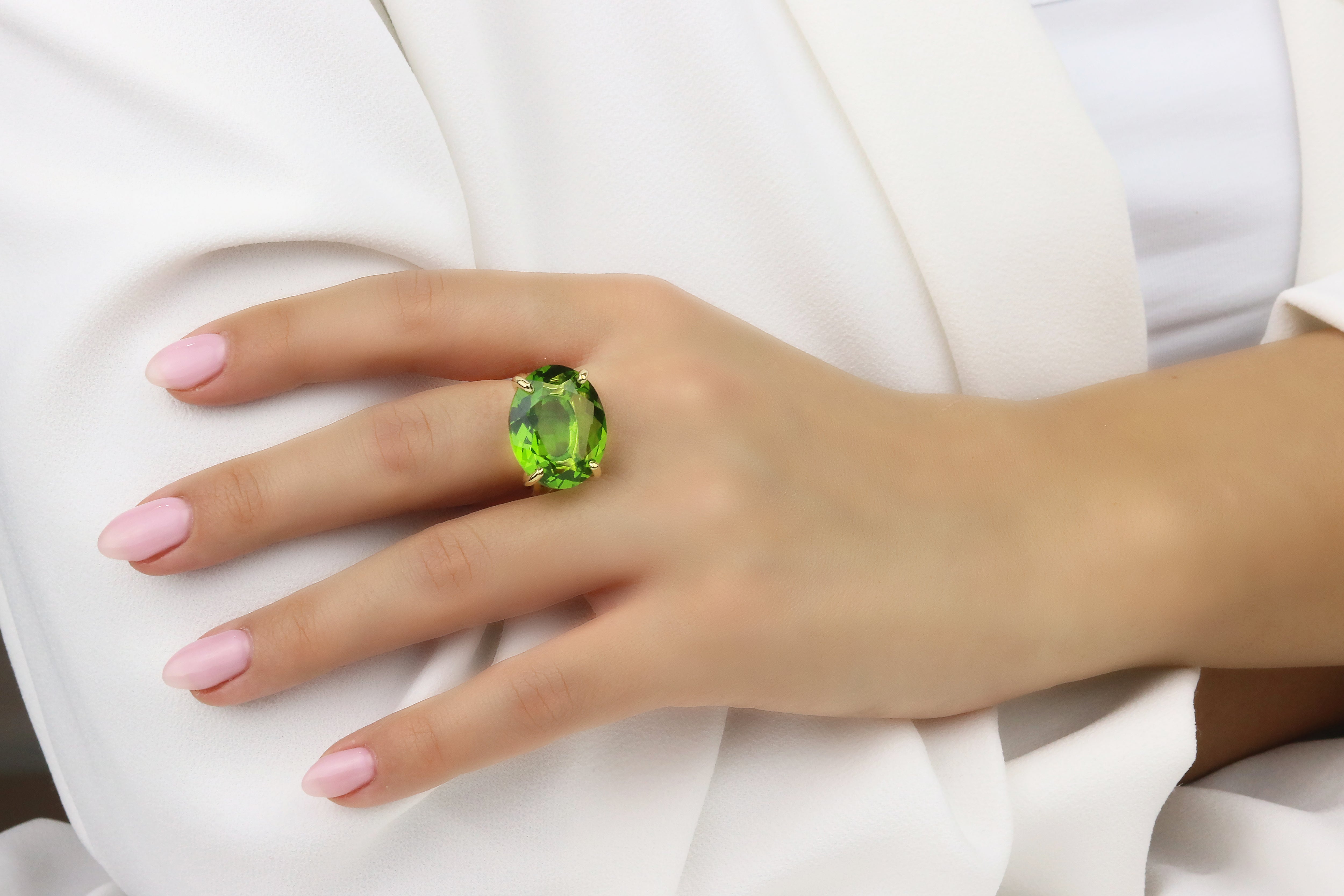 A vivid oval-cut peridot gemstone captures the essence of August’s birthstone with its glowing green hue. The faceted surface enhances light reflection, while the polished 14k gold setting brings warmth and luxury. Designed for those who love bold yet refined jewelry, this ring makes a striking statement while remaining timeless and elegant.