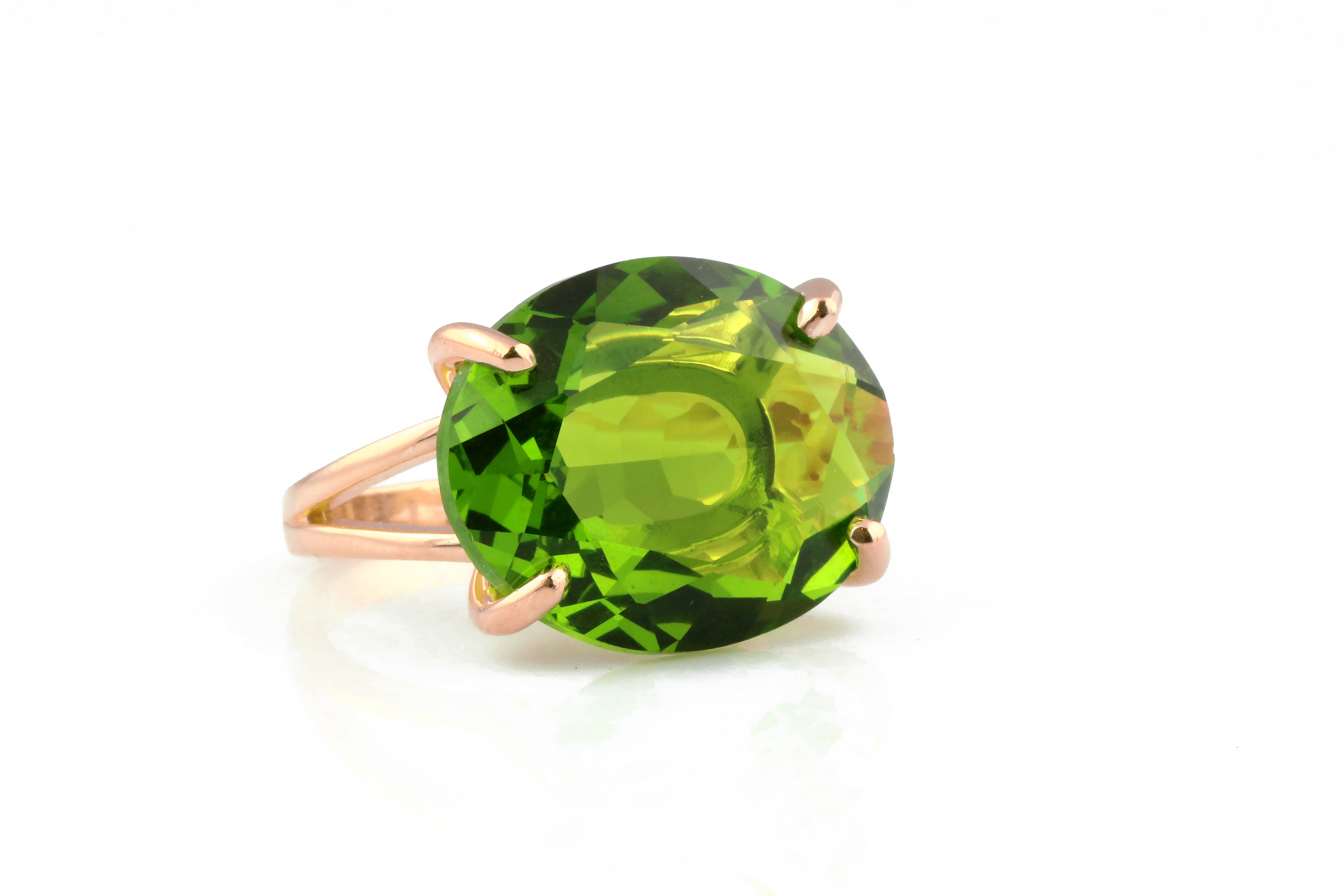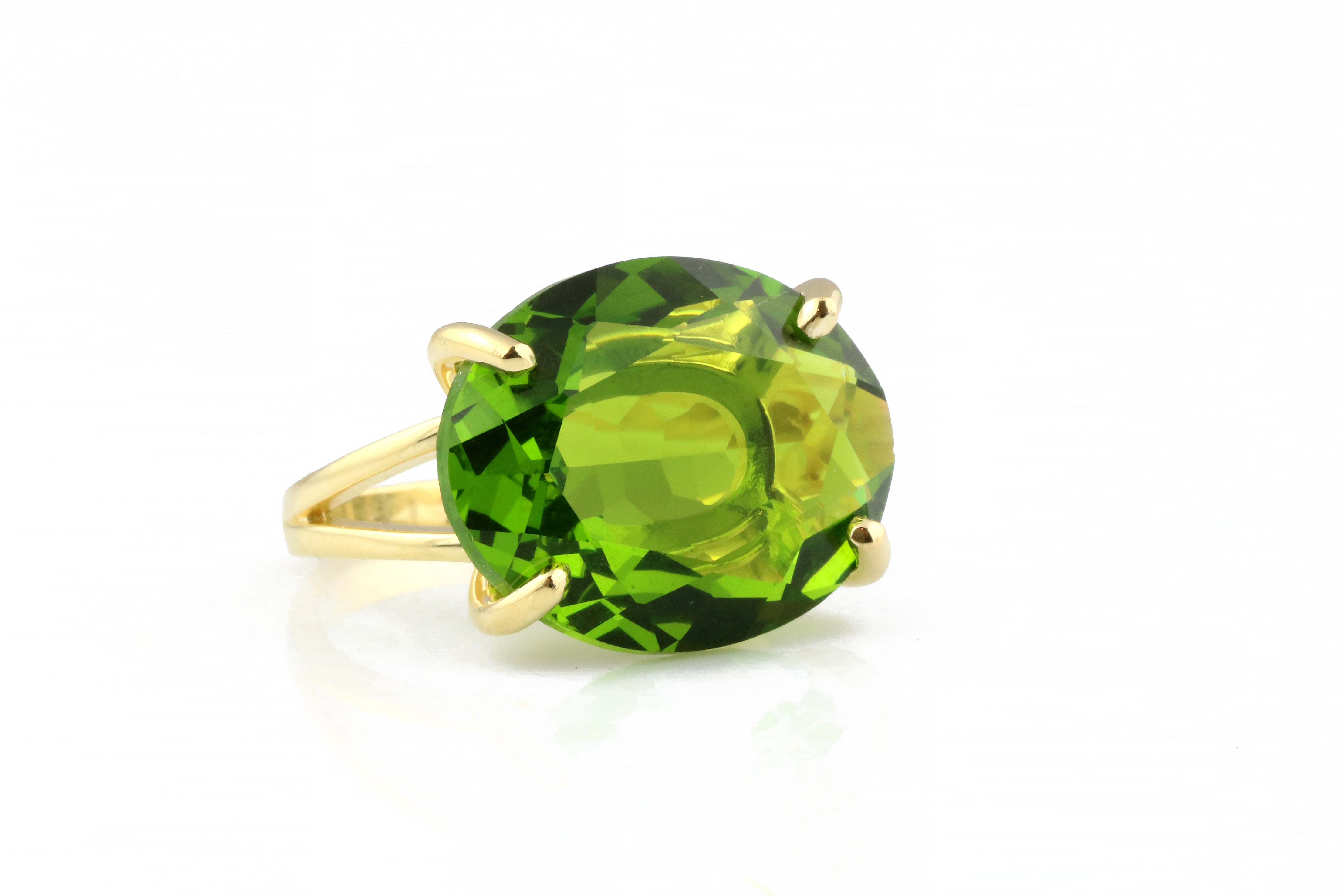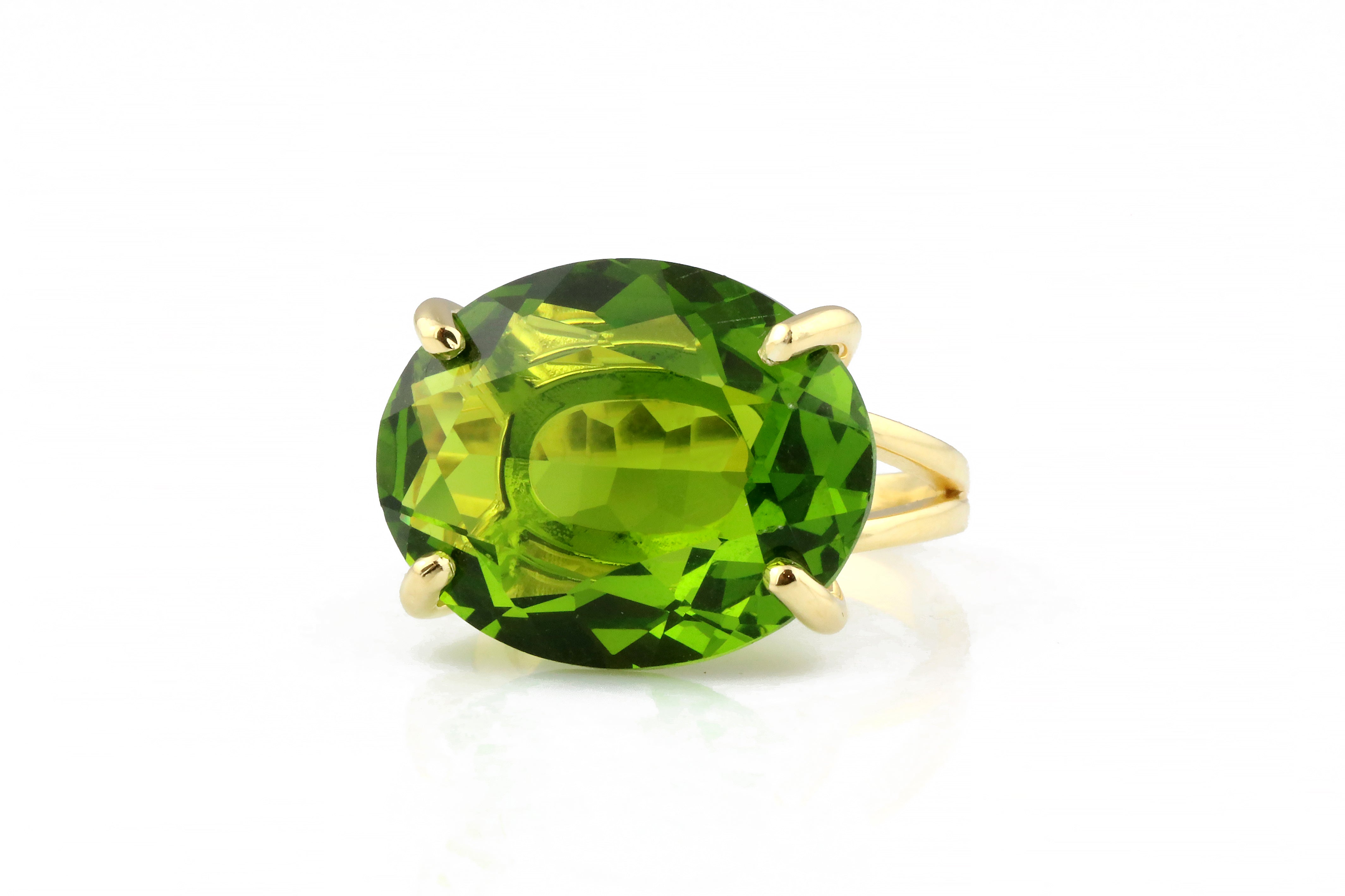 A vivid oval-cut peridot gemstone captures the essence of August’s birthstone with its glowing green hue. The faceted surface enhances light reflection, while the polished 14k gold setting brings warmth and luxury. Designed for those who love bold yet refined jewelry, this ring makes a striking statement while remaining timeless and elegant.