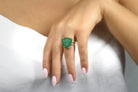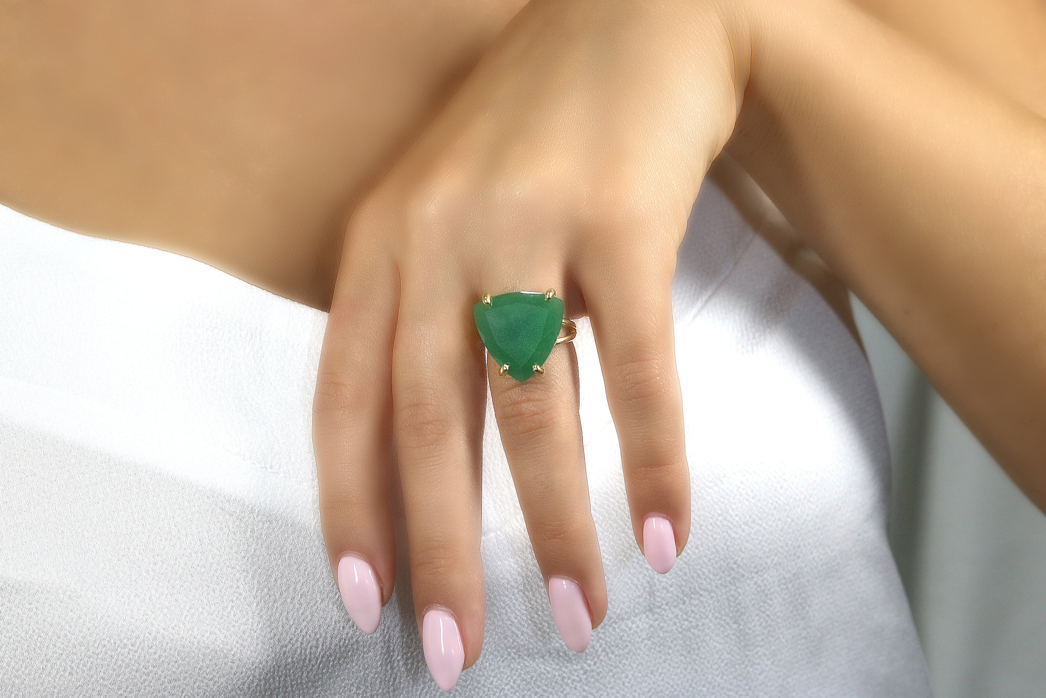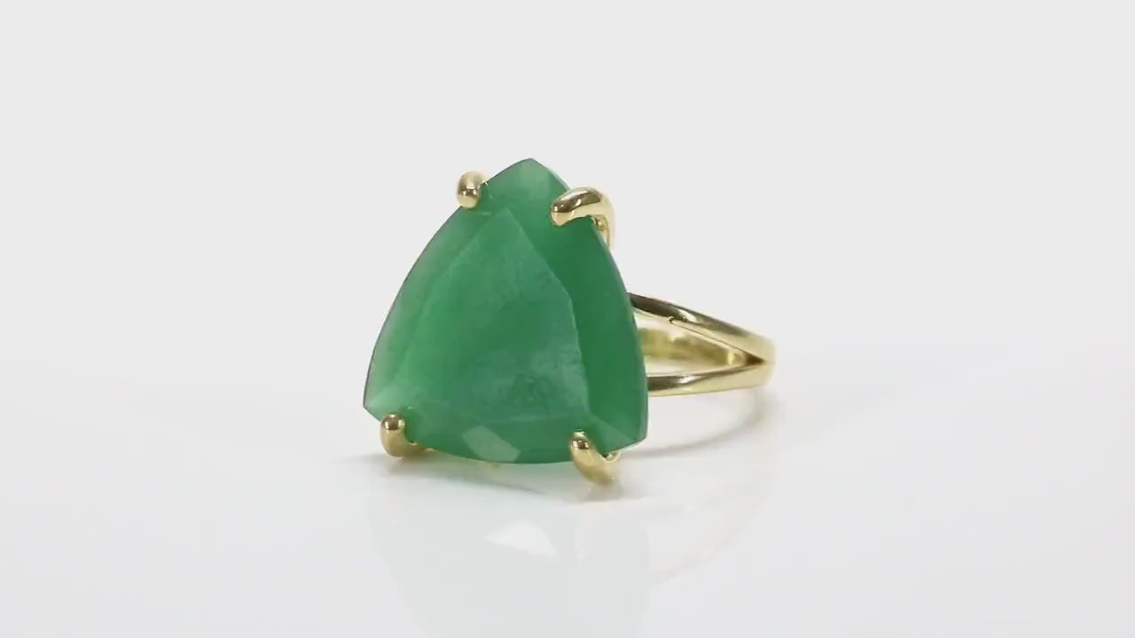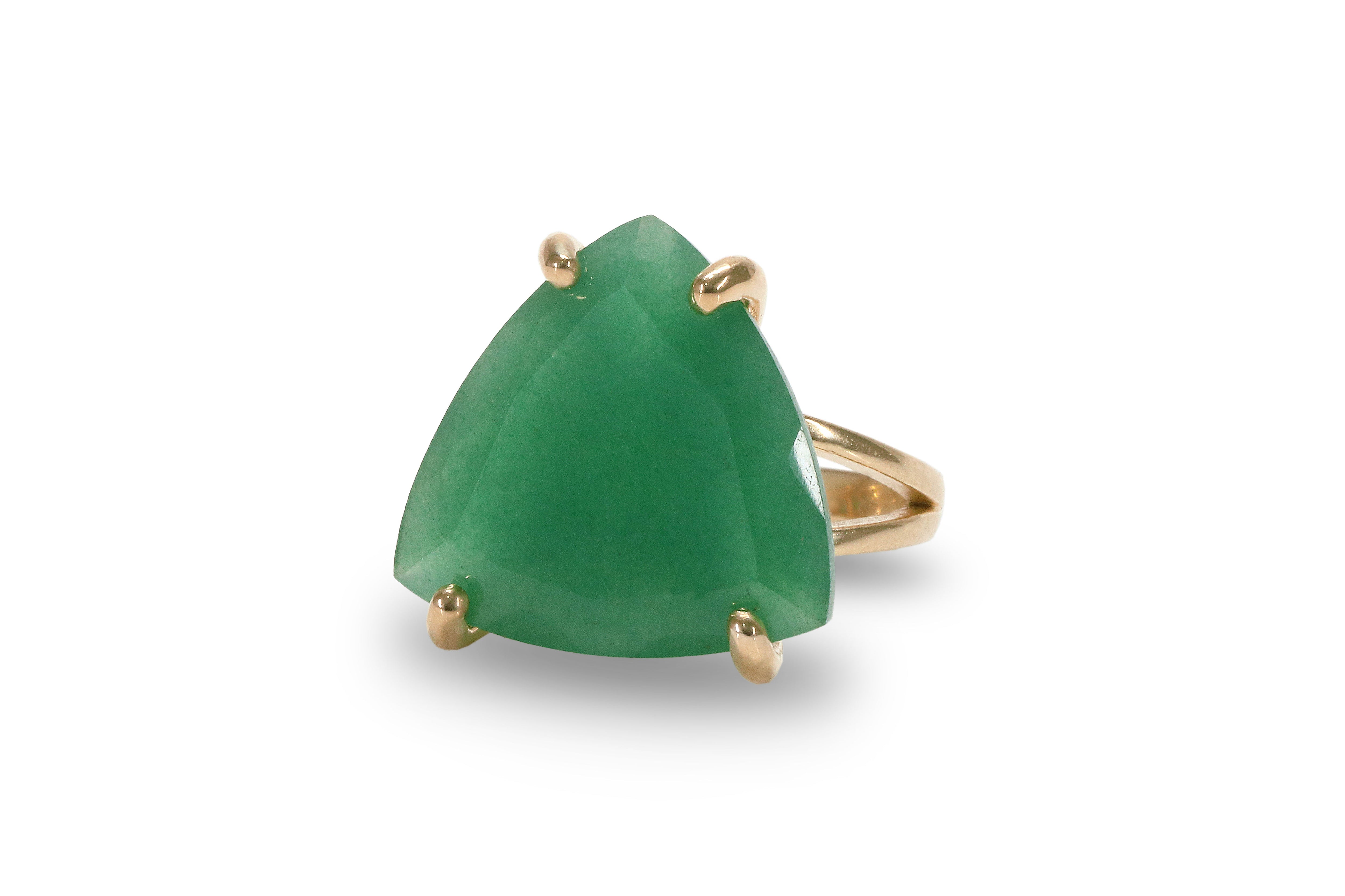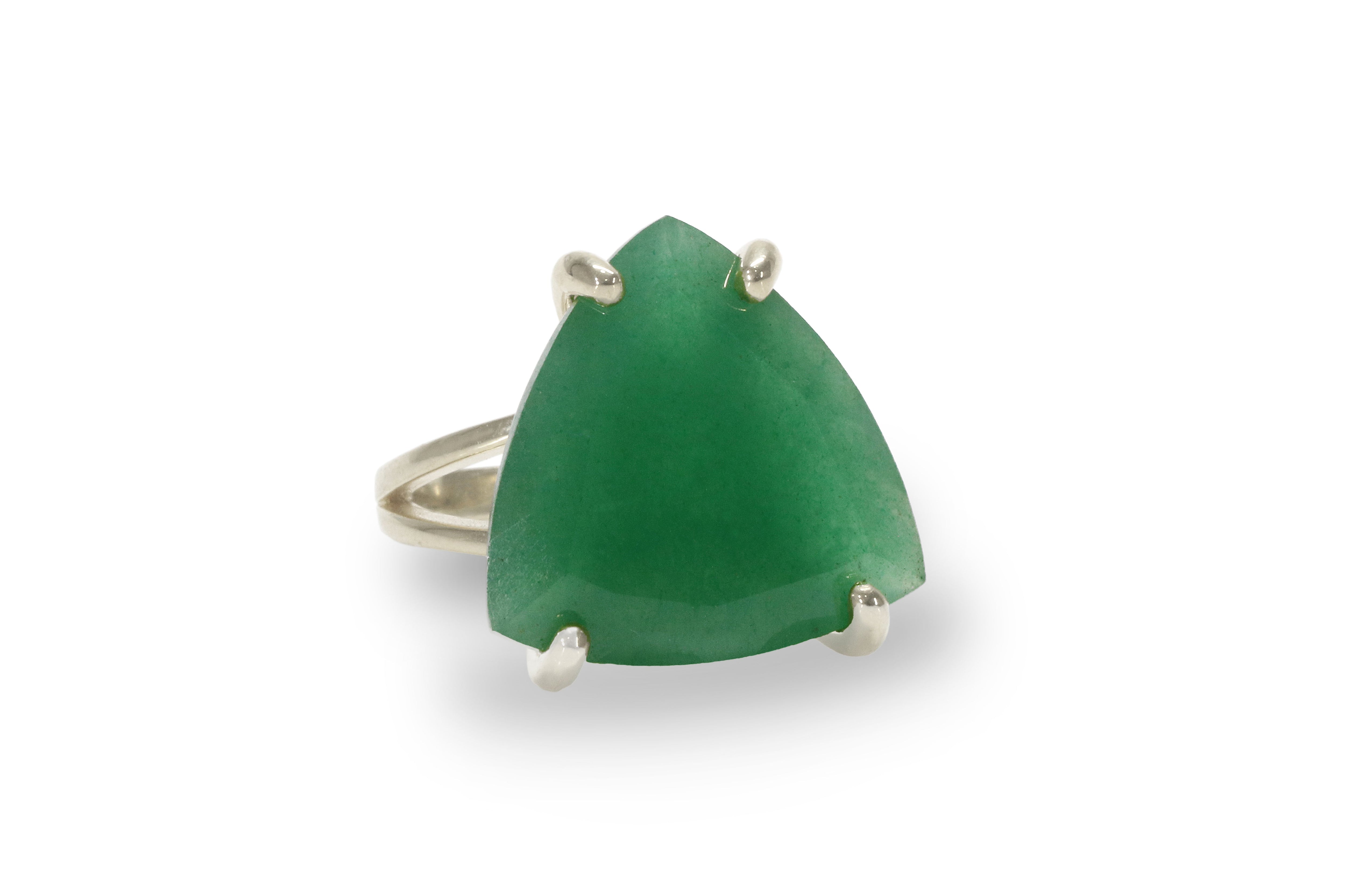 Handcrafted in 925 sterling silver, this statement ring showcases a vivid green aventurine gemstone cut in a sharp trillion shape. Its faceted surface reflects the light for a clean and modern finish that complements any style. Each ring is handmade to order and customizable in size and metal type, ensuring a personal and comfortable fit.