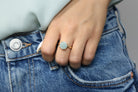 This March birthstone jewelry is an Aquamarine ring, fashioned and finished with 14k gold-filled prongs and double band. Gorgeous gem jewelry for women that highlights the stylish contrast of the blue-green stone and the yellow prongs - reminiscent of the sun hugging the horizon of the vast shores. This piece will make an exquisite gift for your loved one or a simple treat for yourself.