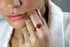 Style and delicate elegance beautifully come together in this Ruby ring. A charming choice for a promise ring, engagement or gift jewelry for special occasions. Bring a lovely lady a piece of happiness and dainty vibrance she can wear everyday.