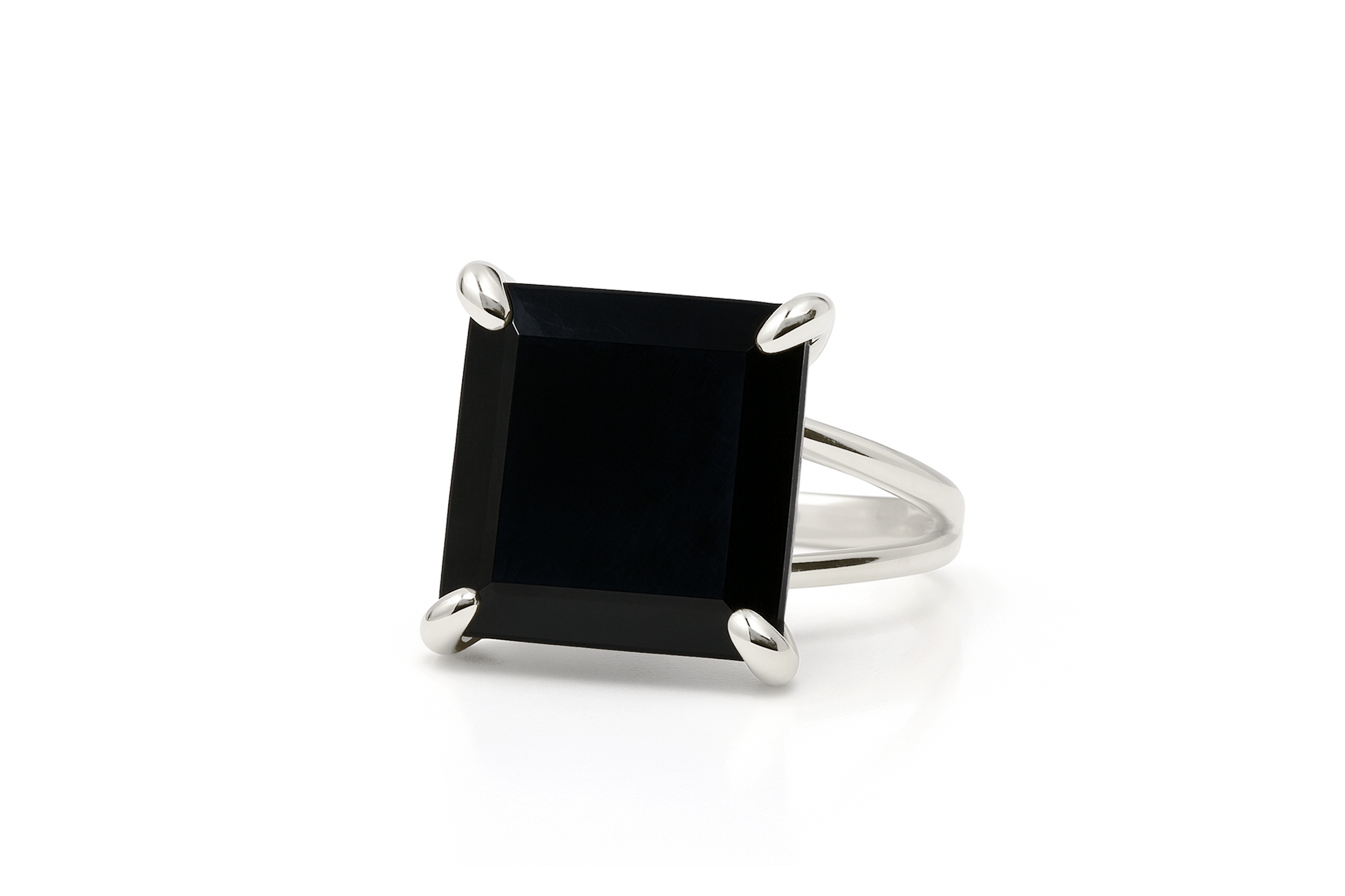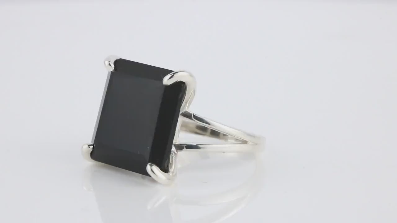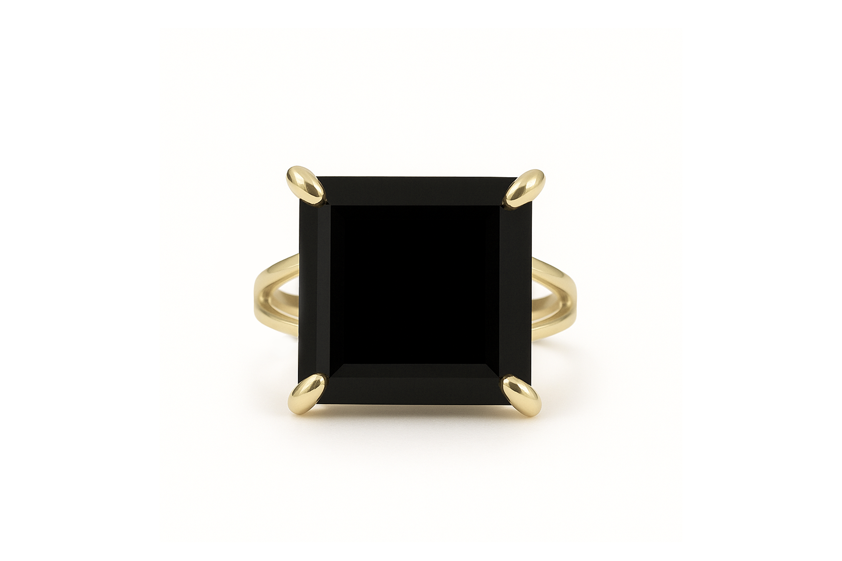 This black onyx ring features a bold square-cut gemstone set in a polished gold prong design with a double band. The deep black tones of onyx create a striking contrast against gold, making it a modern statement ring. Designed for women who appreciate bold gemstone jewelry, this piece is both durable and stylish. Handcrafted with care, it’s ideal as a cocktail ring, a fashion accessory, or a meaningful gift.