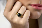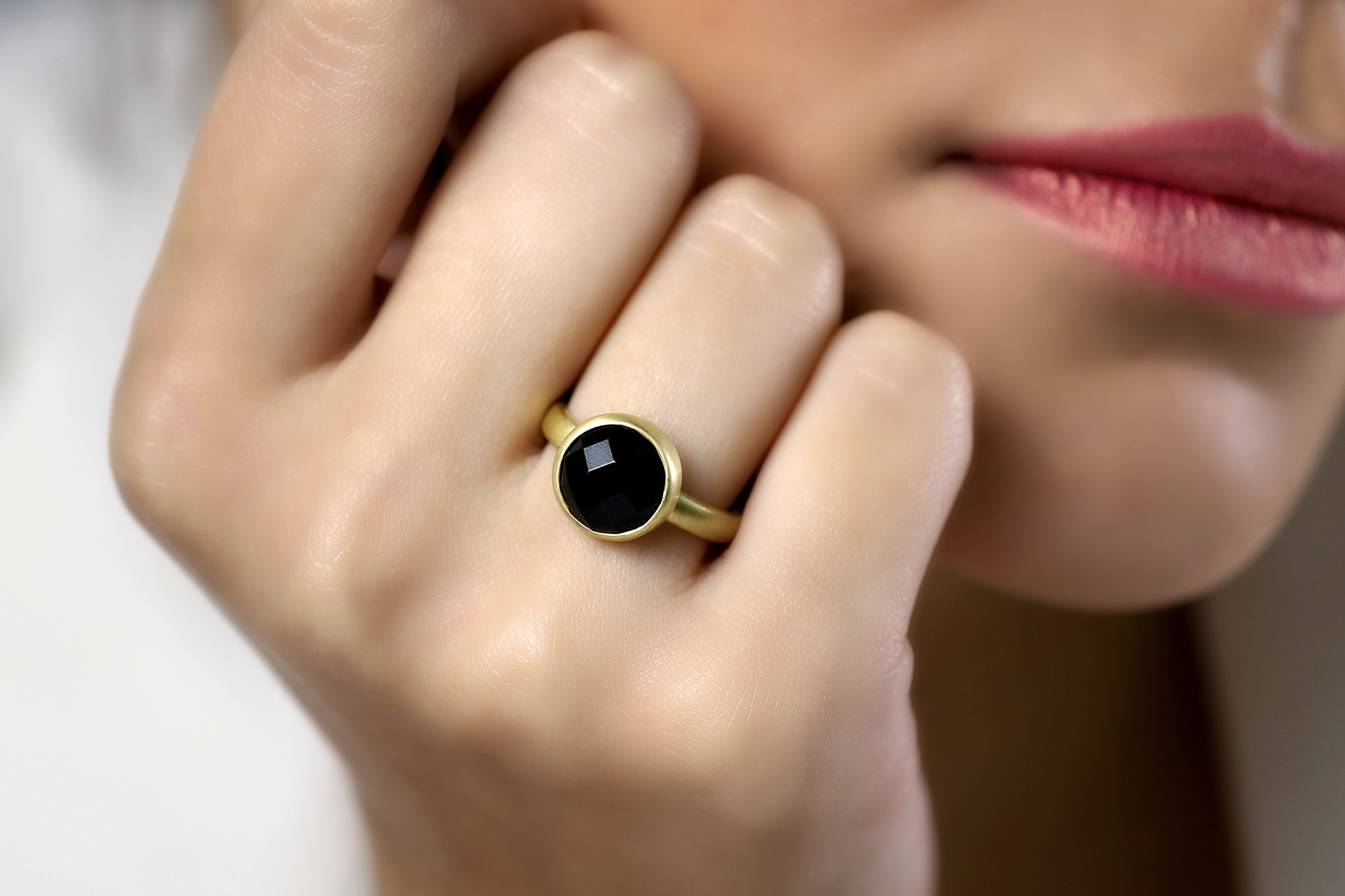 Embrace the elegance of simplicity with our Black Onyx Round Bezel Ring in 18k Gold Vermeil. This exquisite ring features a delicate 10mm faceted black onyx, known for its captivating reflections and protective qualities. Set in a sleek single band of gold vermeil, it's perfect for stacking or solo wear. The harmonious blend of black and gold makes it a versatile piece for everyday elegance and a subtle statement for any occasion.