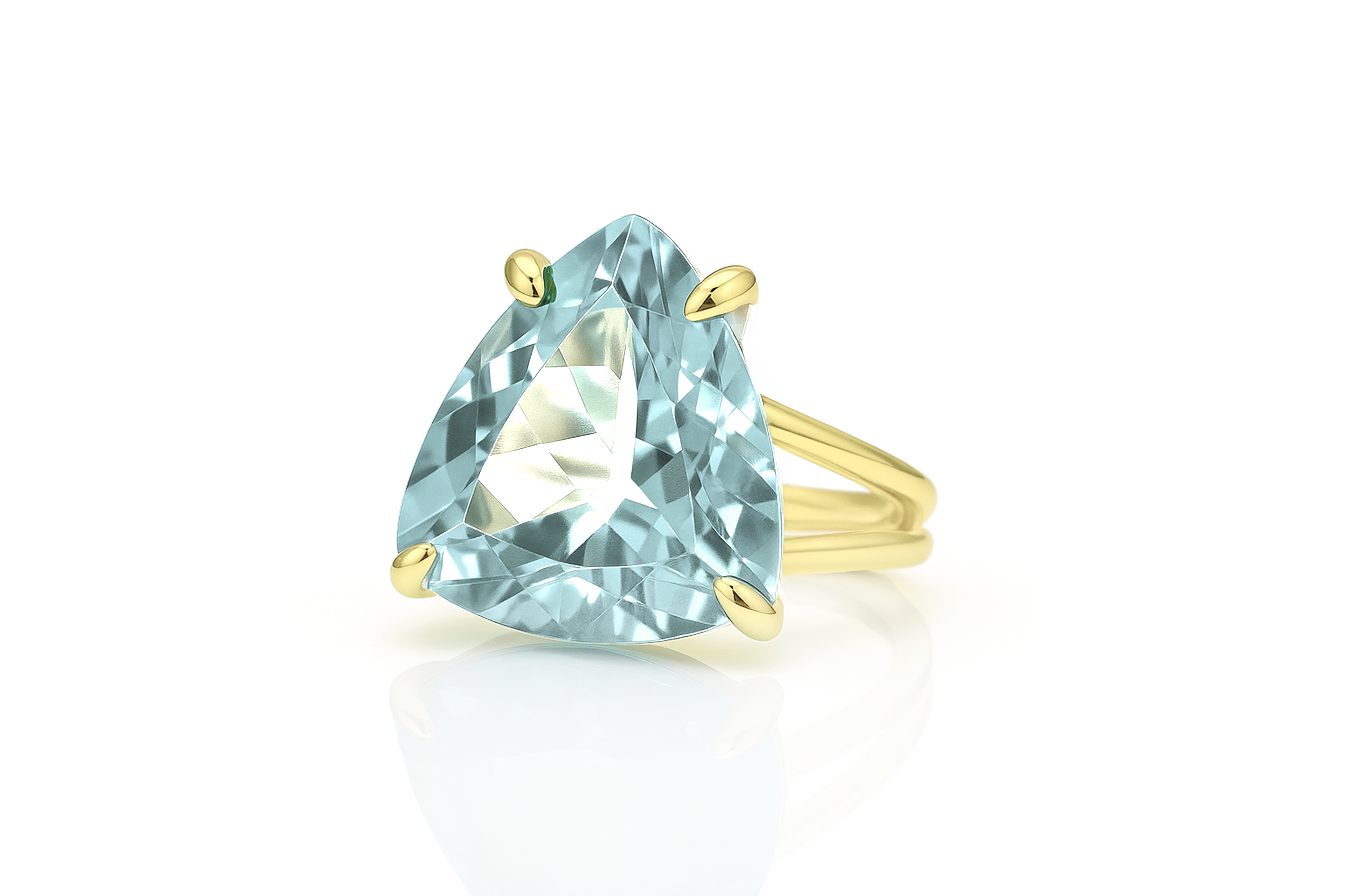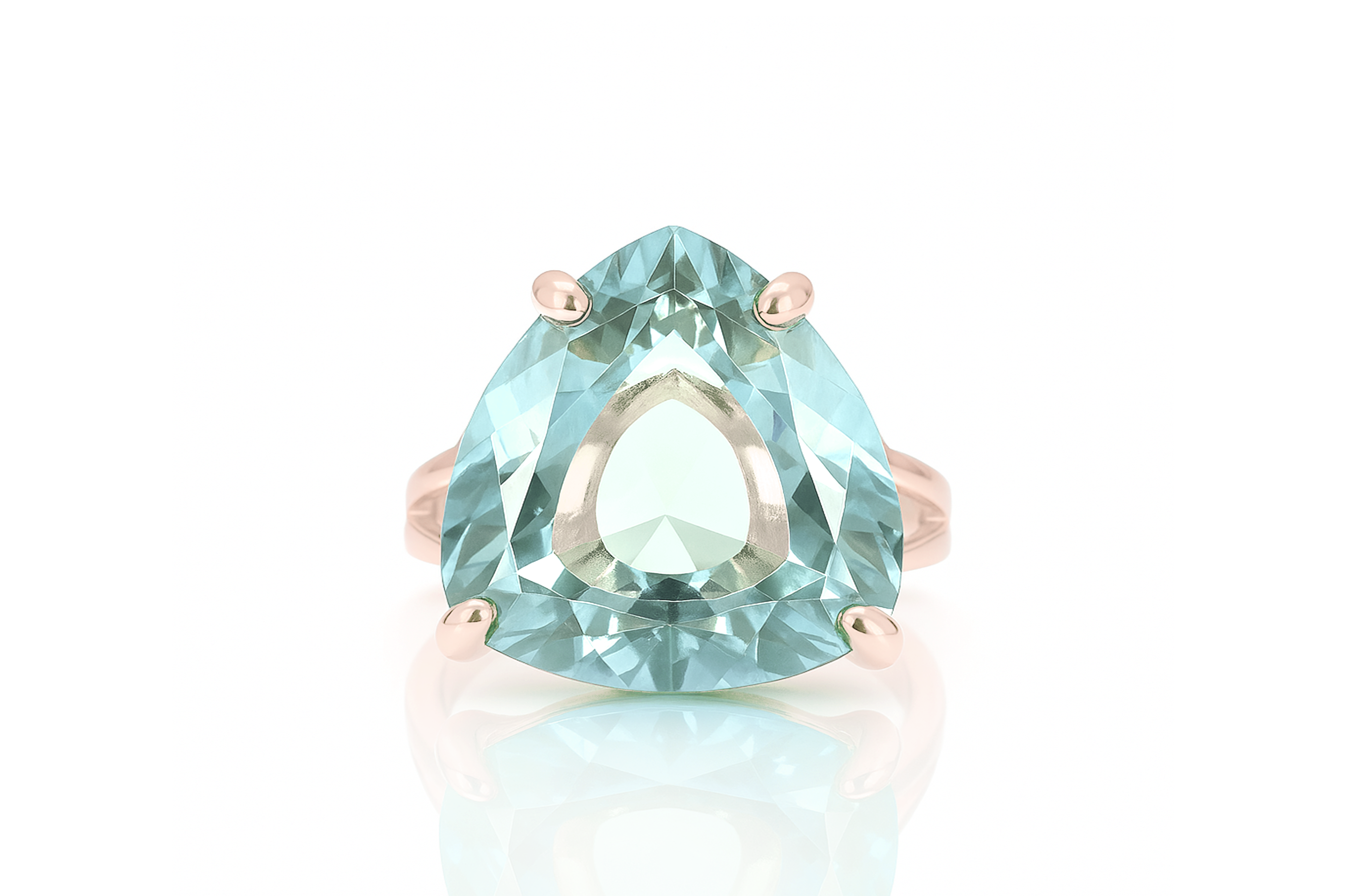 This exquisite rose gold blue topaz ring showcases a stunning trillion-cut gemstone that sparkles with icy blue brilliance. Set in 14k rose gold with a sleek double band, it blends contemporary design with timeless beauty. A perfect handcrafted statement piece and an elegant October birthstone gift.