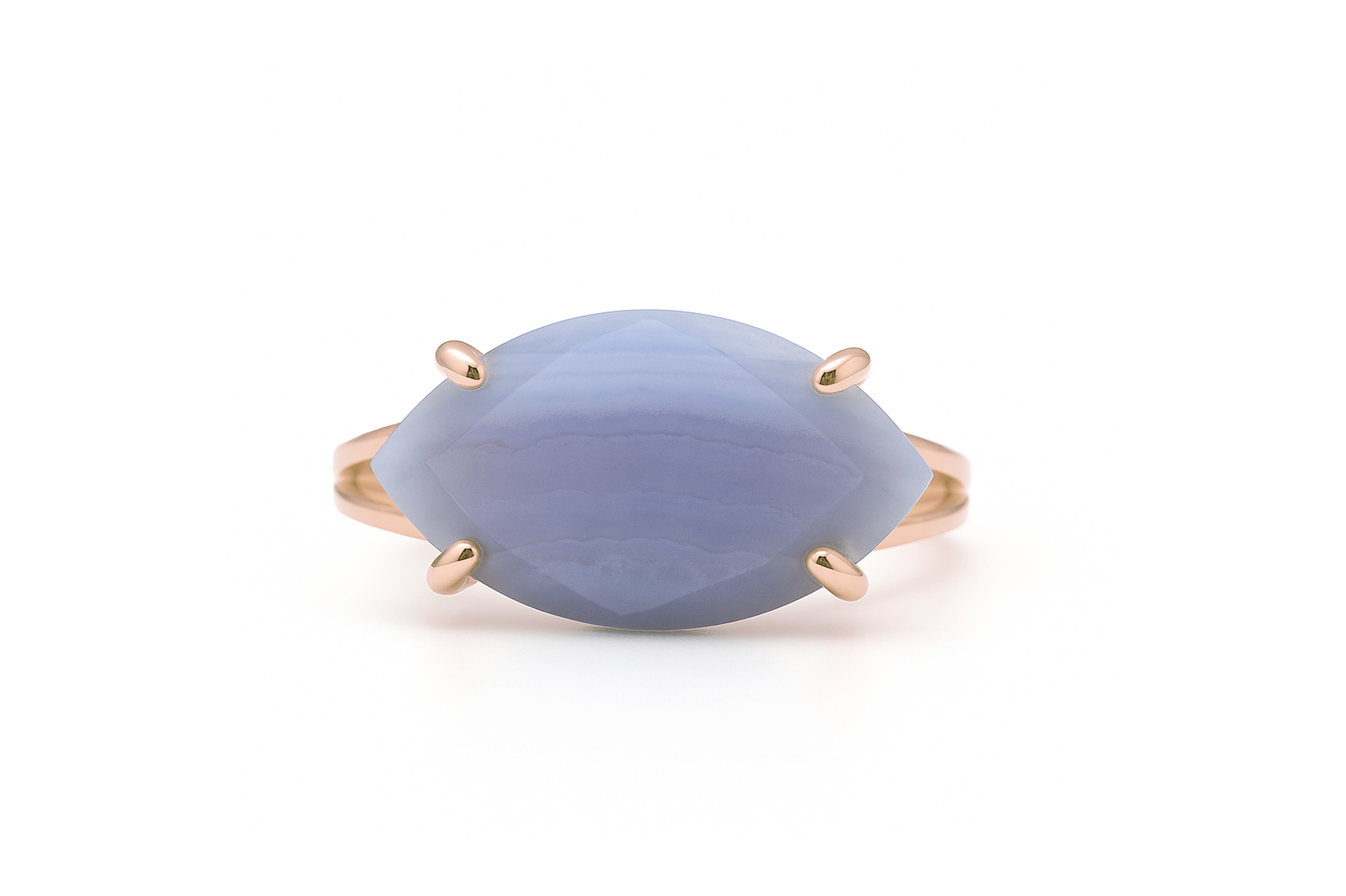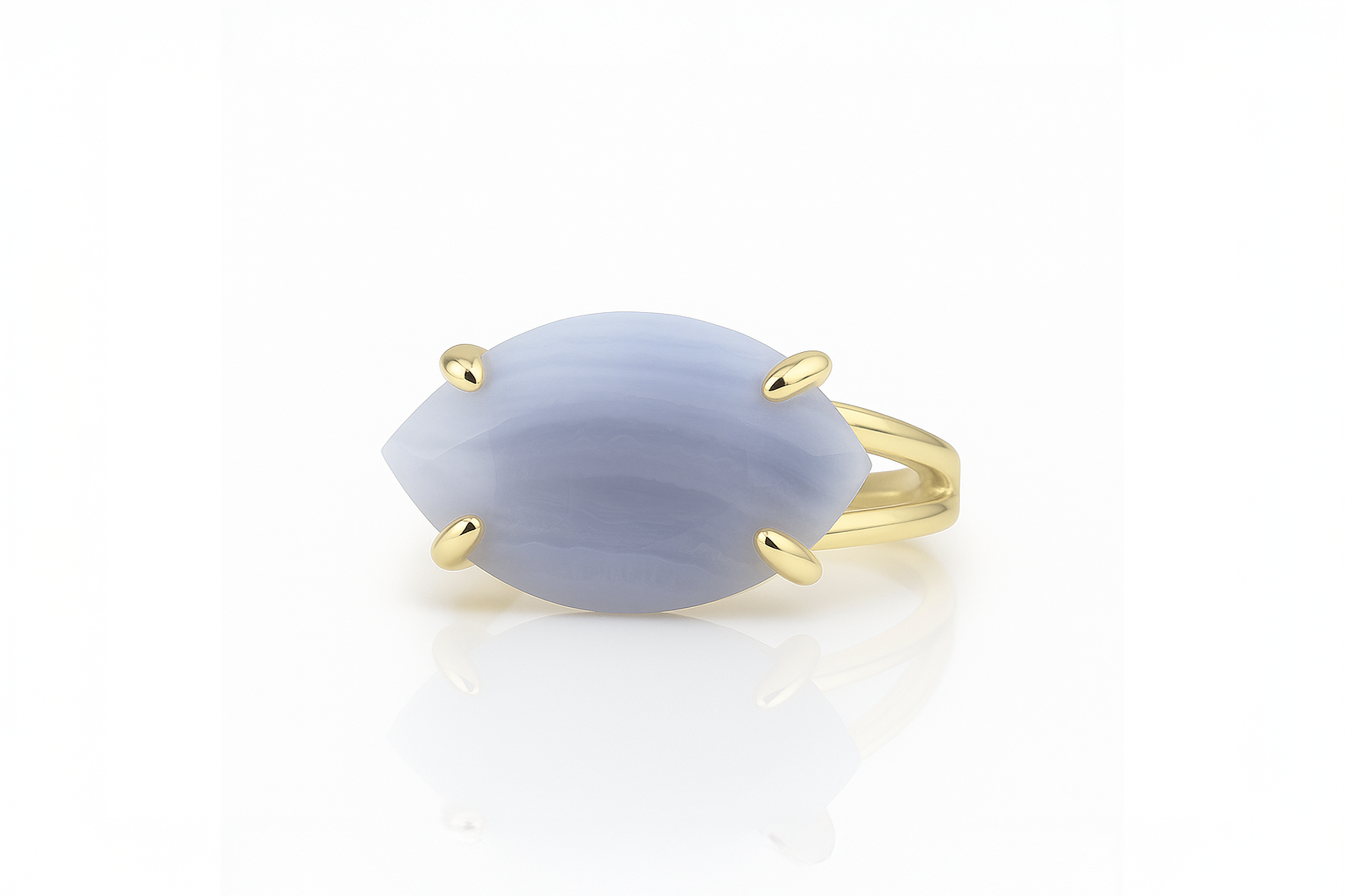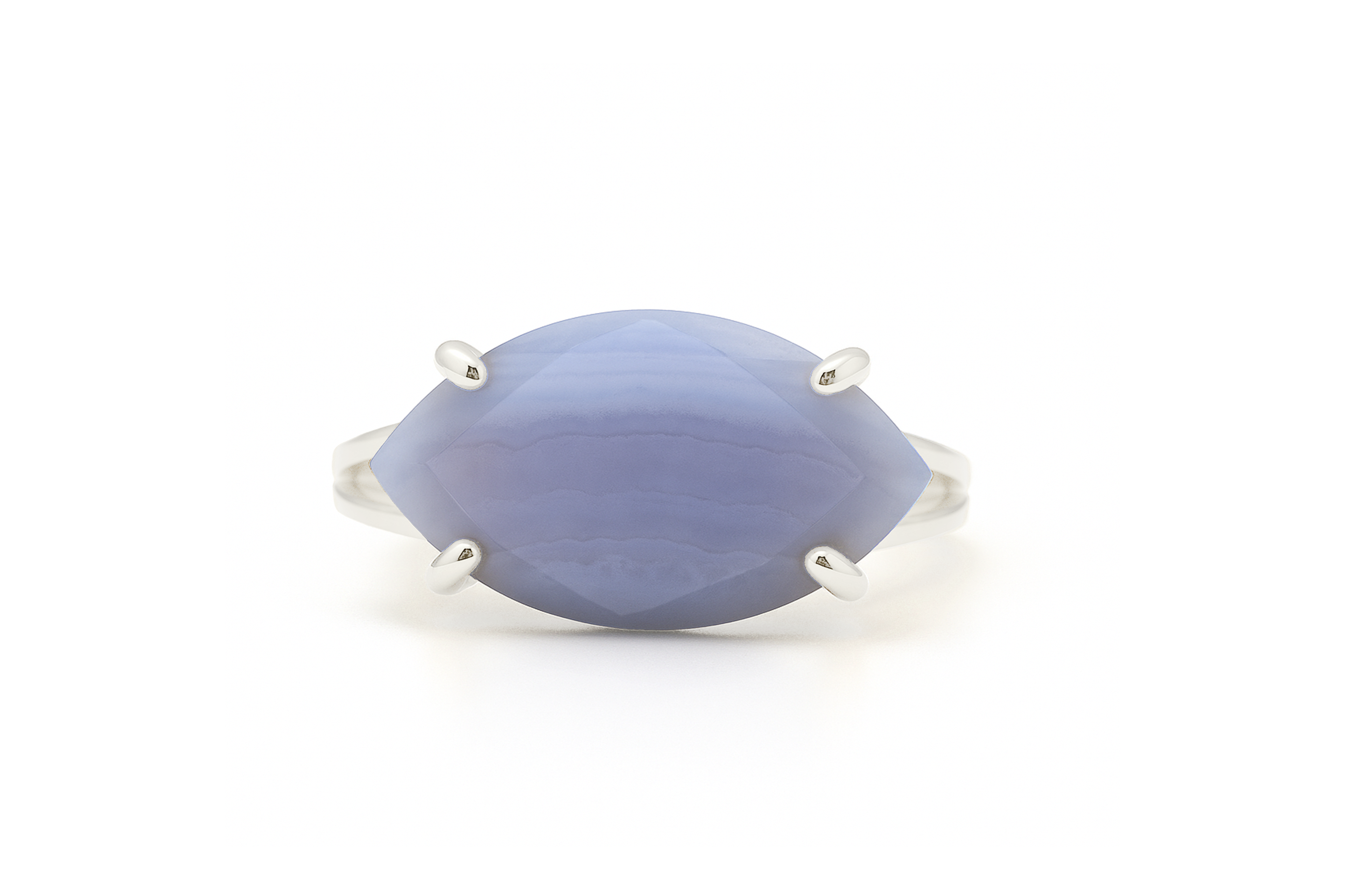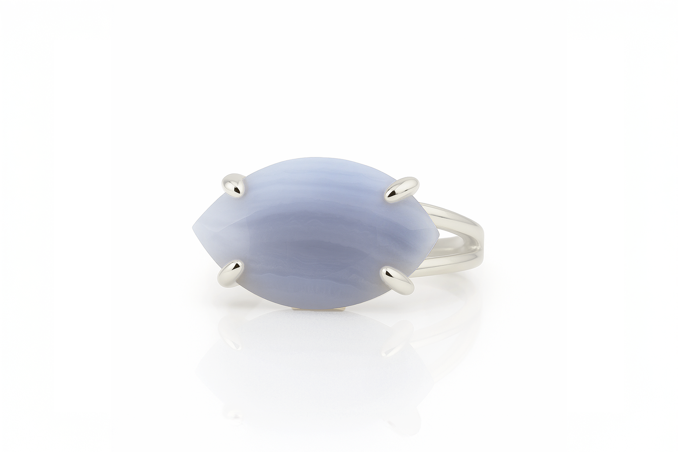 This blue lace agate ring features a large marquise-cut natural gemstone set in a polished sterling silver band. Known for its calming bands and soft blue tones, lace agate is cherished as a stone of balance and clarity. With its bold silhouette and 925 silver setting, this ring is both elegant and versatile. Handmade with care, it’s a meaningful natural gem ring, perfect as a statement piece or as a thoughtful gift for mom.