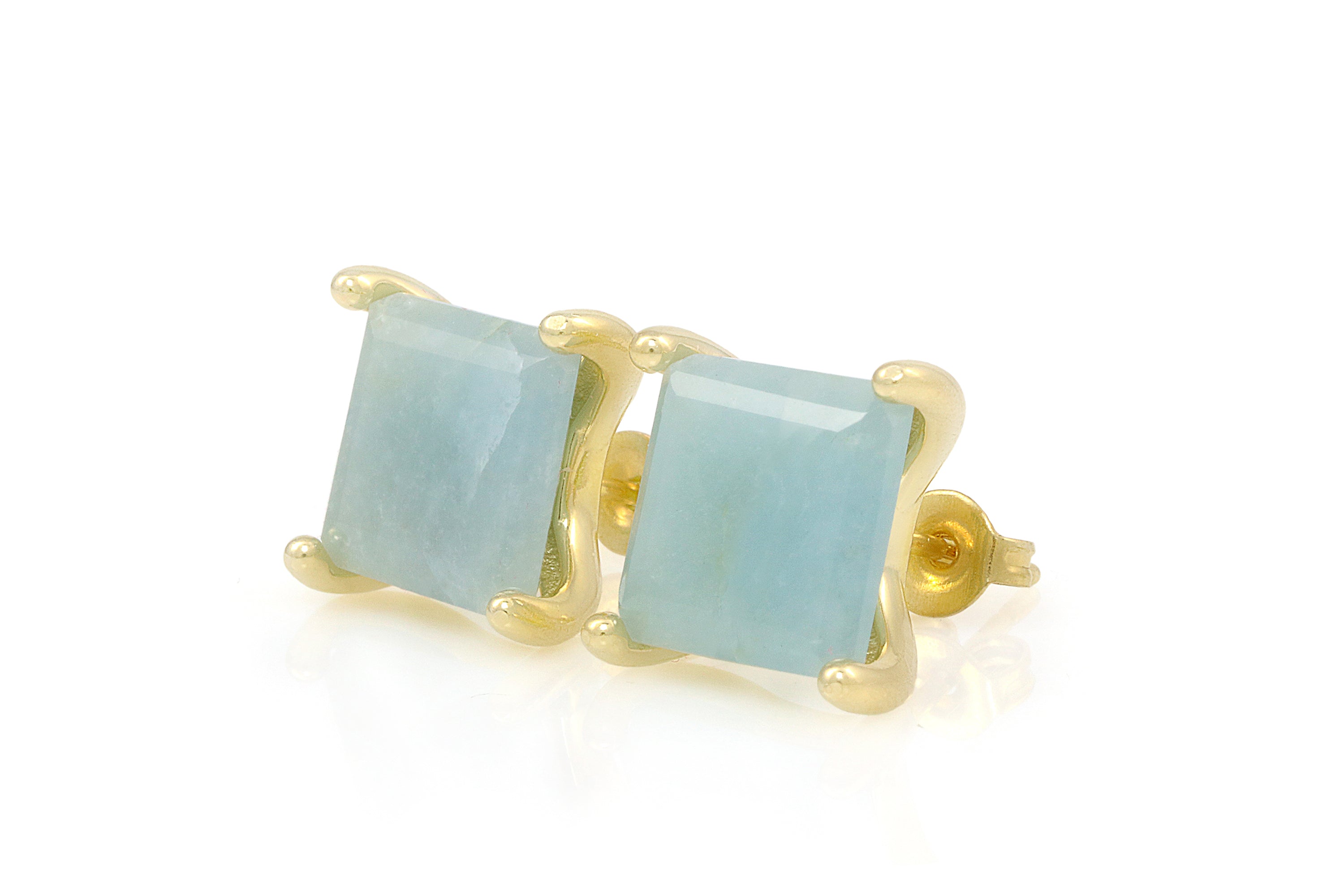 A decorative pair of jewelry earrings boasting square-cut natural Aquamarine stones set in prongs and studs. These Aquamarine jewelry pieces are great starter pieces or an addition to your vast collection. A pair of March birthstone earrings for every collector’s dream.