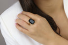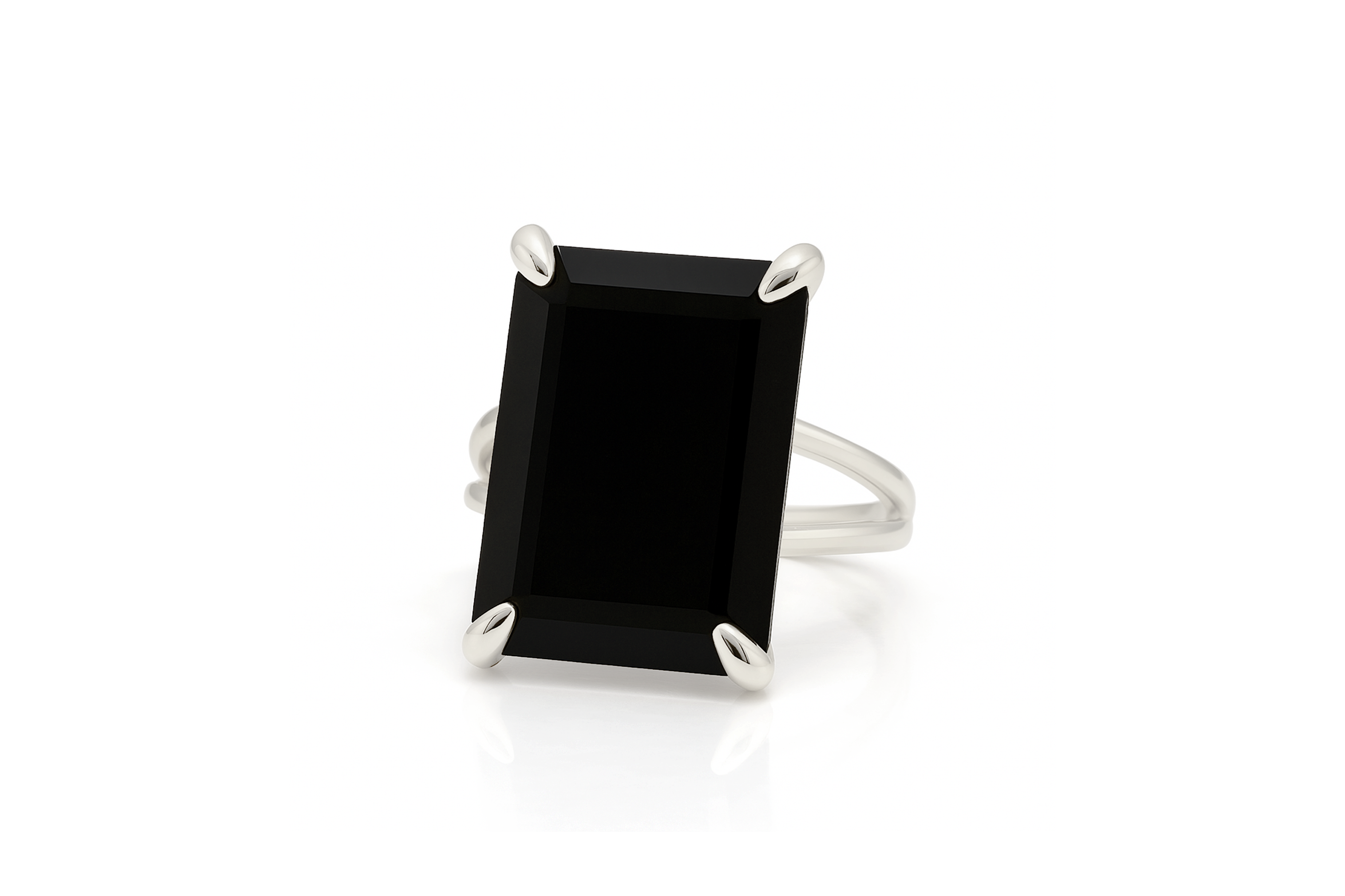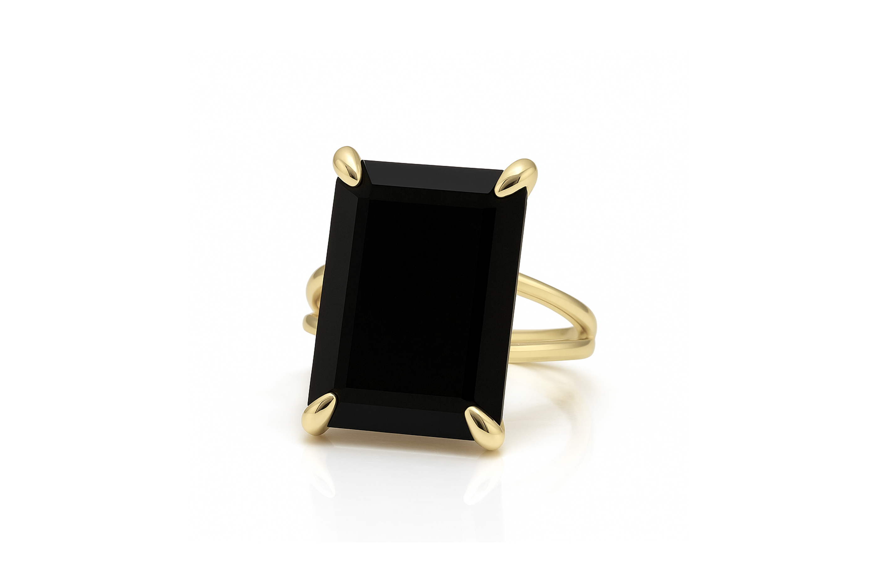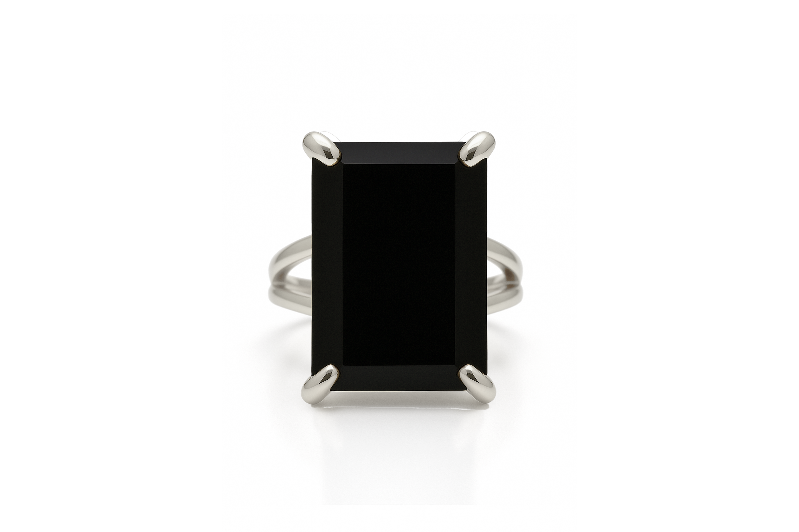 This sterling silver ring showcases a rectangular-cut black onyx gemstone set in a polished silver band. The sleek, modern design highlights the deep black tones of natural onyx, known for strength and balance. Perfect as a cocktail ring or an everyday piece, this handmade gemstone ring offers timeless style and versatility. Crafted with care, it’s a meaningful gift or a lasting addition to any jewelry collection.