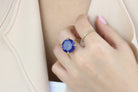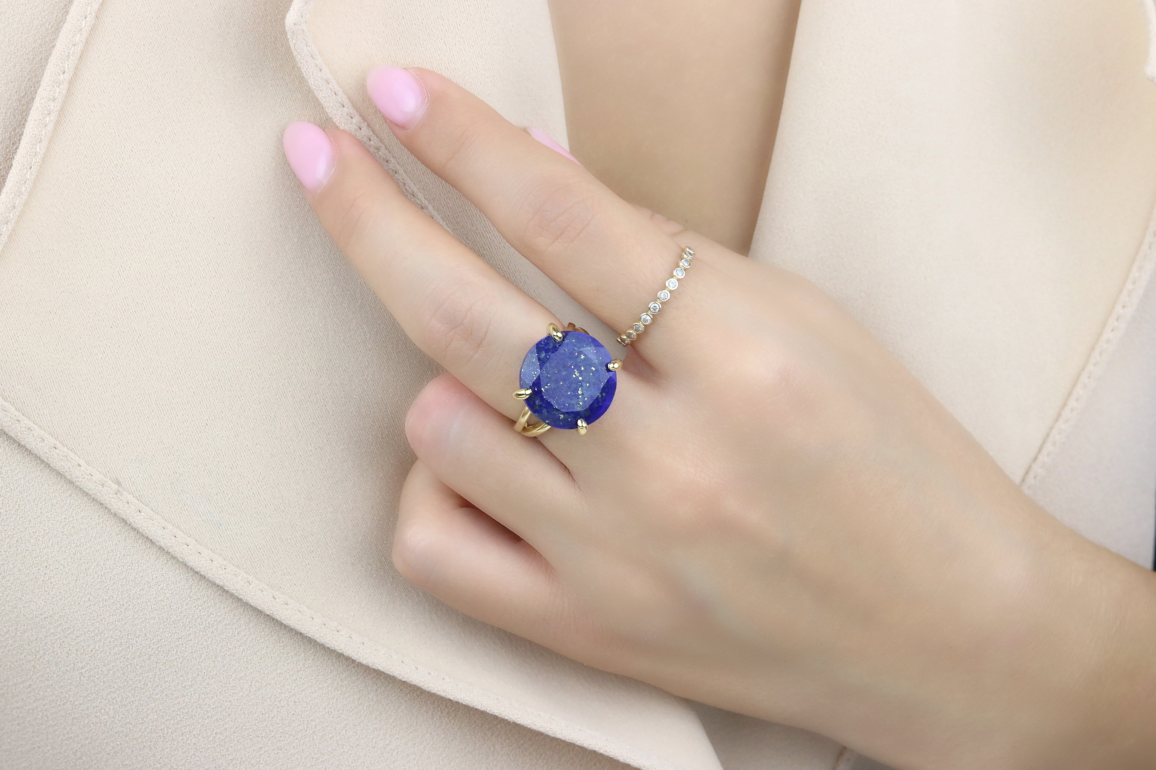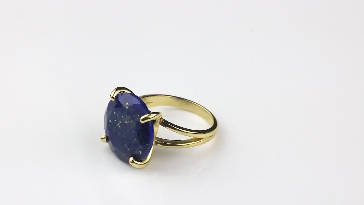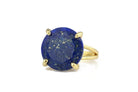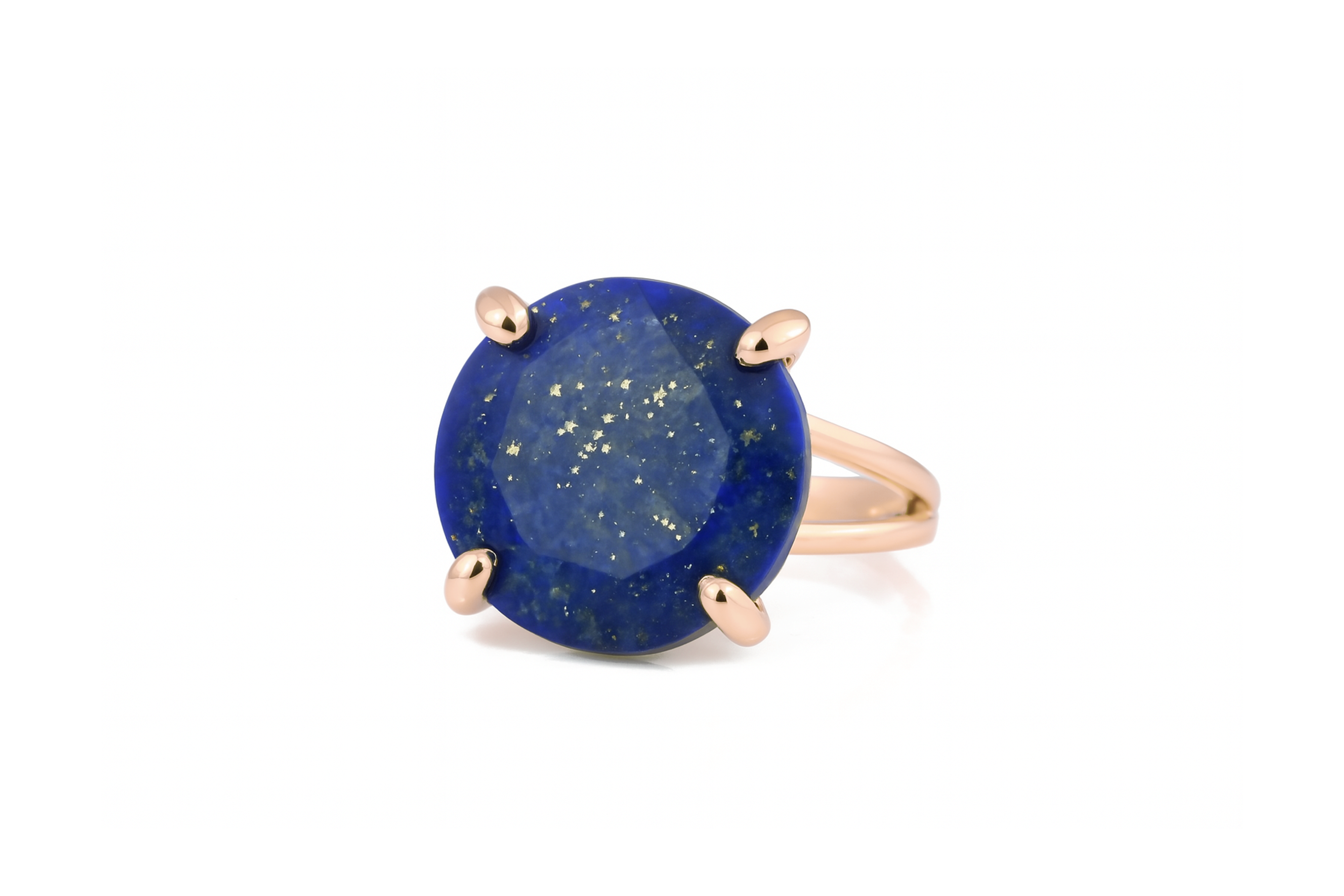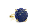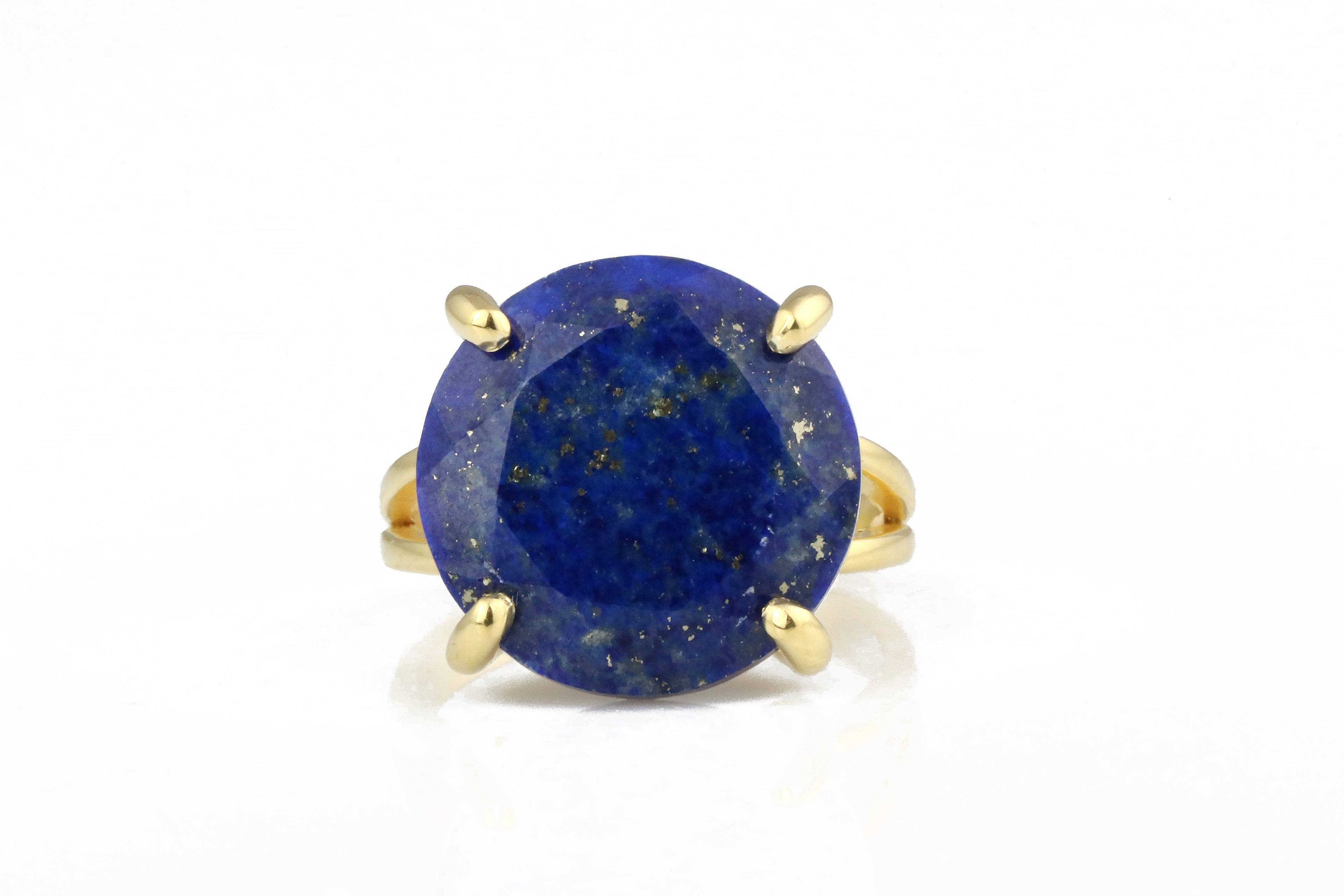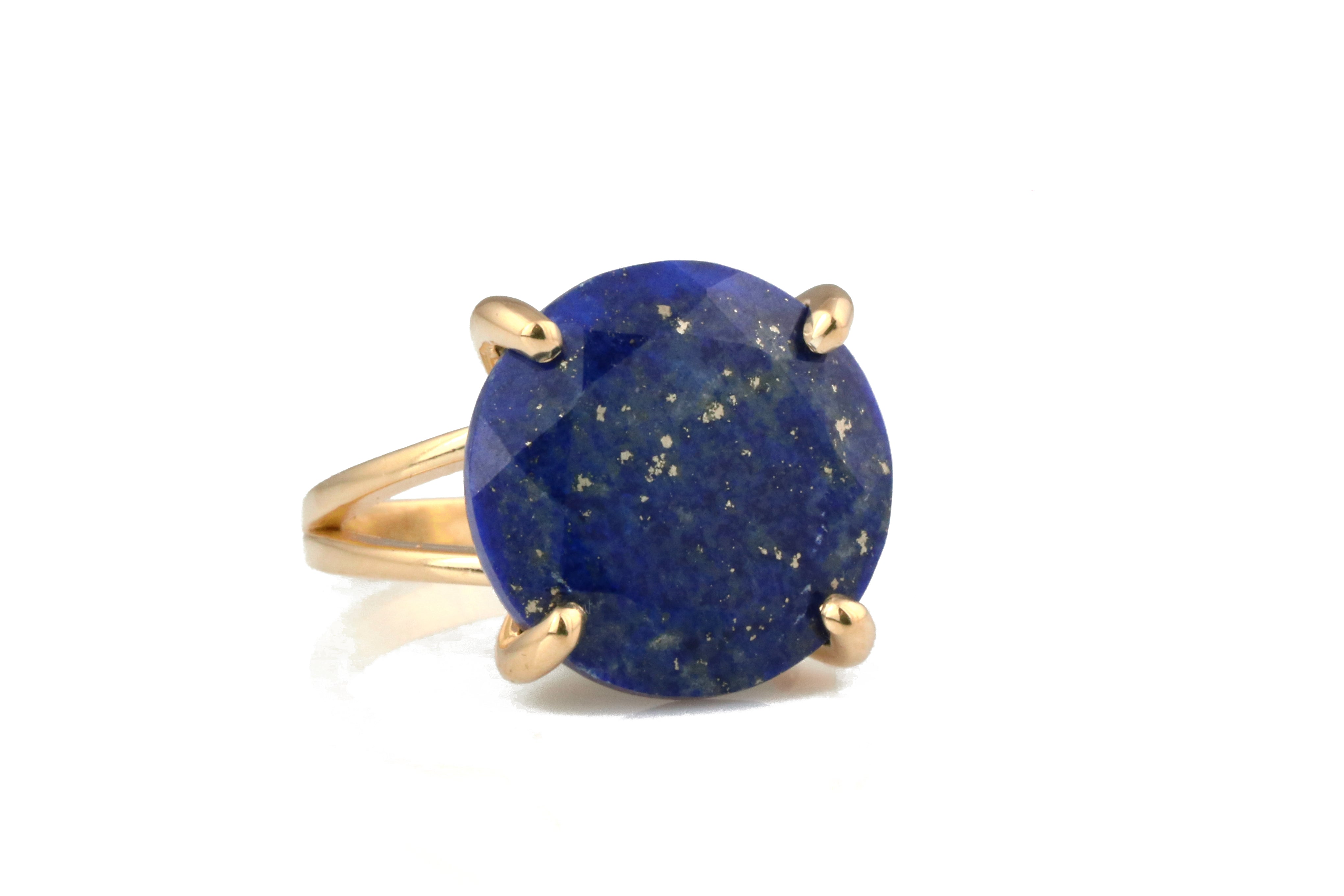 This handcrafted gold ring features a genuine lapis lazuli gemstone with golden flecks that shimmer beneath the surface. The round faceted cut enhances the natural depth of the stone, while the gold setting adds warmth and contrast to its rich blue hue. Each ring is made to order with customizable metal and sizing options, creating a truly personal piece.