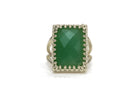 A beautiful jewelry ring that boasts a stunning 18x13mm Green Aventurine gemstone set in a artistically designed double ring band made of Sterling Silver or 14k Gold. This gemstone ring can be worn as a fashion jewelry or an accessory with a purpose. Aventurines are stones known to bring luck to wealth and prosperity. Can be worn by itself or with other casual rings.