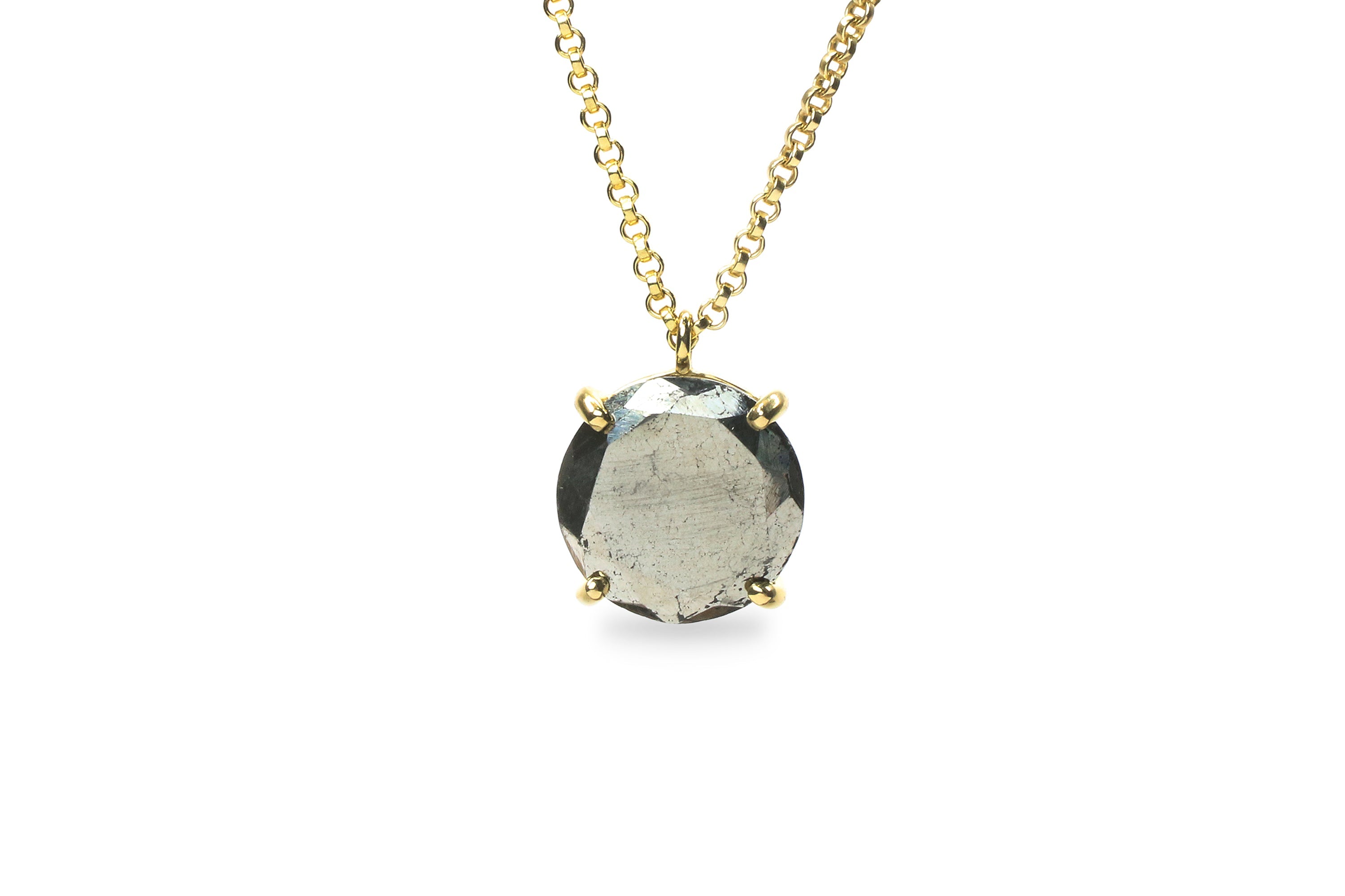 Adorably made and handcrafted gold pendant necklace. This round necklace flaunts a Pyrite stone held by prongs and a 14k gold filled chain. A gold jewelry necklace with a classic style that is wearable for special occasions or everyday.