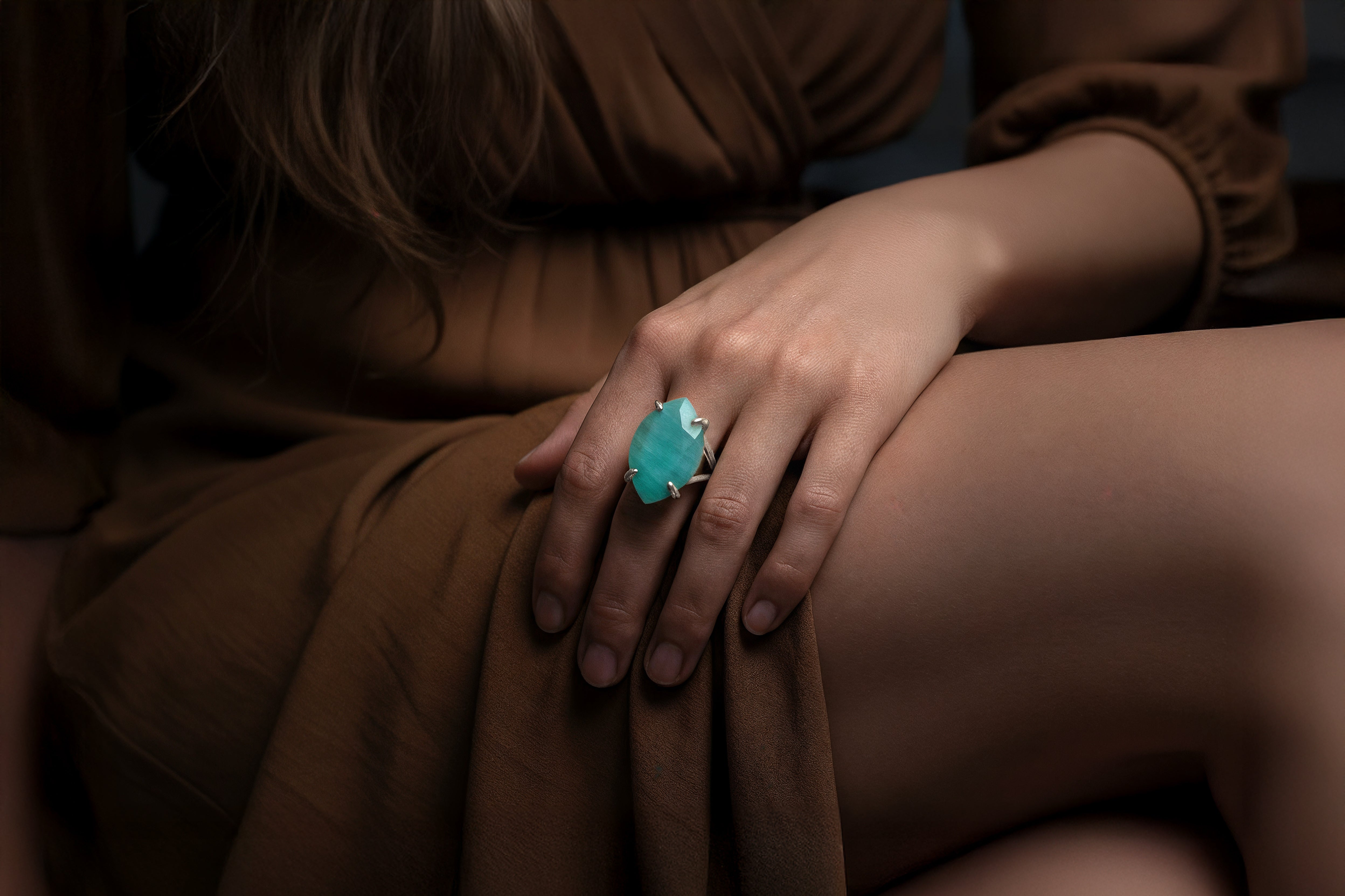 This 925 silver amazonite ring features a beautifully faceted marquise cut gemstone that radiates calming blue-green hues. The sterling silver band enhances the stone’s tranquil glow, creating a refined and timeless piece. Each ring is individually handcrafted to highlight the natural beauty of amazonite, perfect for daily wear or as a thoughtful gift for someone special.