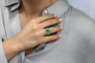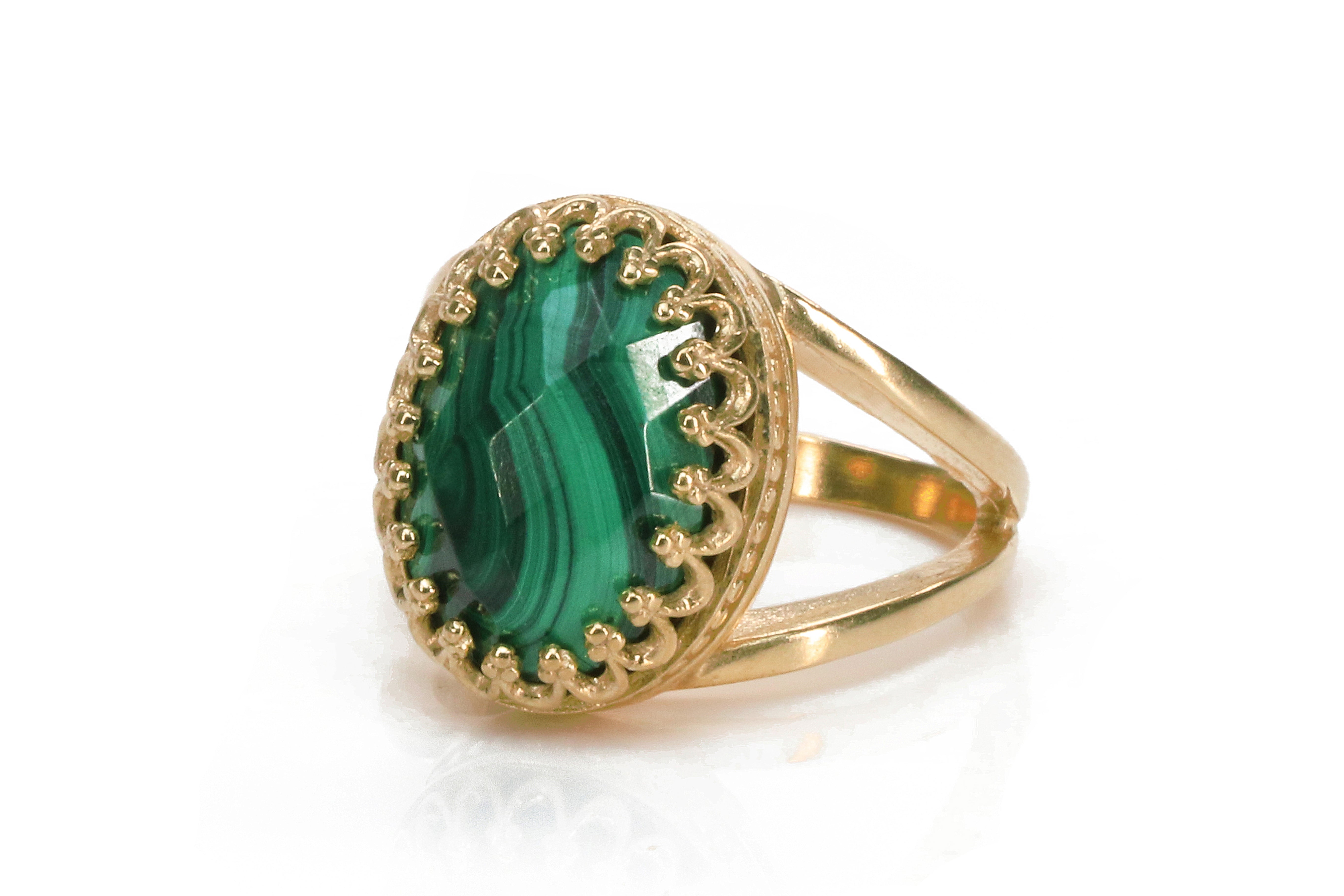 A beautiful green jewelry from Anemone that features a gorgeous Malachite stone set in 14k rose gold-filled ring band. vThe Malachite nestled in this rose gold ring is not only beautiful but is also known as a growth crystal. A dainty gold ring to wear to special occasions or wrap as a gift to a loved one.