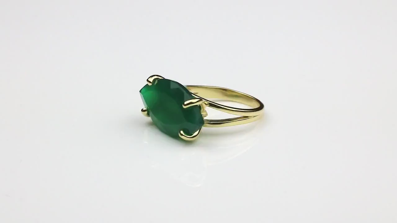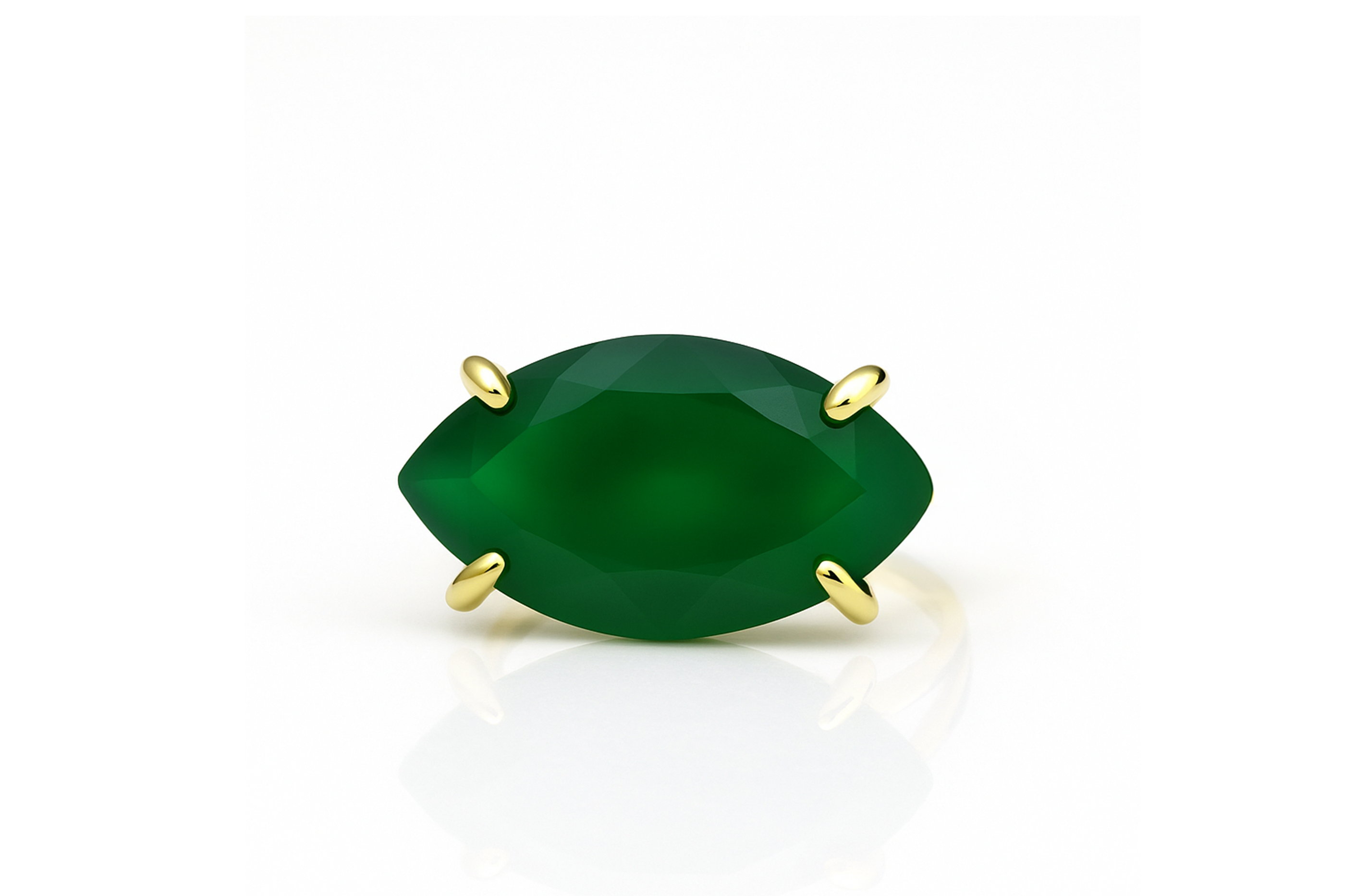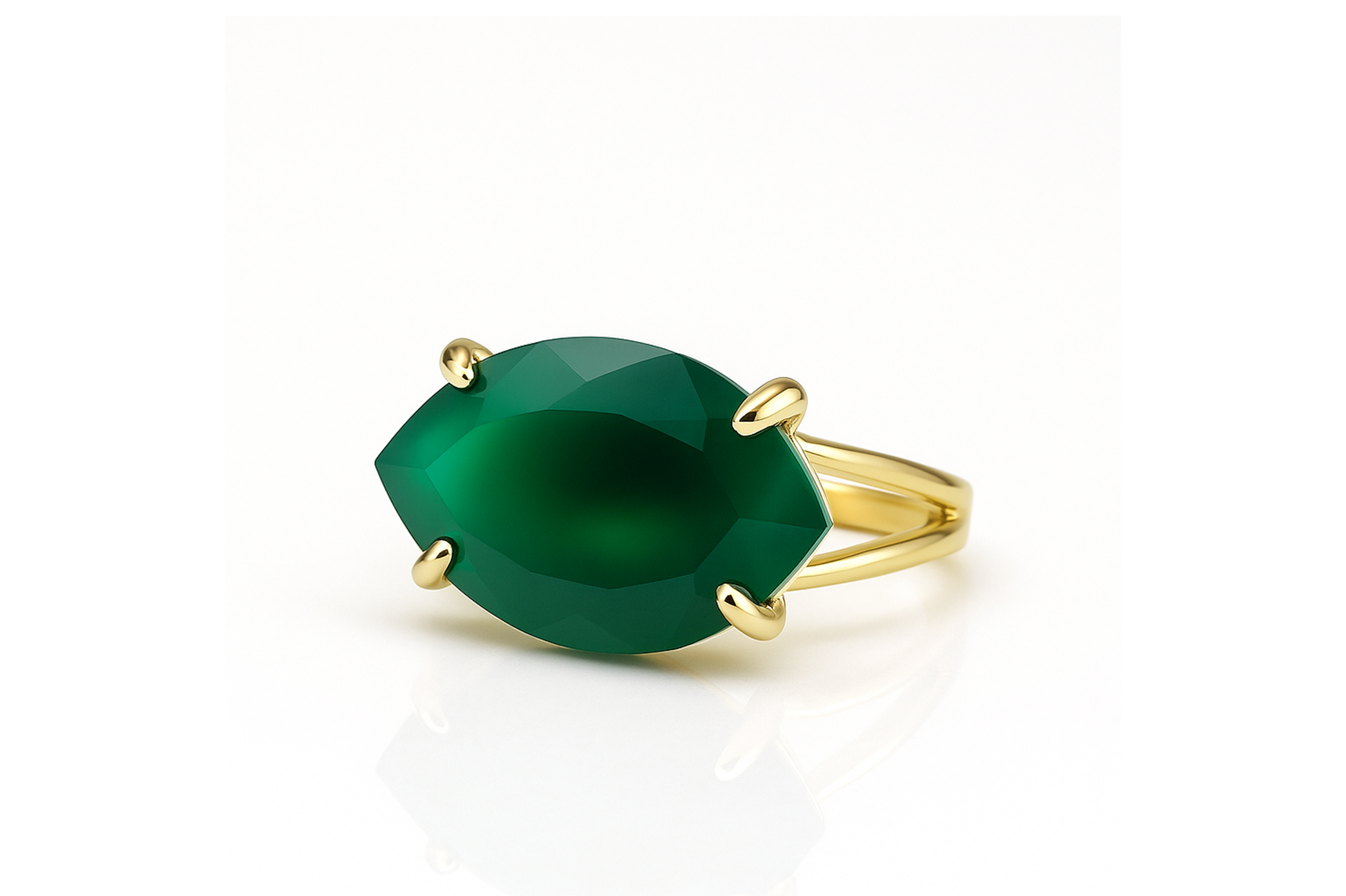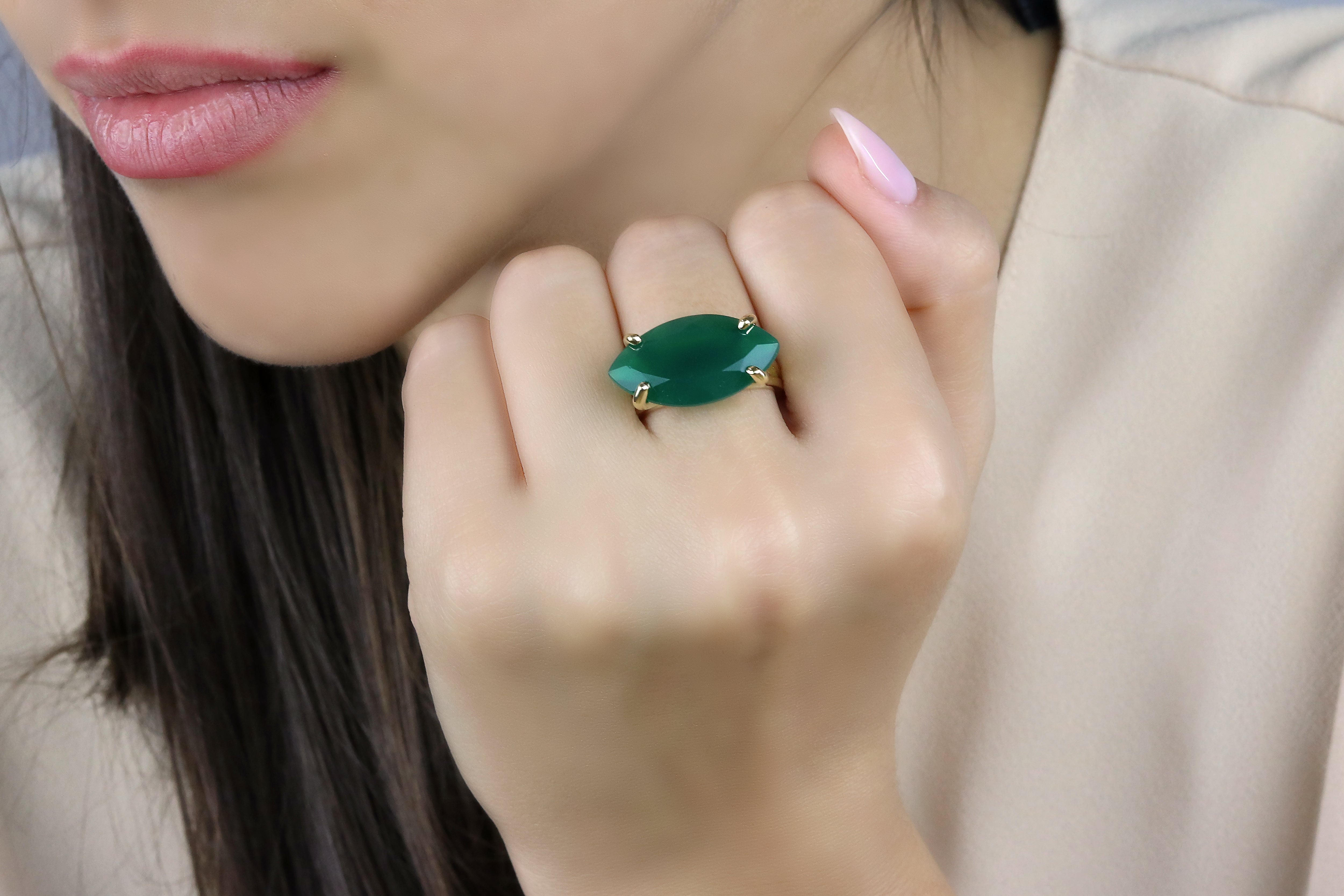 A radiant oval-cut green onyx gemstone takes center stage in this 14k gold ring, glowing with a rich emerald hue that brings life and vibrancy to any look. Expertly handcrafted with a mirror-polished gold band, this ring blends timeless elegance with modern simplicity. Perfect for daily wear or special occasions, it makes a thoughtful May birthstone gift or a striking statement piece that highlights natural beauty and confidence.