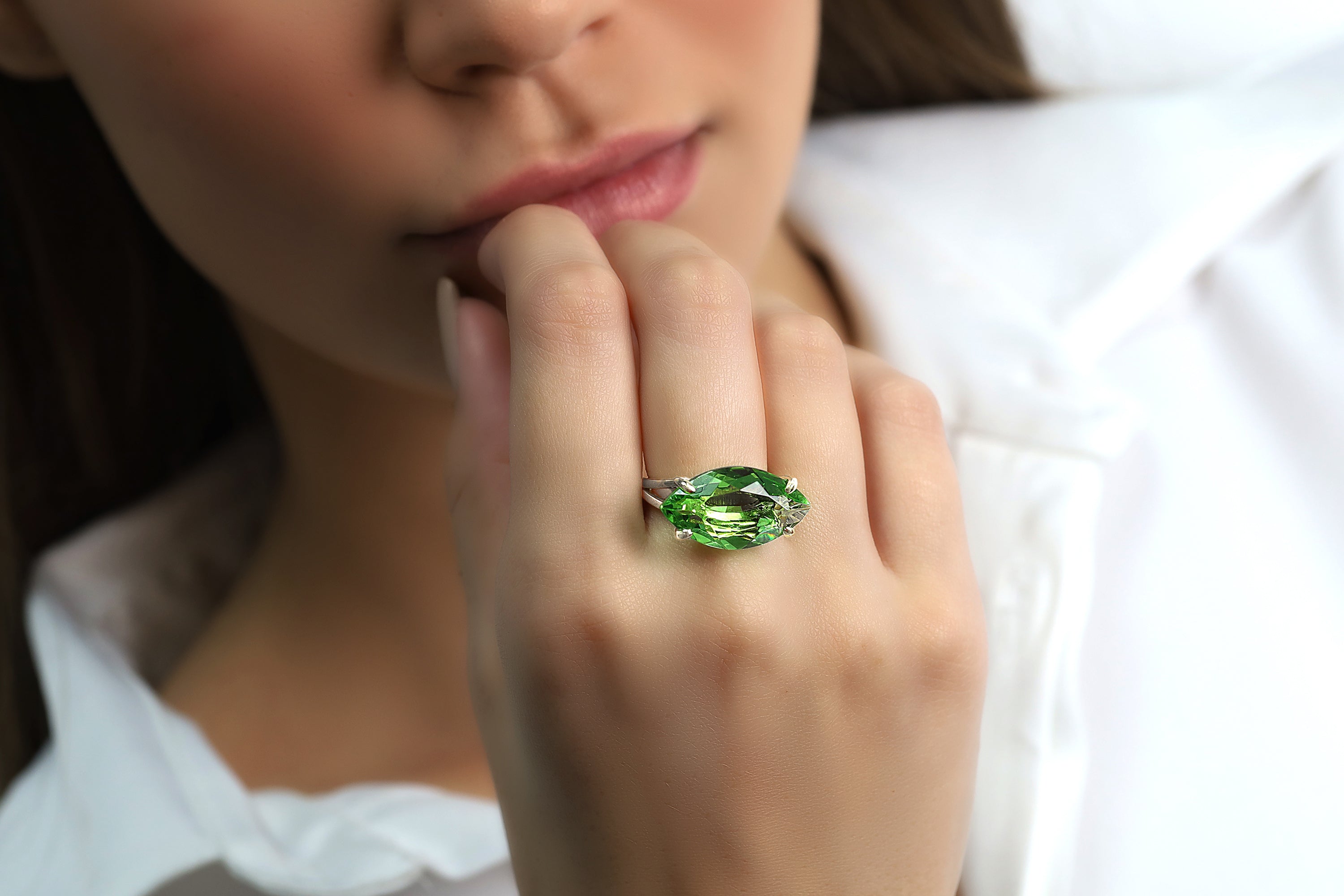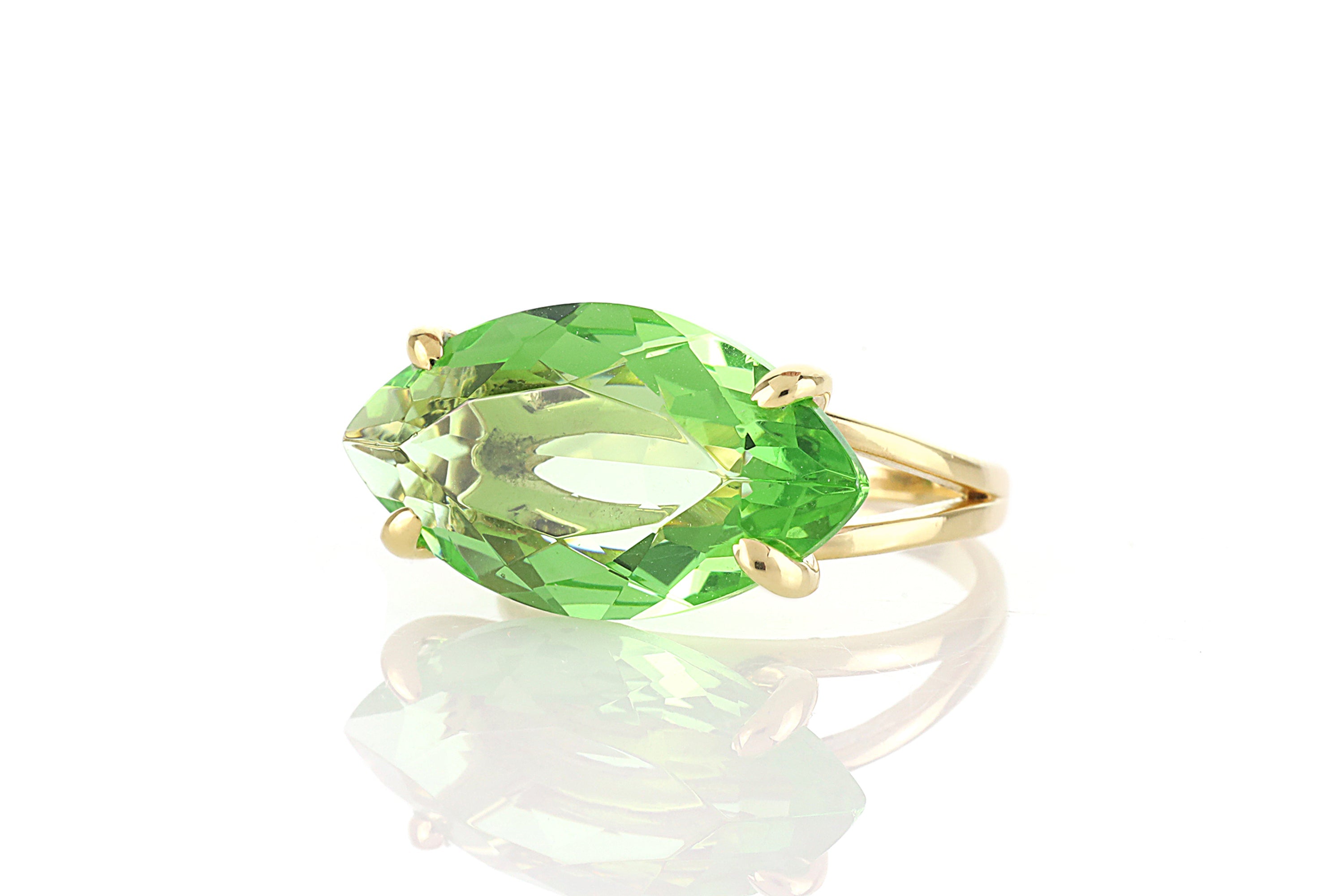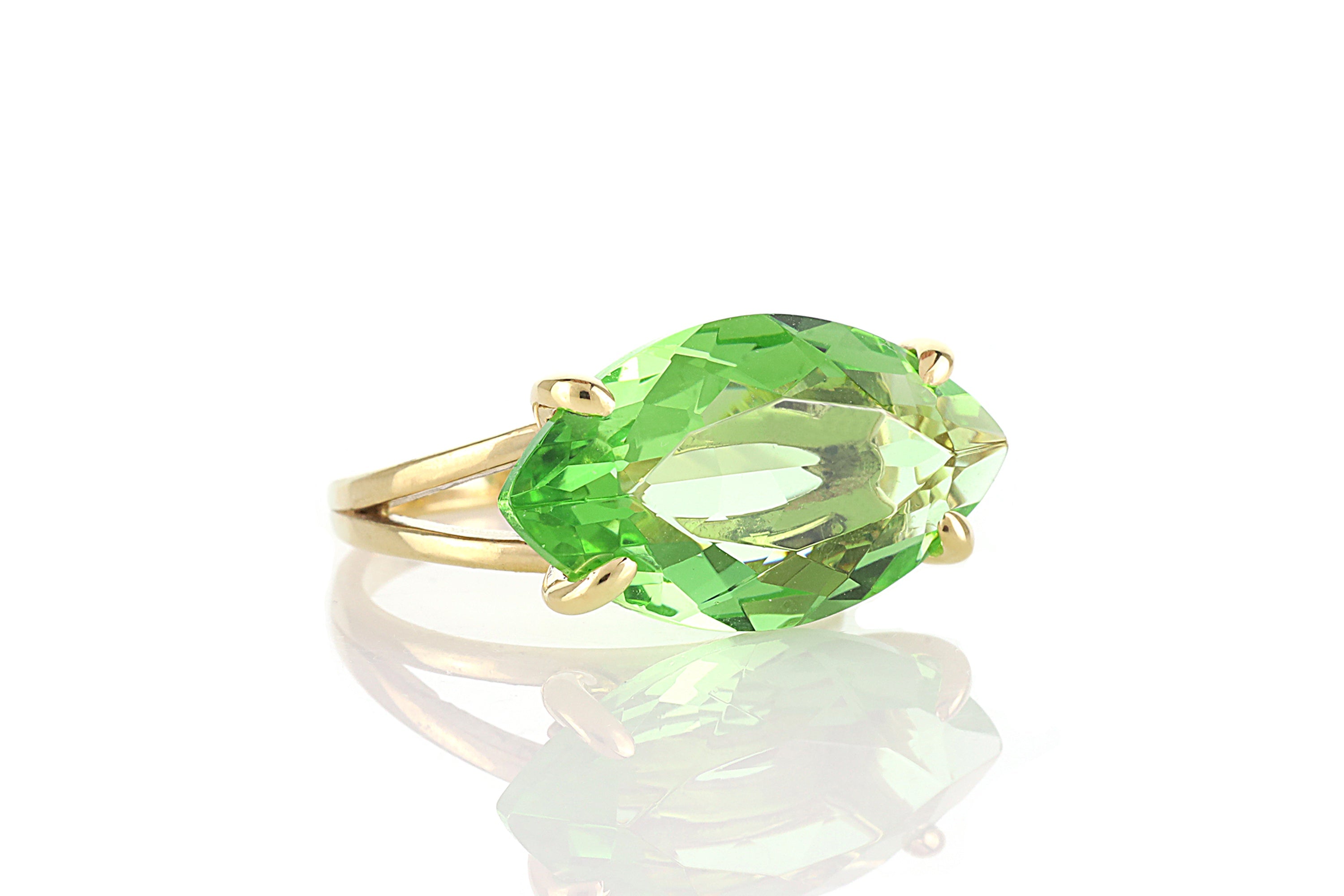 This marquise-cut Green Tourmaline ring showcases bright, vivid green tones set in polished 14k yellow gold. The elongated marquise shape enhances the gemstone’s sparkle while creating a refined and eye-catching profile. A secure multi-prong setting keeps the stone elevated, making it ideal for everyday wear or gifting. As an October birthstone, Green Tourmaline is known for its vibrant color and energetic presence. Each piece is made with attention to detail, and a personalized engraving option adds a meaningful touch.