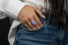 This marquise lace agate ring features a vertical-cut gemstone set in a polished rose gold band. The natural blue lace agate displays its soft layered patterns, symbolizing calm and clarity. Designed as a cocktail-style gemstone ring, it is both bold and meaningful. With customization options for engraving, this handmade ring is perfect as an anniversary gift, a love-inspired keepsake, or a unique statement piece for women.