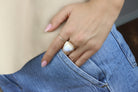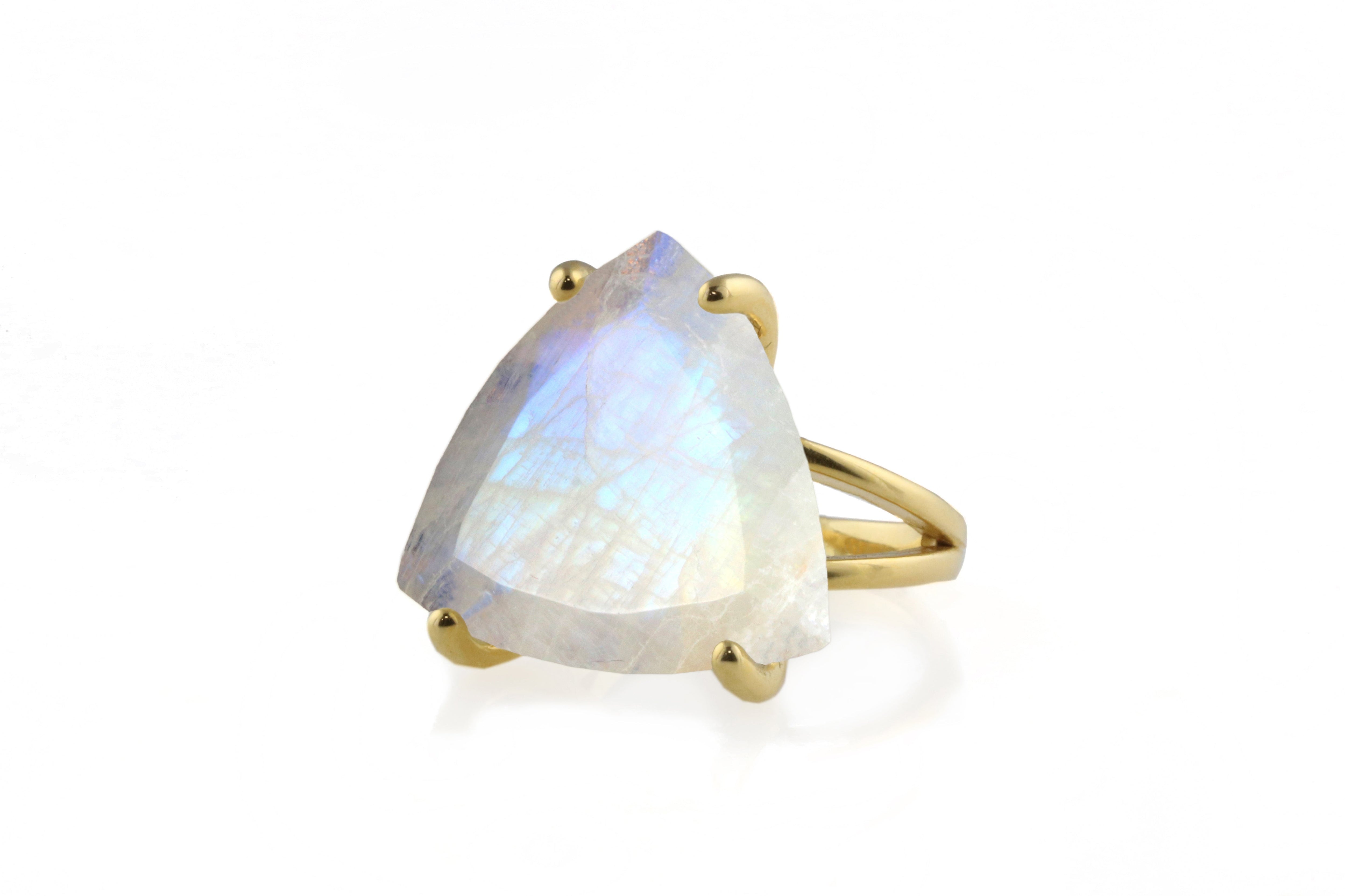 ThisSemiprecious Moonstone Ringis set in a double band prong setting. The 14 carats triangle shaped stone has a luxurious and timeless look that is perfect for any special occasion.