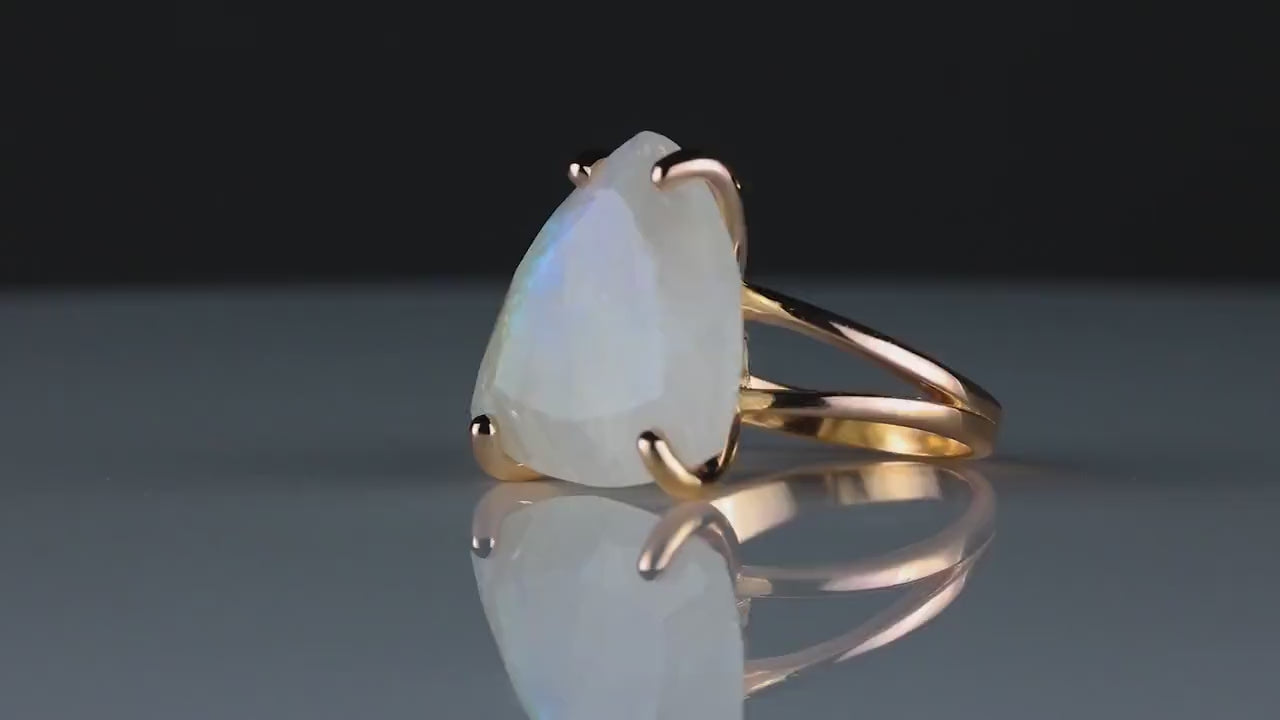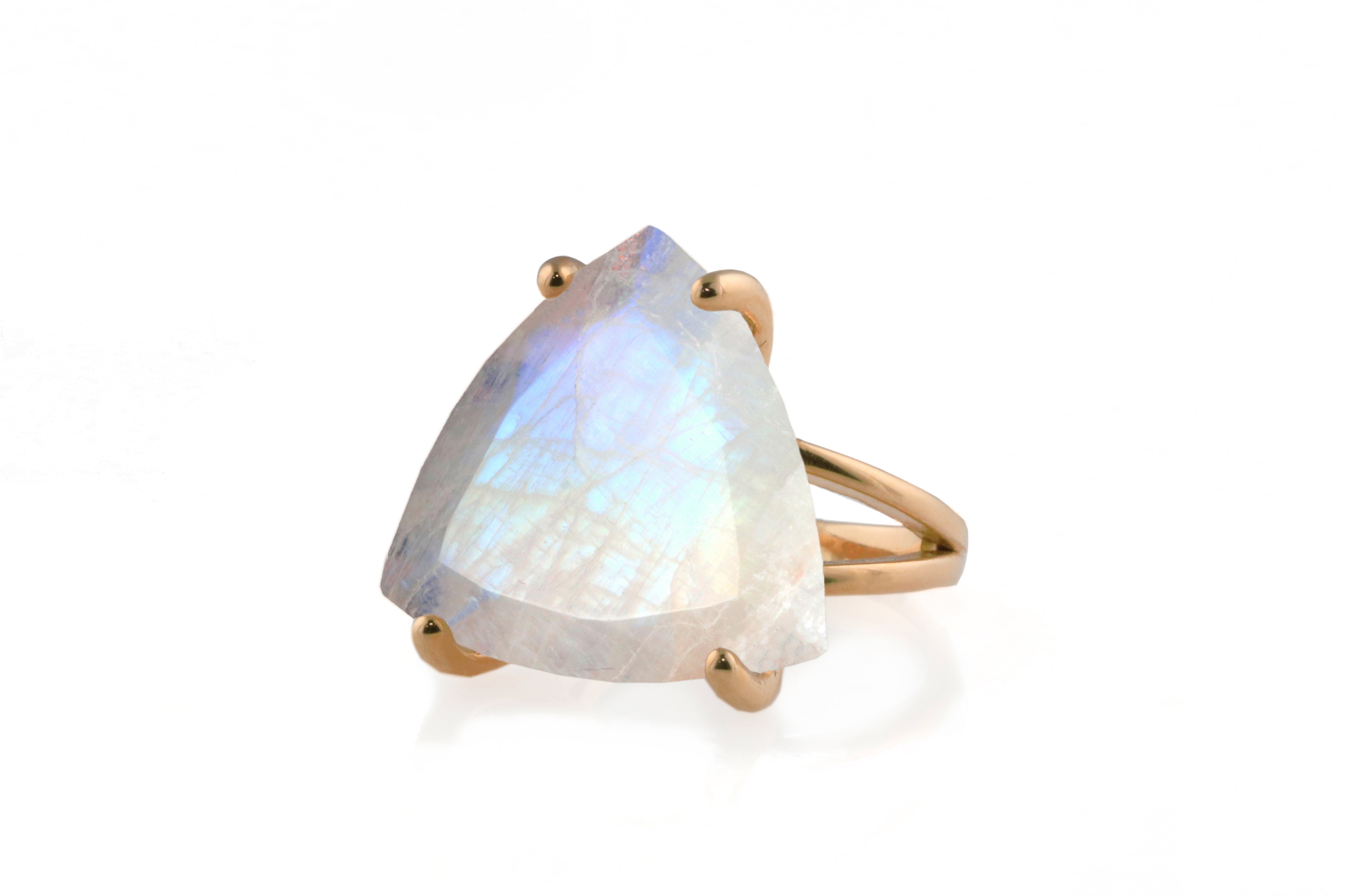 Wear and enjoy the spectacle of this trillion cut Moonstone ring from Anemone. Crafted in 14k gold filled setting and securely held by classic prongs, this statement stone ring is sure to capture attention and complete your daytime or evening ensemble. Ever ravishing June birthstone ring to surprise a loved one with or to add to your jewelry collection.