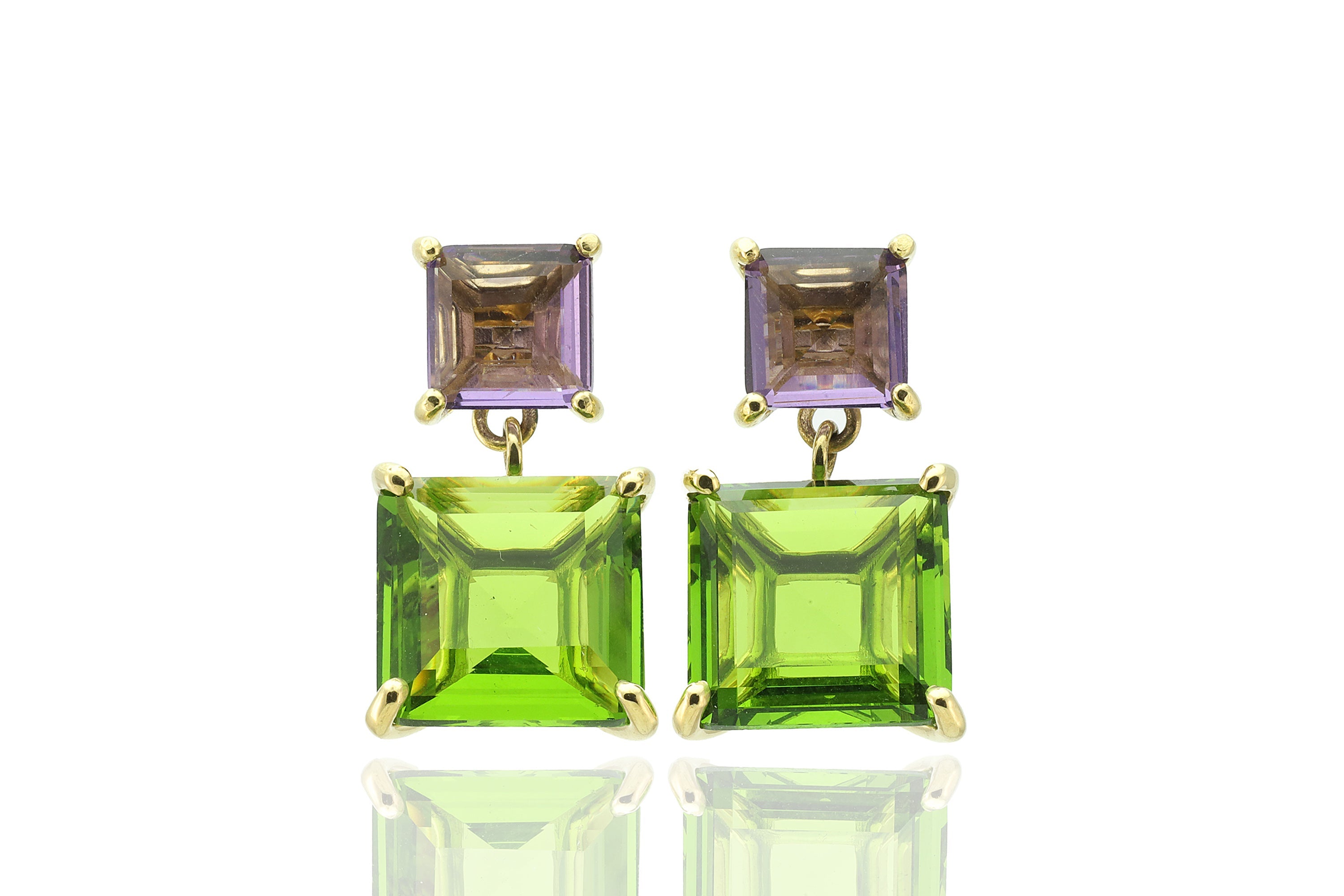 Multi-Stone Square Peridot and Amethyst Dangle Gold Filled Earrings