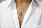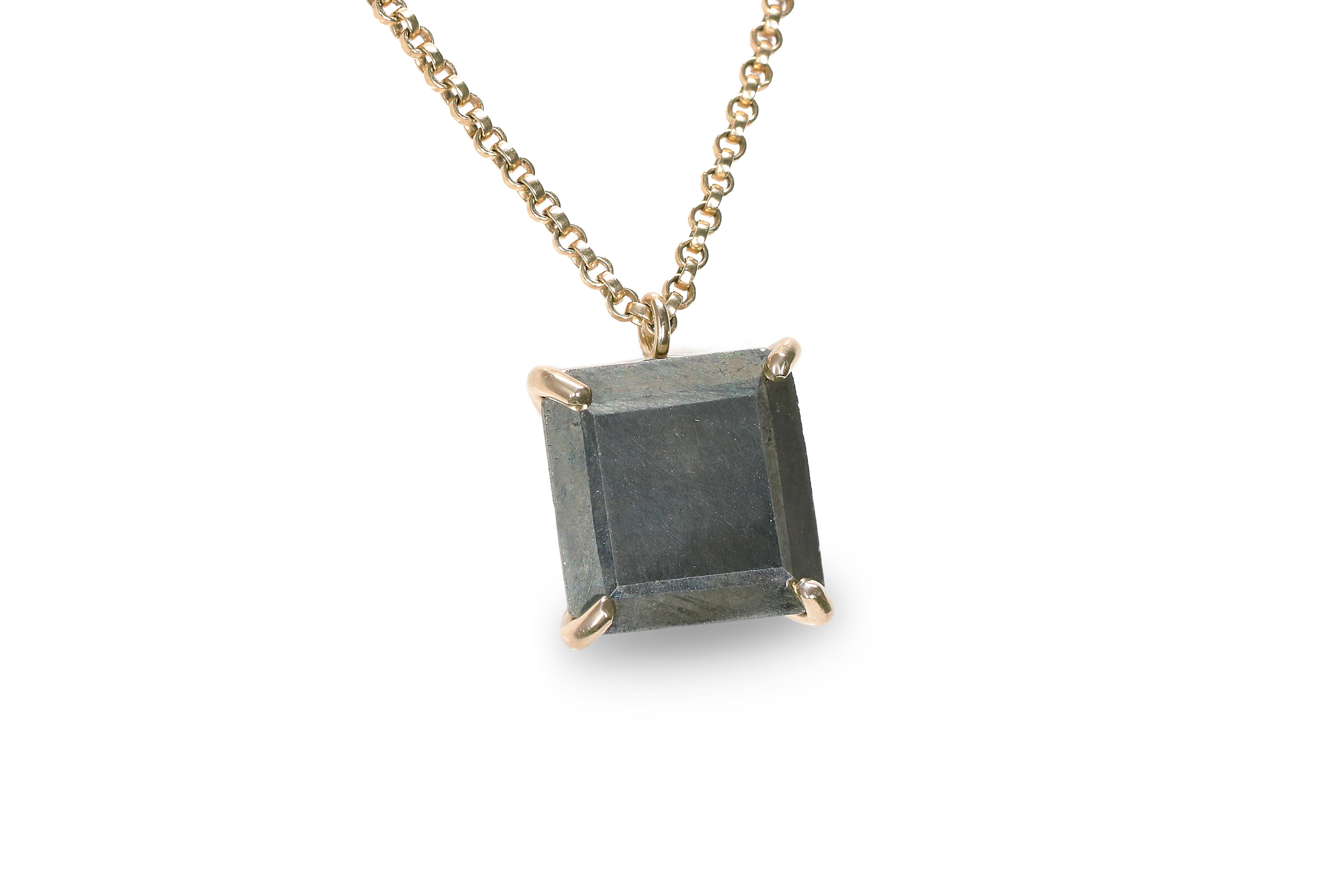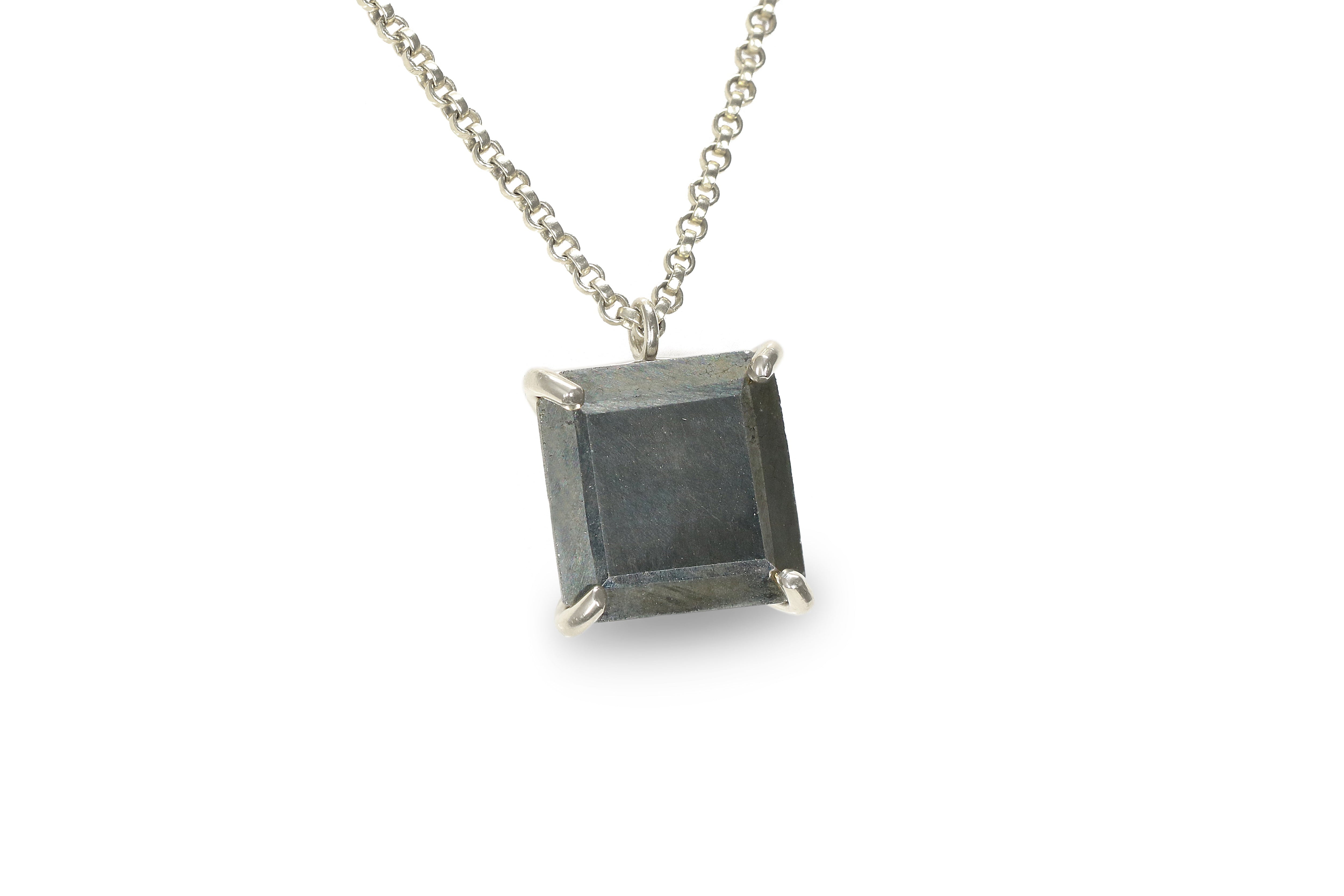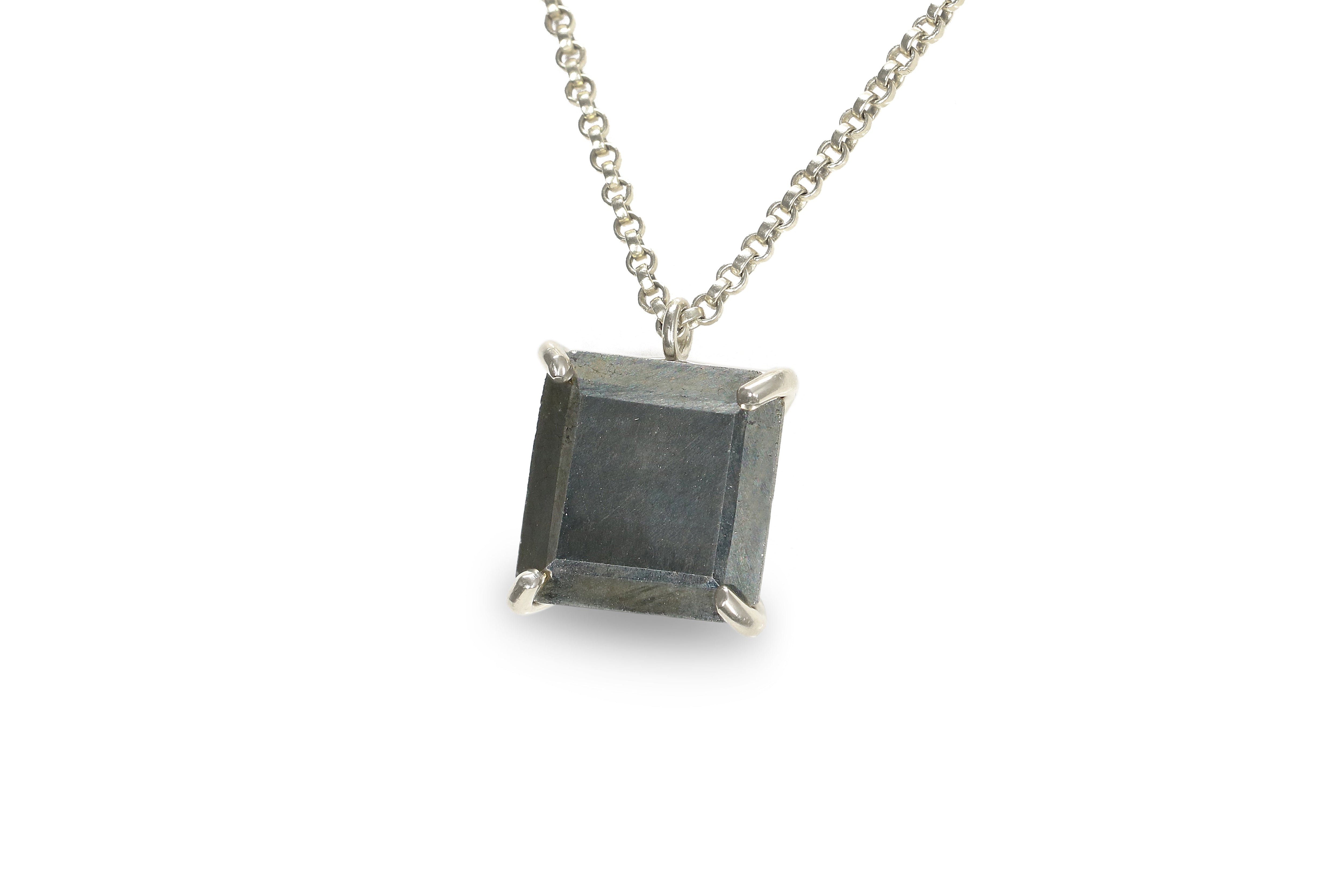 A Pyrite stone, with a gold-like luster is showcased in this square pendant necklace. This Sterling silver necklace is a worthy addition to your stylish ensemble. This lovely piece makes a unique statement fashion jewelry or a distinct gift for her.
