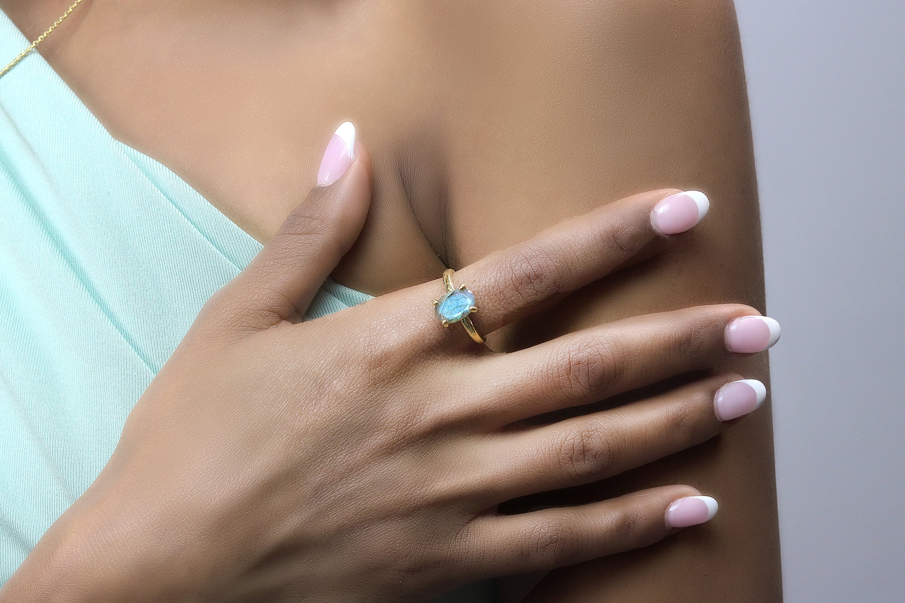 Love wearing the enjoyable and unique flash of Blue Labradorite set and featured in this oval ring. A delicate piece you can wear with other crystal ring pieces or a dainty stack of band rings. This Labradorite piece is a perfect expression of your creative side.