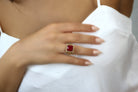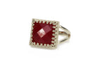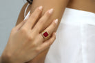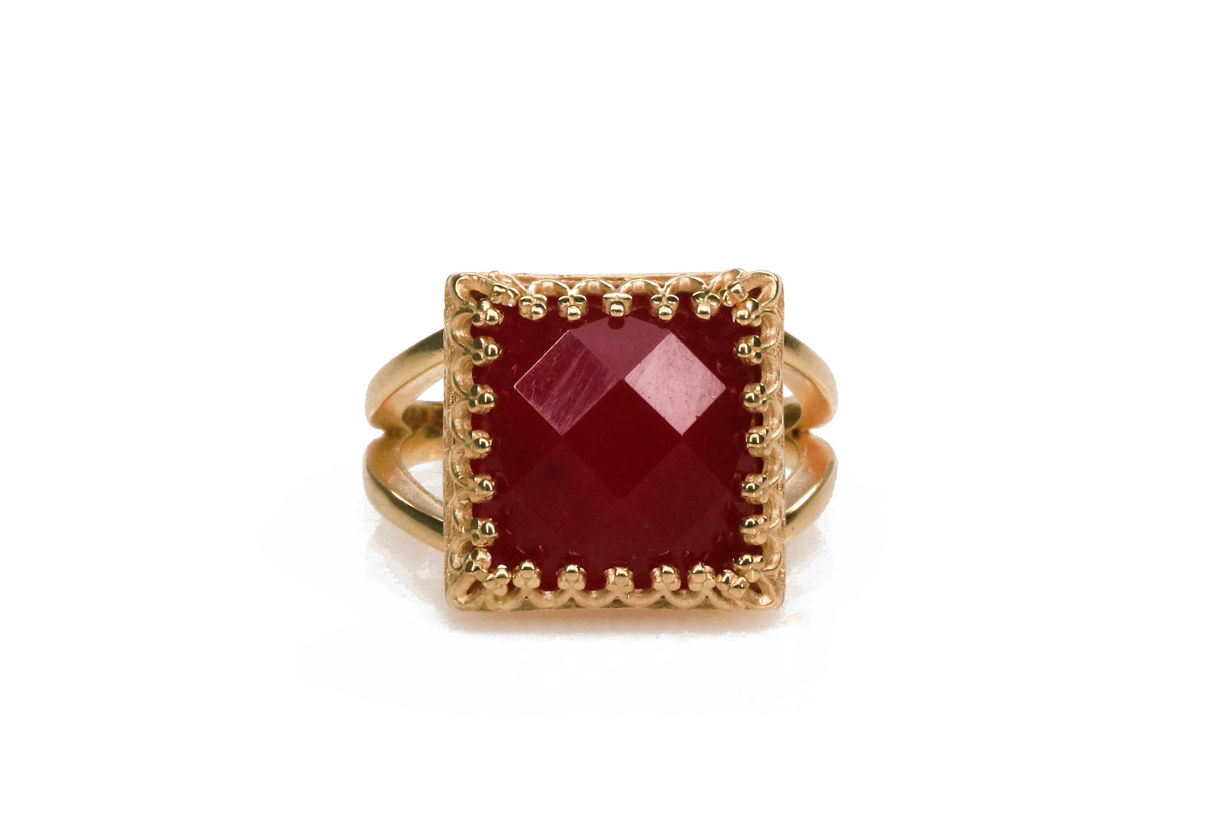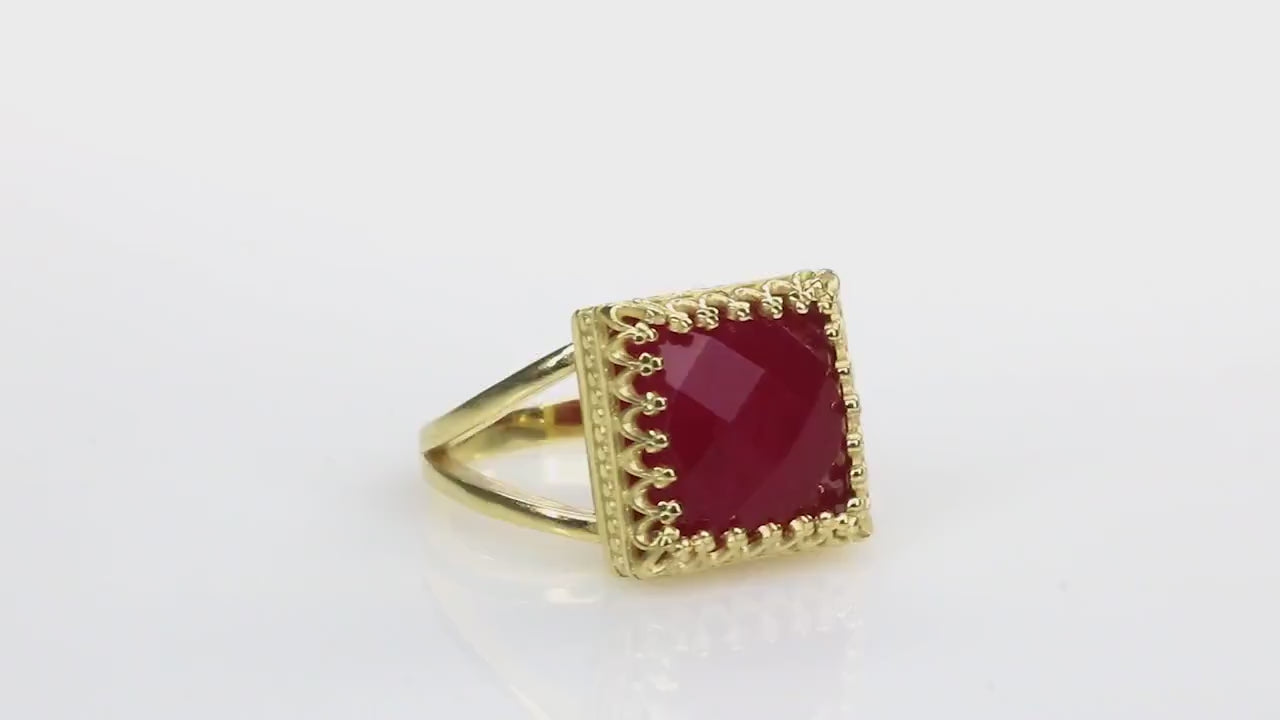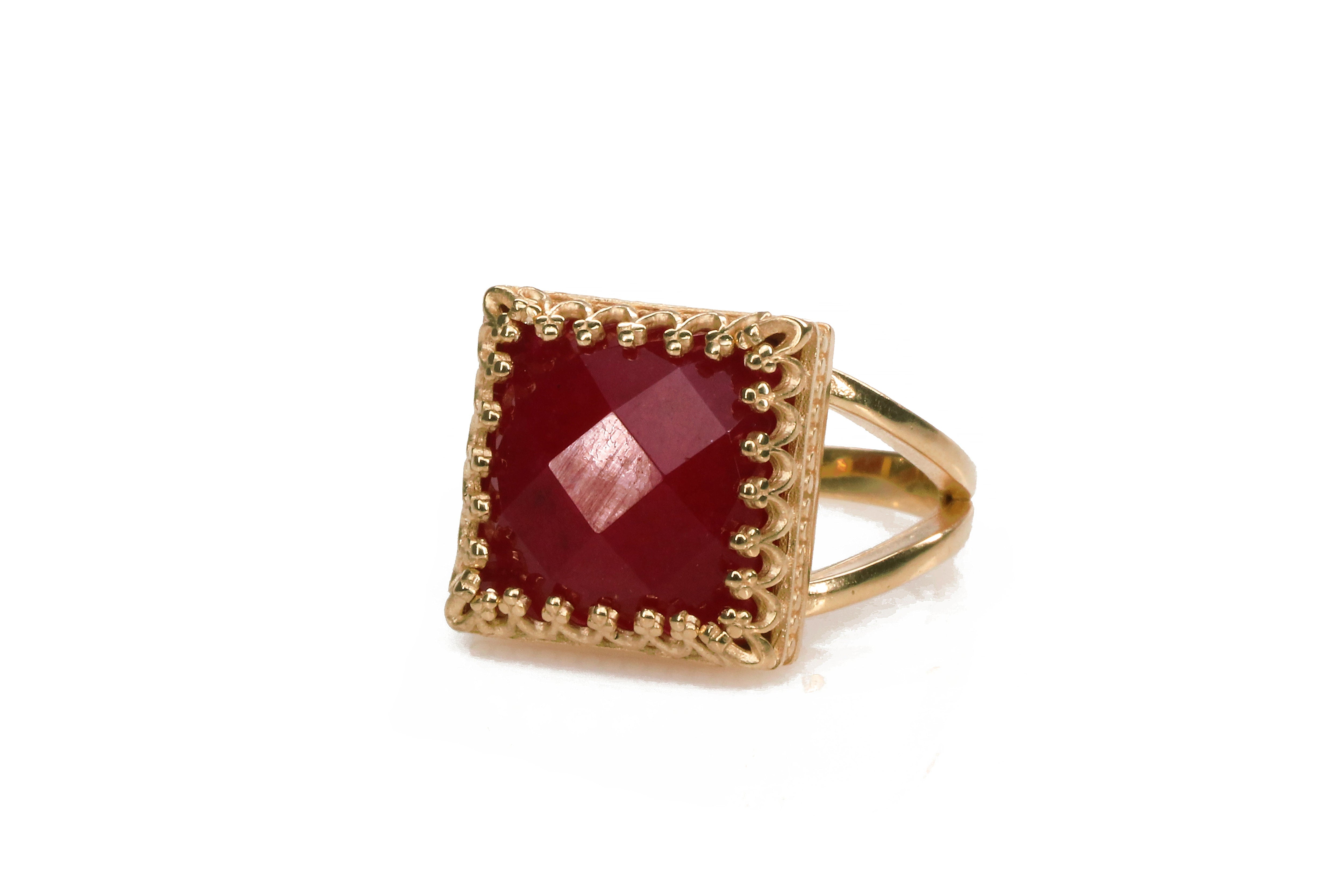 An impeccable jade ring from Anemone, with its gemstone greatly associated with love and royalty. In this piece, the 12x12mm Jade is checkerboard cut to finery and set in a 14k rose gold-filled band to complete its romantic look. A birthstone ring perfect for lovely ladies on their special day. This red jewelry, with its vibrant color, is a must-have piece in your collection.