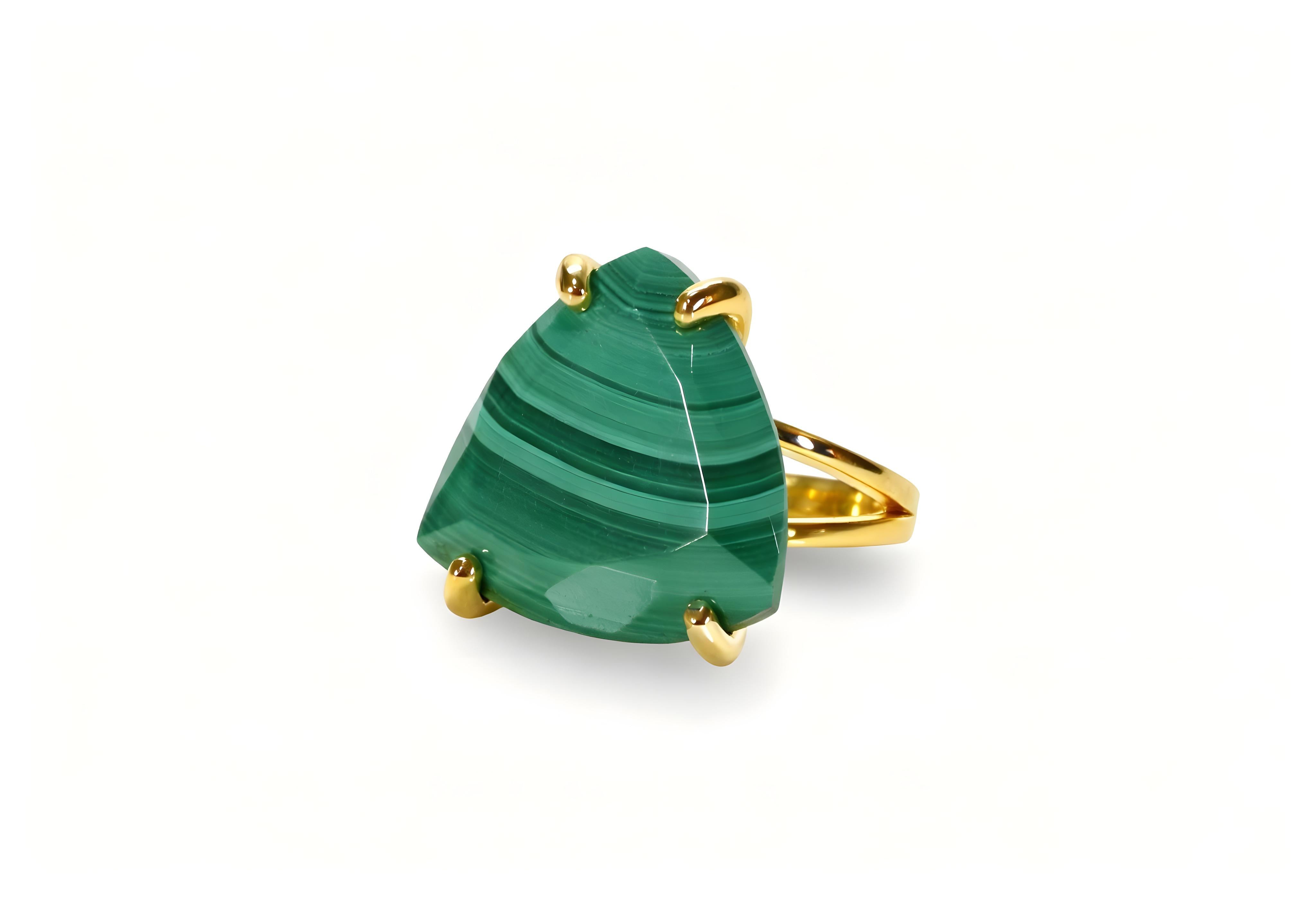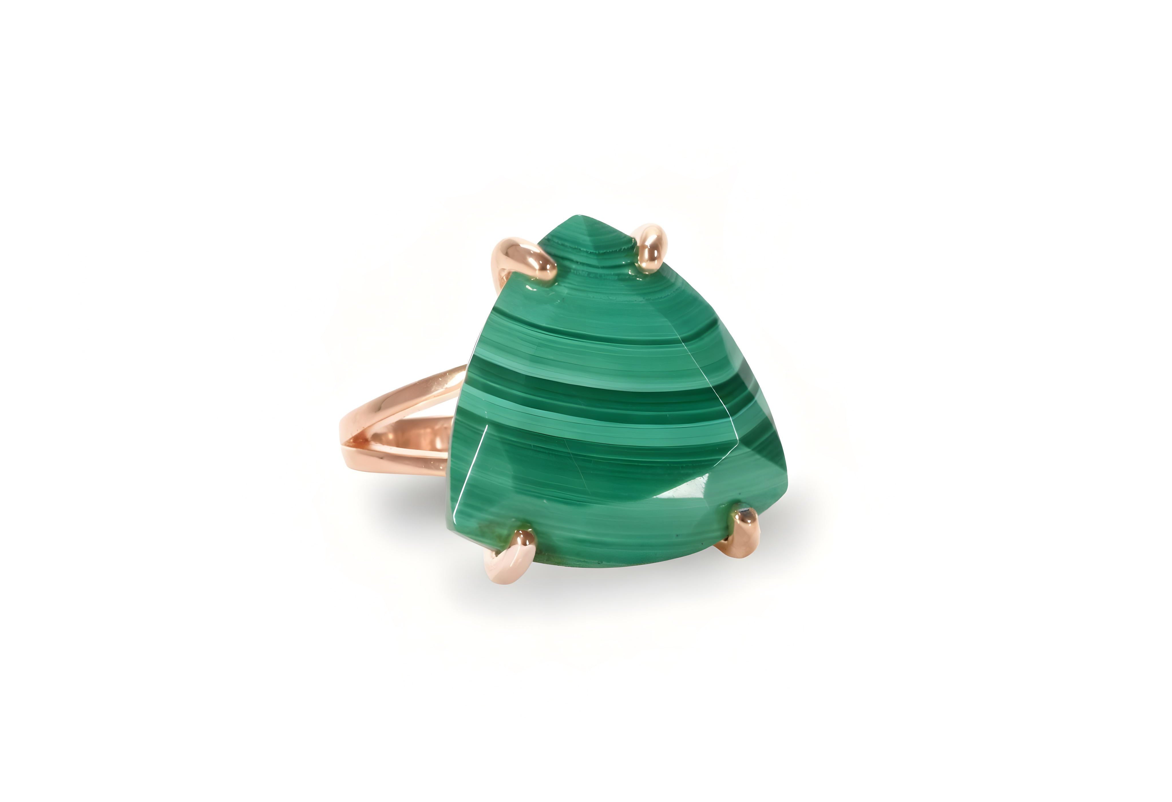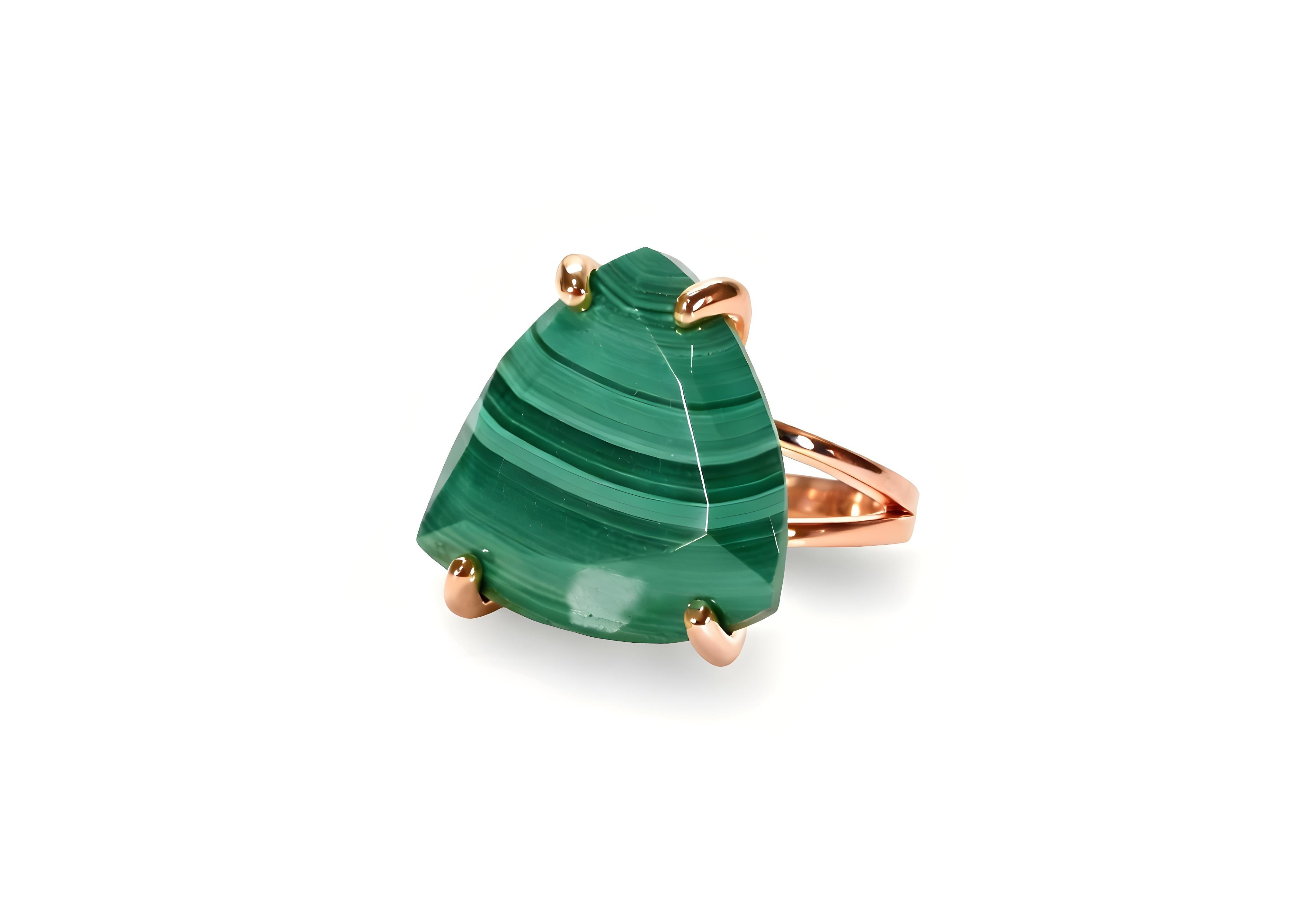 This malachite trillion ring brings a bold touch of color with its rich green semi-precious stone. The faceted trillion cut highlights natural patterns while the rose gold band adds a refined finish perfect for any day or evening look.