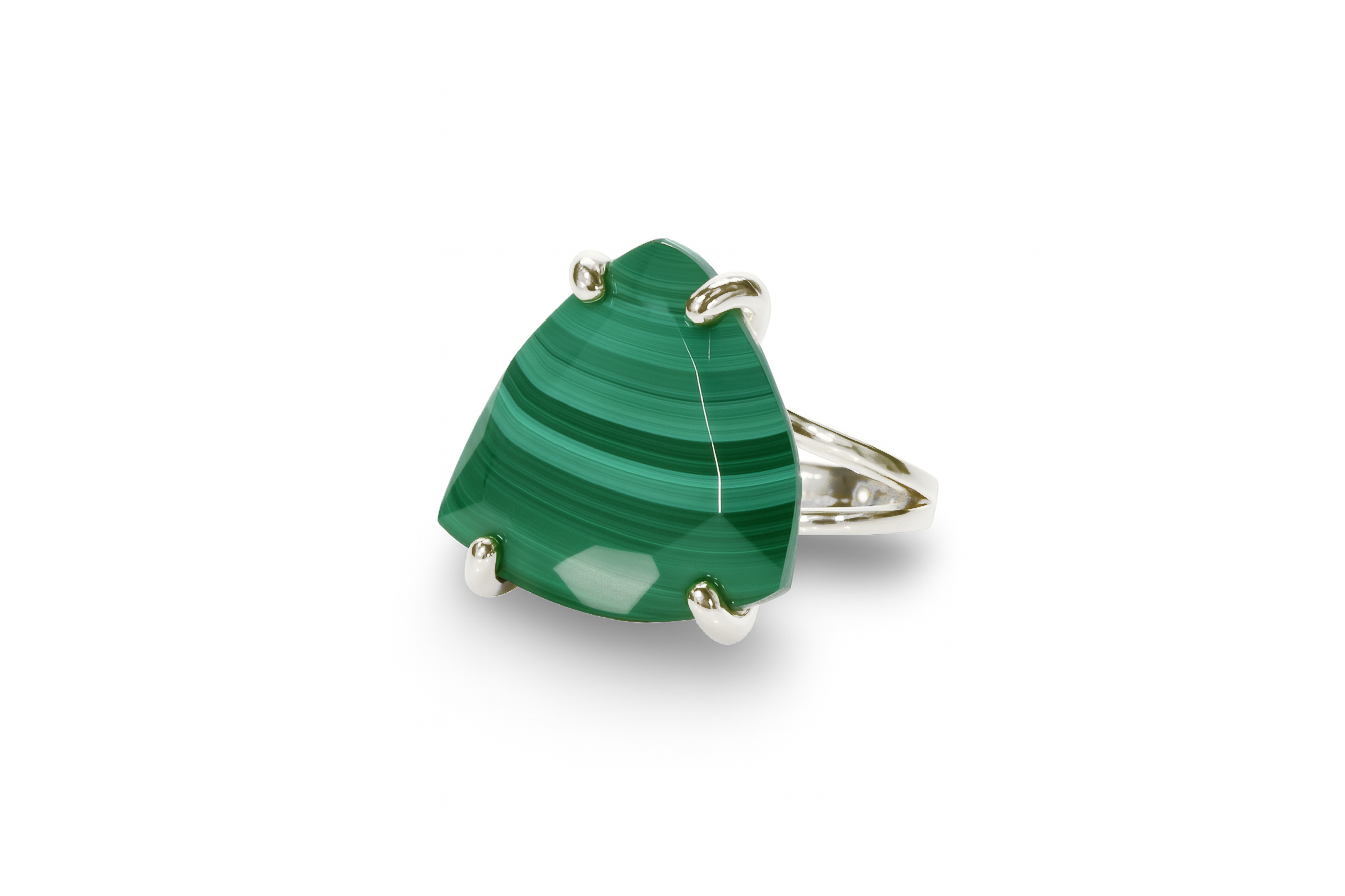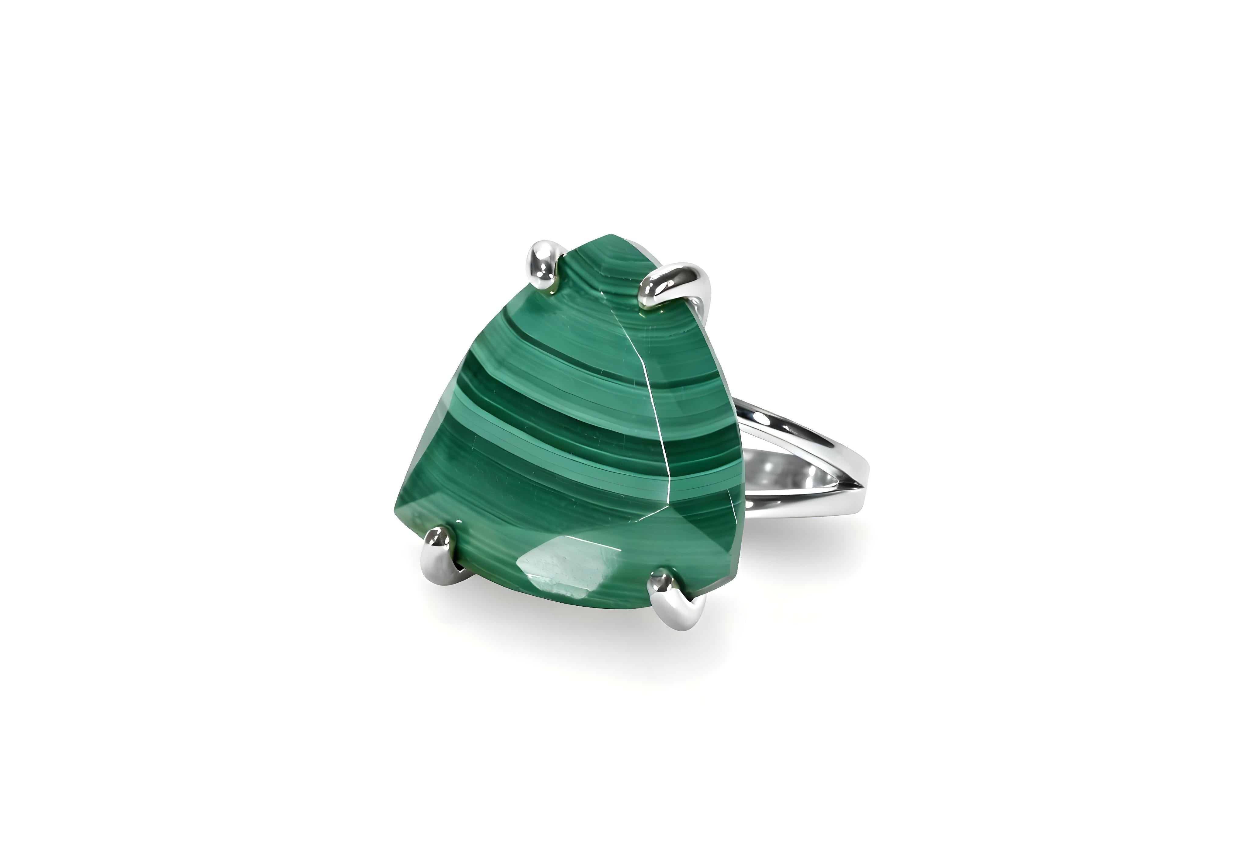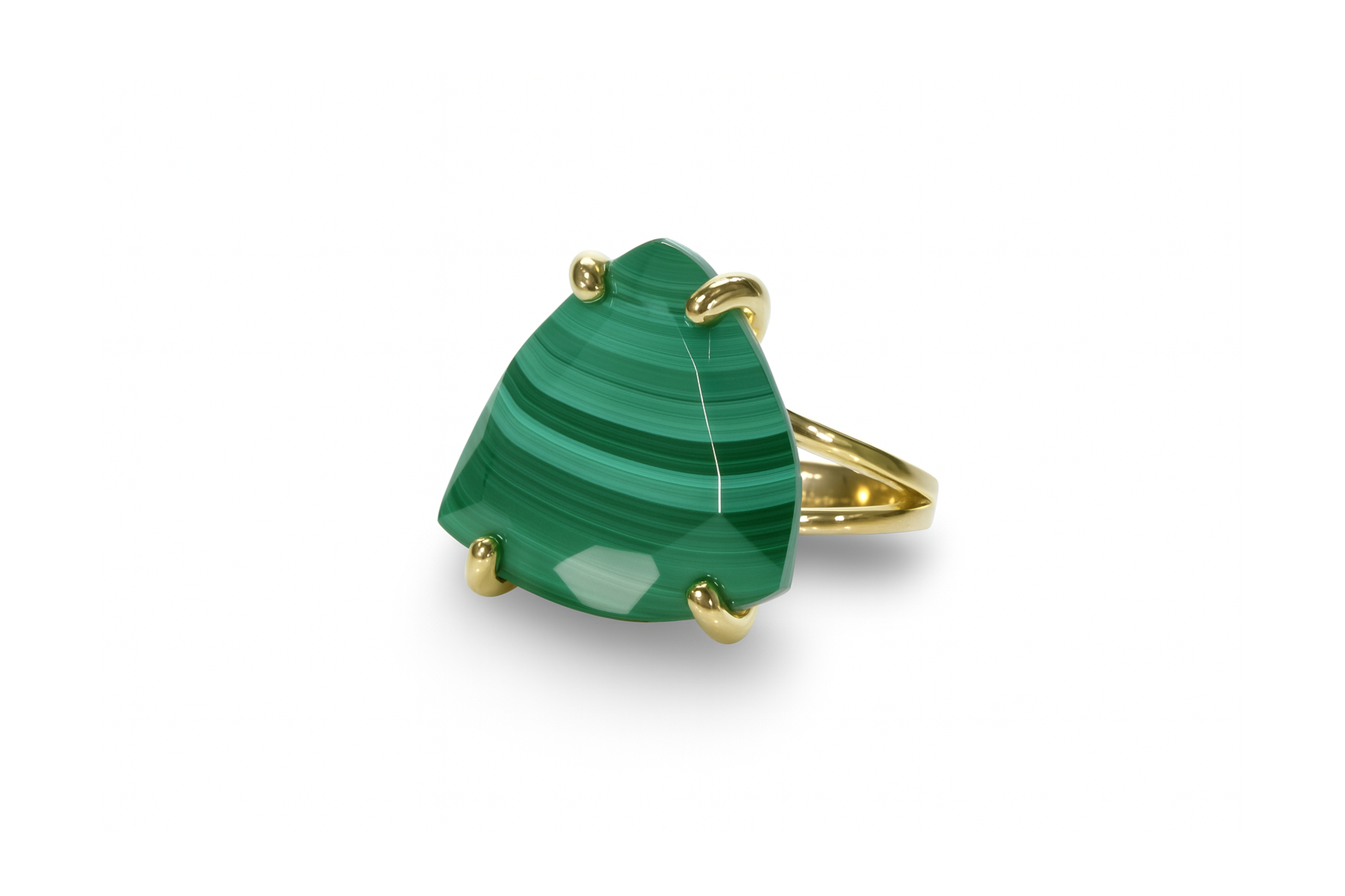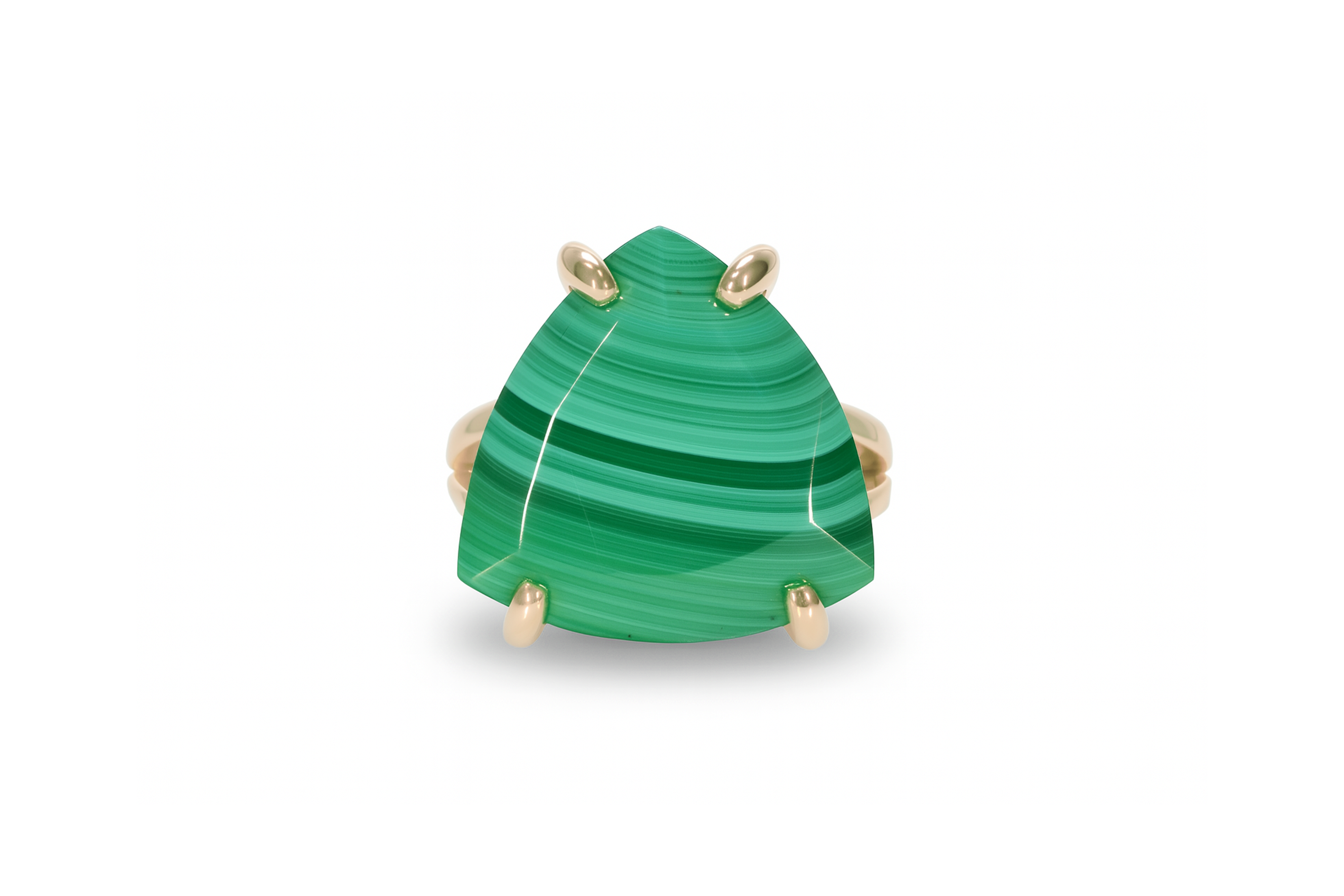 This malachite trillion ring brings a bold touch of color with its rich green semi-precious stone. The faceted trillion cut highlights natural patterns while the rose gold band adds a refined finish perfect for any day or evening look.