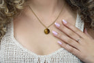 This tiger eye gemstone is set in a beautiful 18k gold vermeil bezel, making it a high-quality and stylish accessory. This 16mm round pendant is perfect for anyone who loves semiprecious gemstones and bold jewelry. The included chain makes this a complete and ready-to-wear necklace. It's a great gift for someone special or a special treat for yourself.