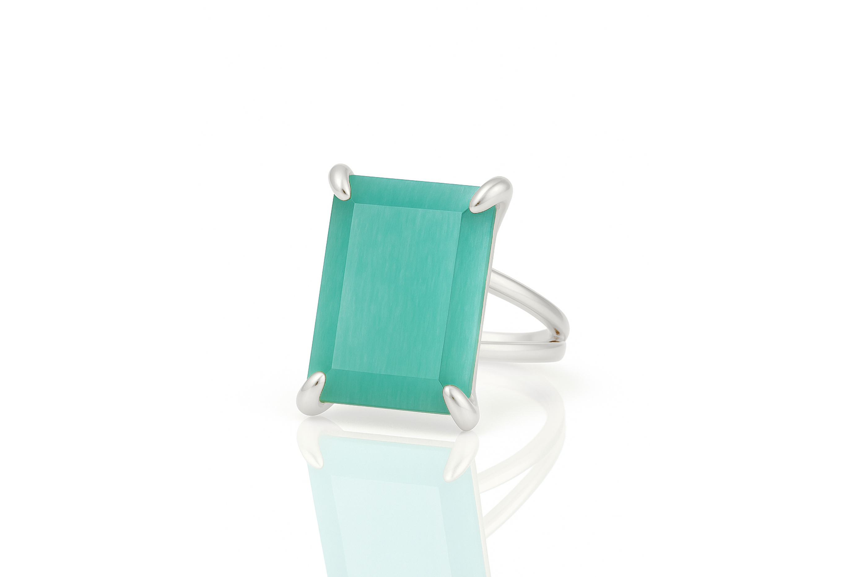 This silver amazonite ring brings a modern edge to timeless gemstone jewelry. Featuring a rectangular cut blue-green amazonite, it’s set in a sleek sterling silver band that enhances the stone’s calm and luminous tone. The handcrafted prong setting provides durability while keeping the look refined — a stunning ring for any outfit or occasion.