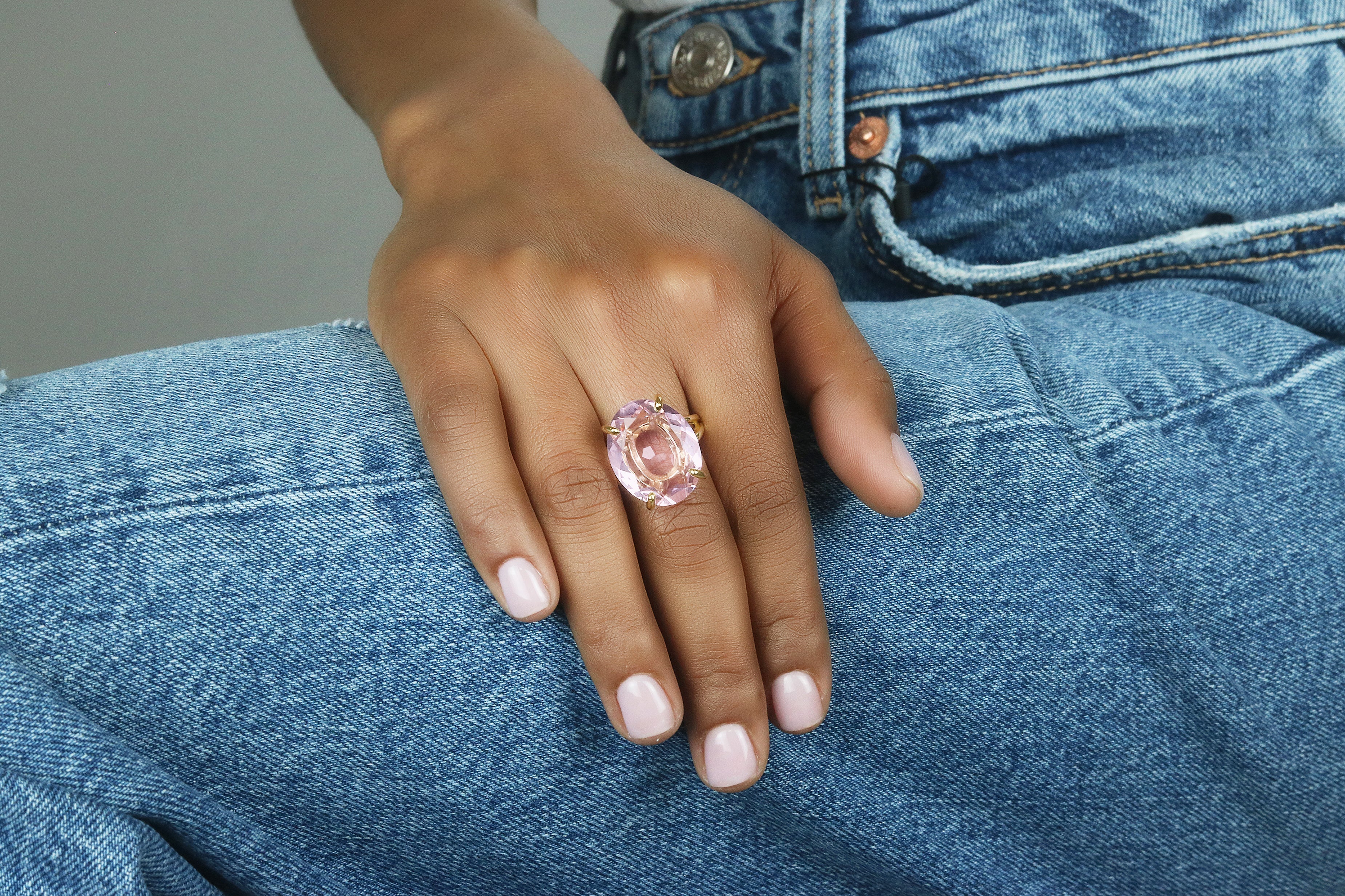 This oval rose quartz ring is set in a polished rose gold double band design. The soft pink tones of quartz, known as the stone of love, bring both beauty and meaning to this timeless gemstone ring. The bold oval cut makes it a true statement cocktail piece while still versatile for daily wear. Handcrafted with care, it’s perfect as a self-love symbol, a thoughtful gift, or a stylish addition to any jewelry collection.