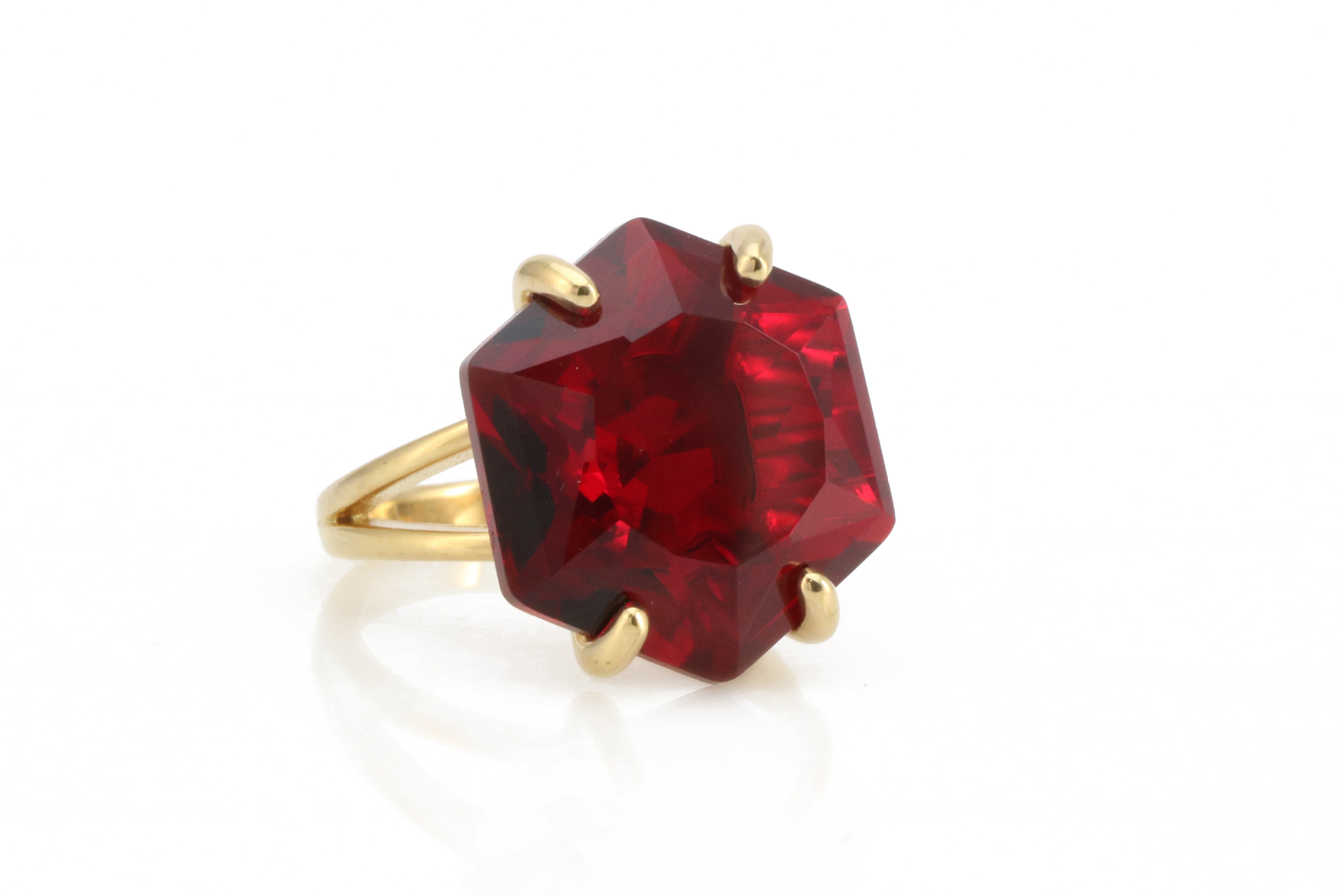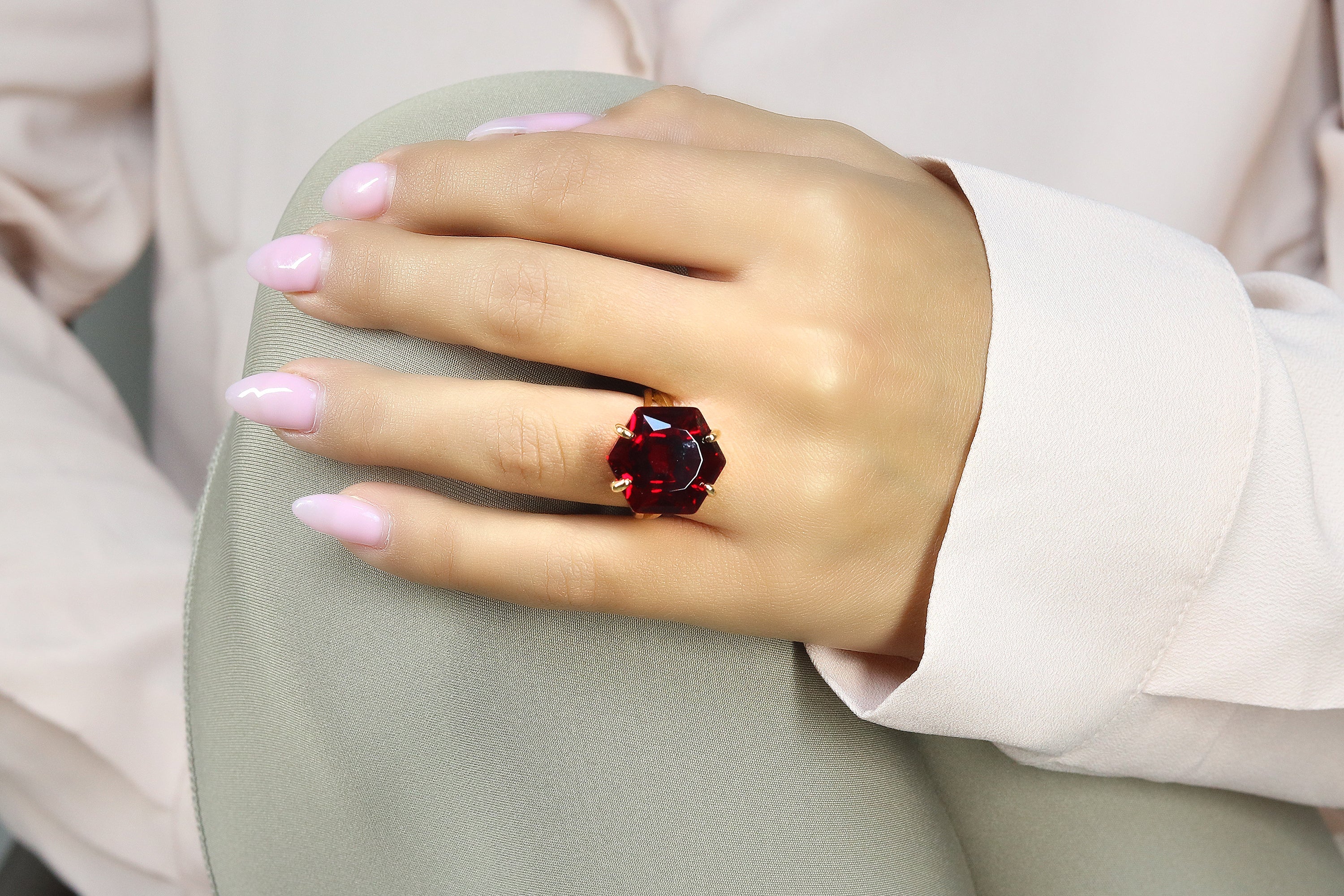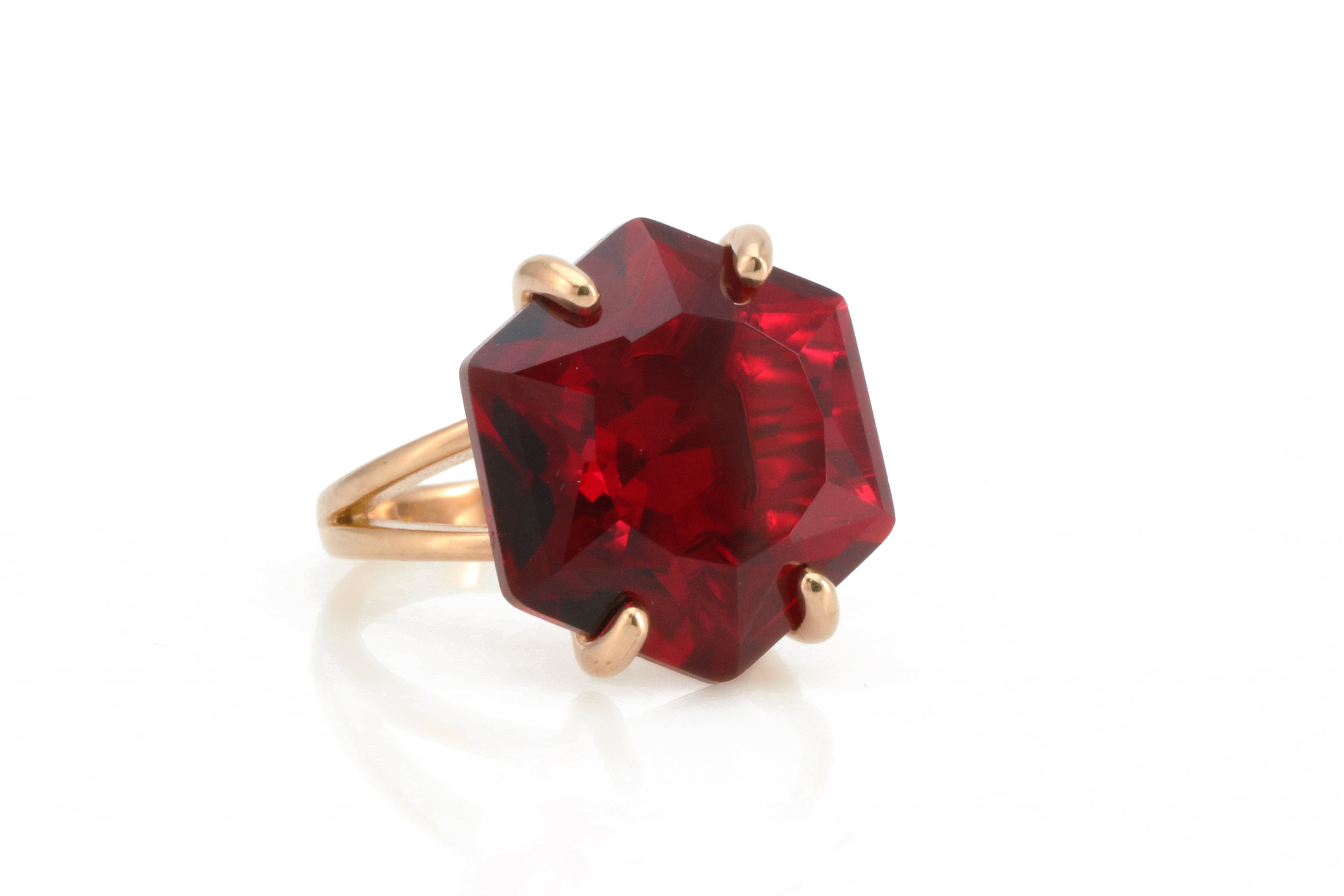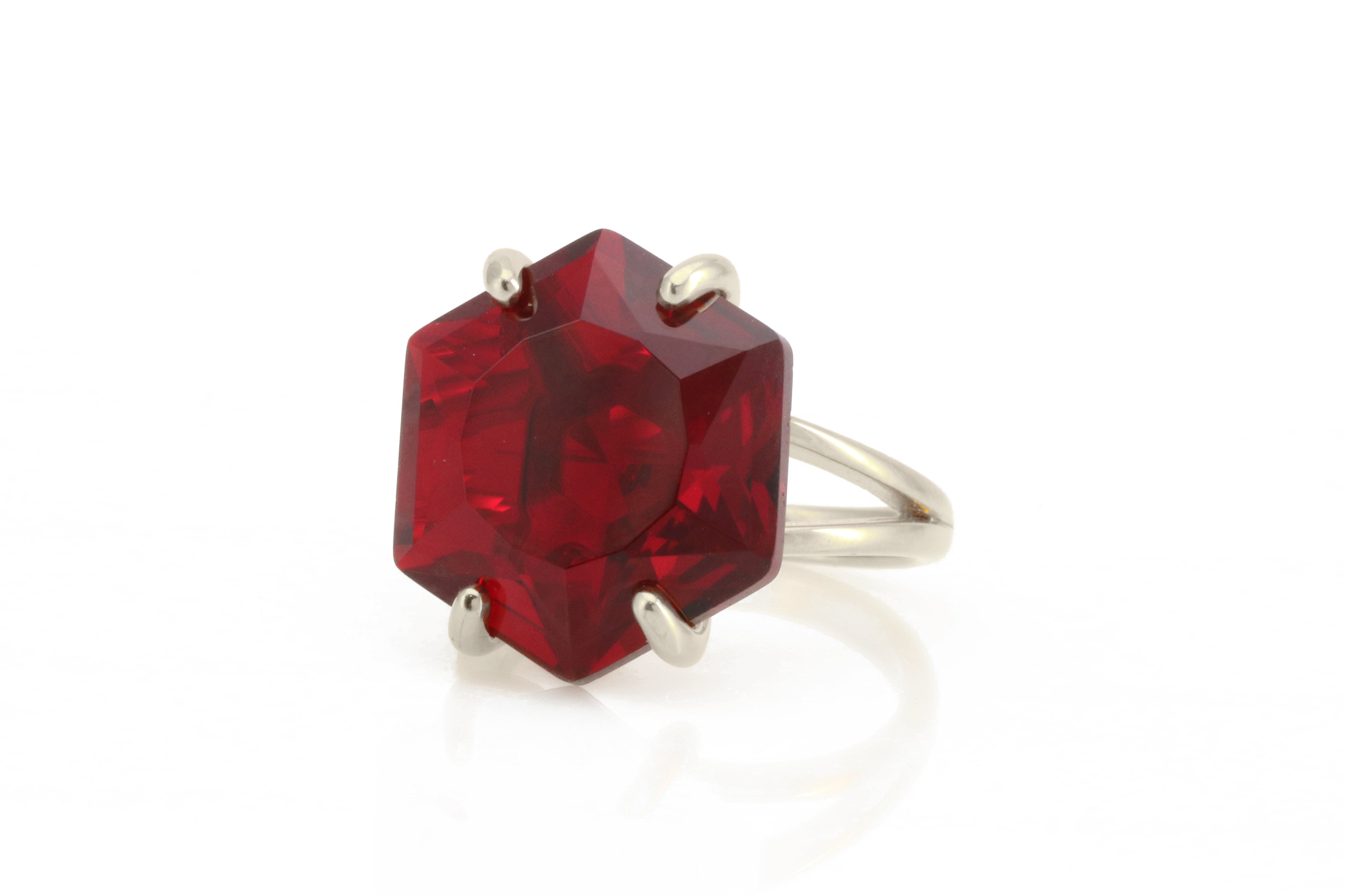 This 18k gold hexagon garnet ring features a custom-cut gemstone that glows with rich red tones. Garnet, the January birthstone, is celebrated for its symbolism of love, vitality, and strength. The bold hexagon shape gives the piece a contemporary flair while maintaining timeless elegance. Handcrafted with care, this ring is perfect as a statement cocktail accessory, a meaningful gift, or a luxury addition to any gemstone jewelry collection.