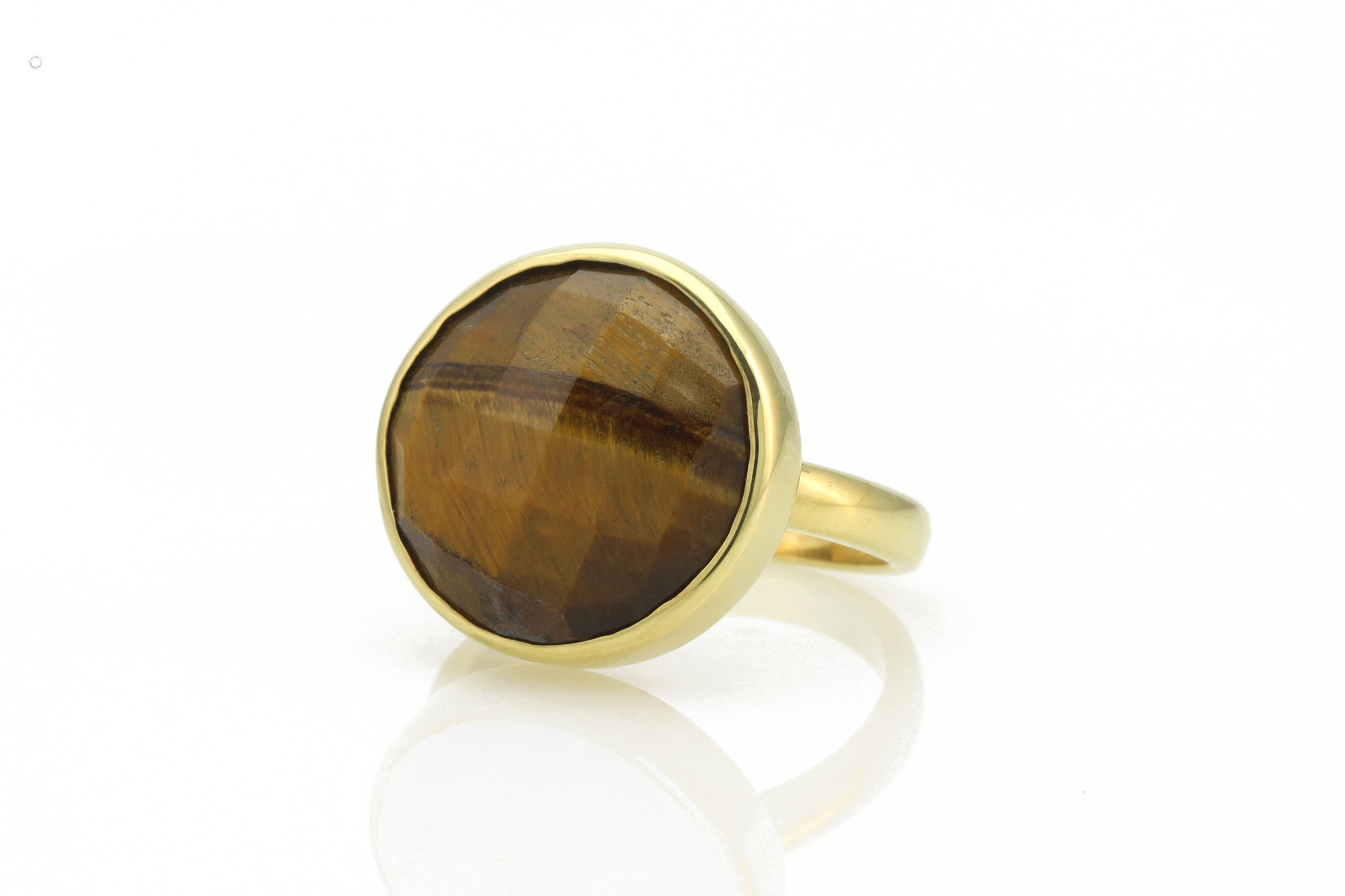 This Tiger Eye gold statement ring with vermeil gold is a beautiful and unique addition to any jewelry collection. The stunning Tiger Eye gemstone is set in a minimalist and dainty gold band that is available in both 18k gold and 24k vermeil gold. This ring is perfect for adding a touch of elegance to any outfit, and it makes an ideal gift for someone special. Handcrafted with care, this Tiger Eye statement ring is sure to impress.