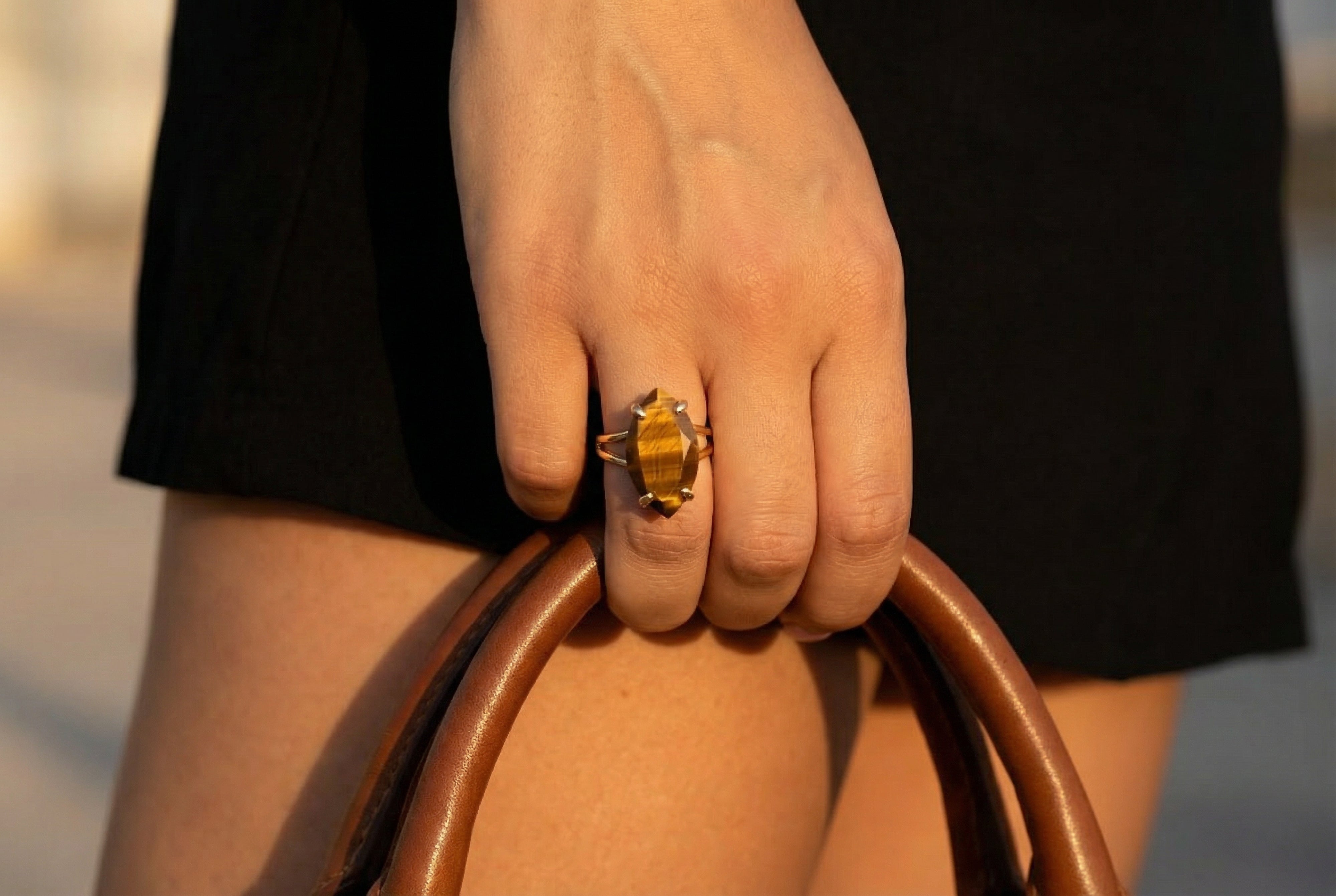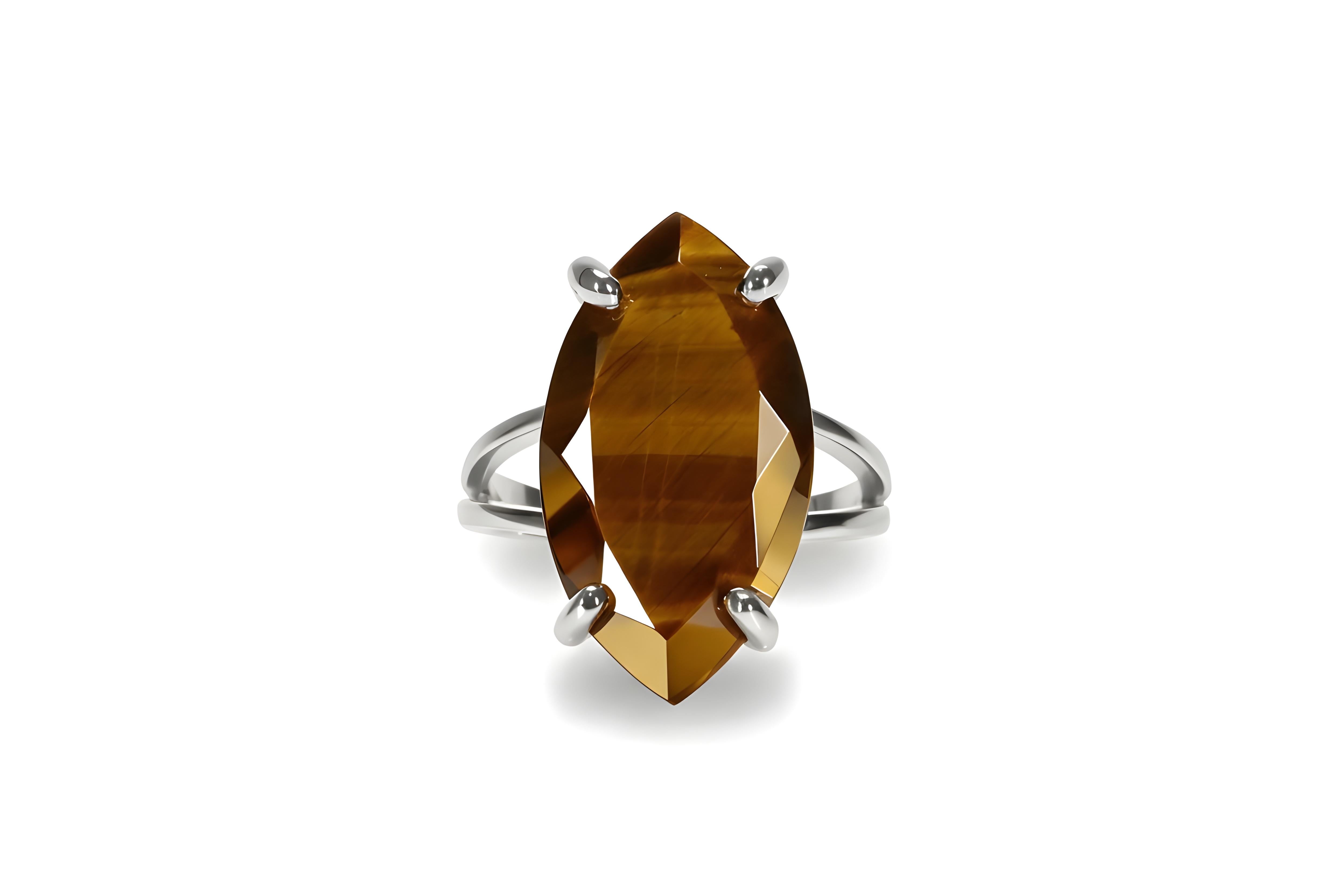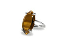 This marquise-cut tiger eye ring brings a warm, reflective glow in a modern silver prong setting. The long, faceted shape enhances the stone’s natural golden stripes, creating an eye-catching piece that feels bold without being heavy.