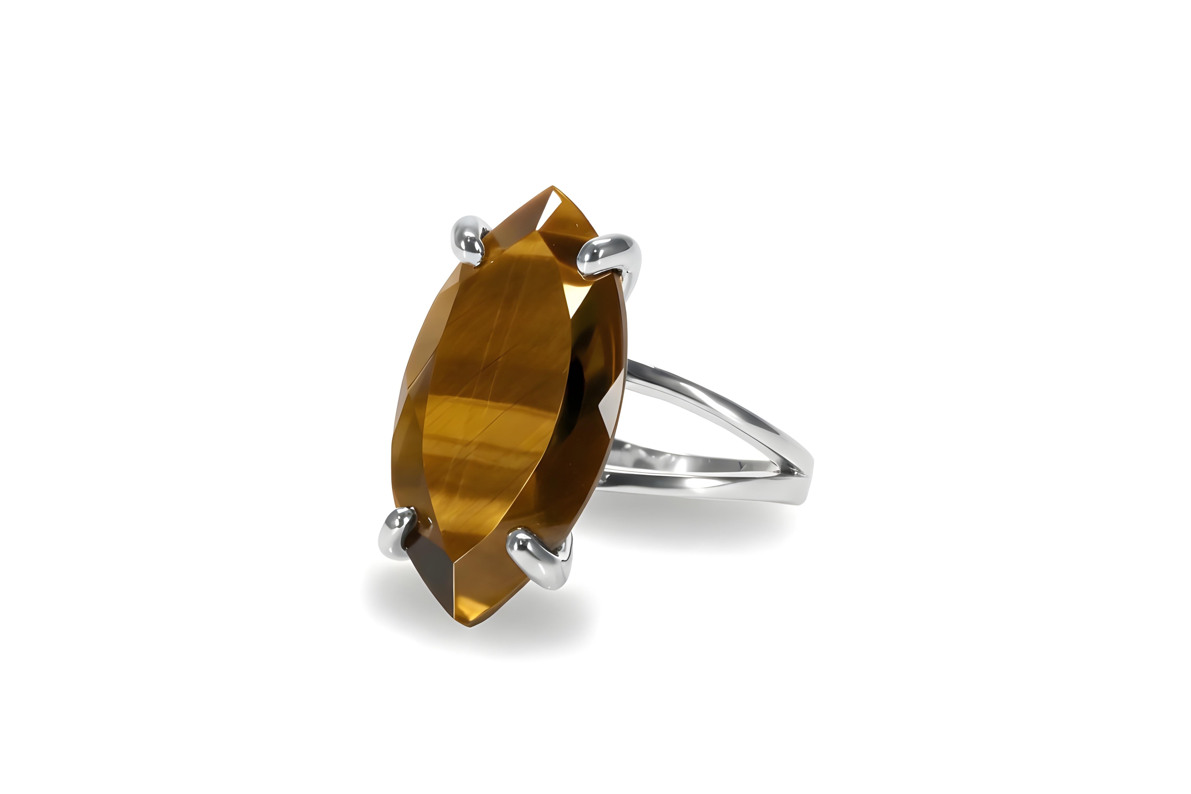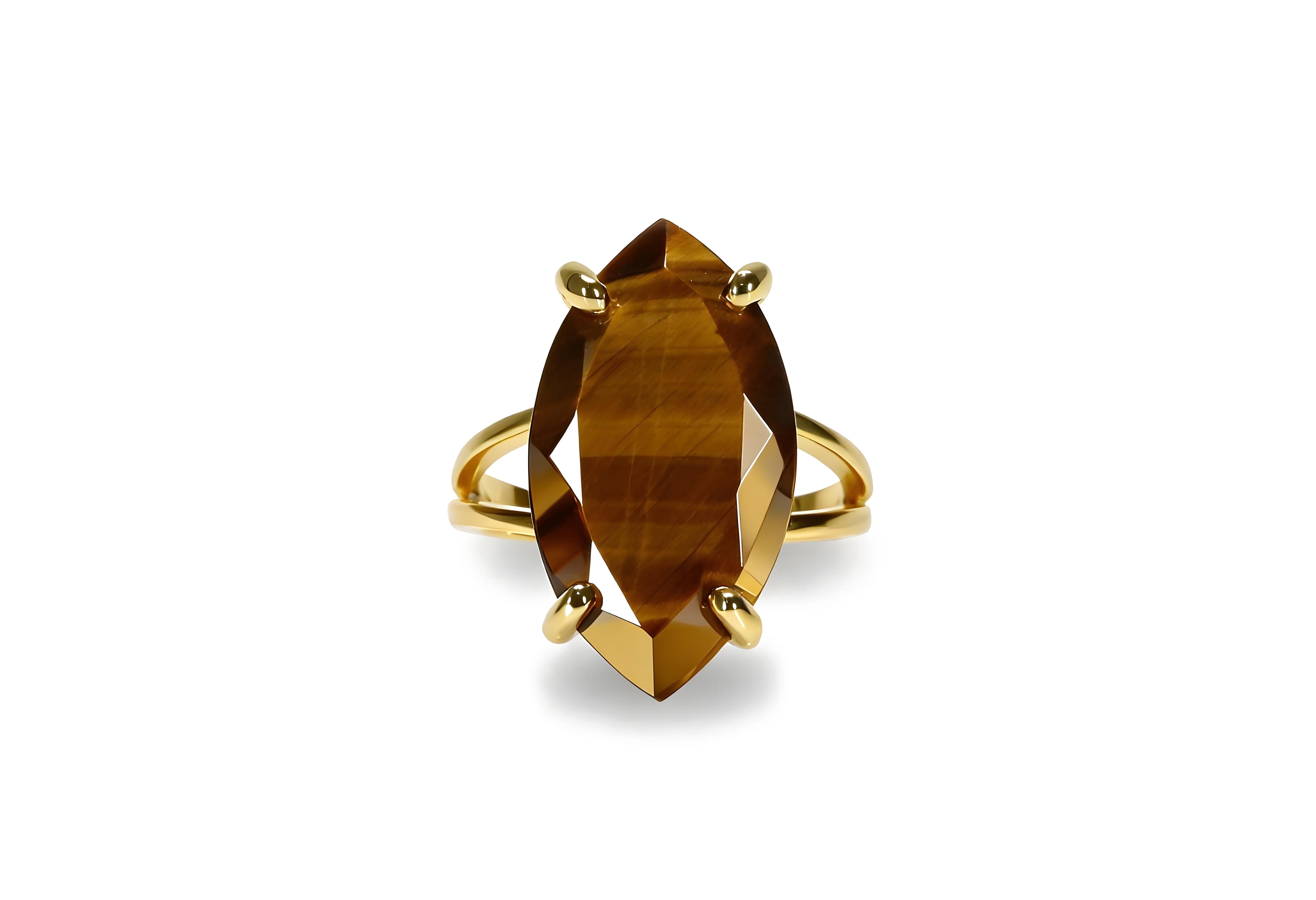 Experience the striking beauty of this yellow gold tiger eye ring, crafted with a trillion cut brown gemstone that catches light from every angle. The faceted semi-precious stone delivers bold color and clarity, creating a stunning statement piece for everyday wear or special events.