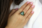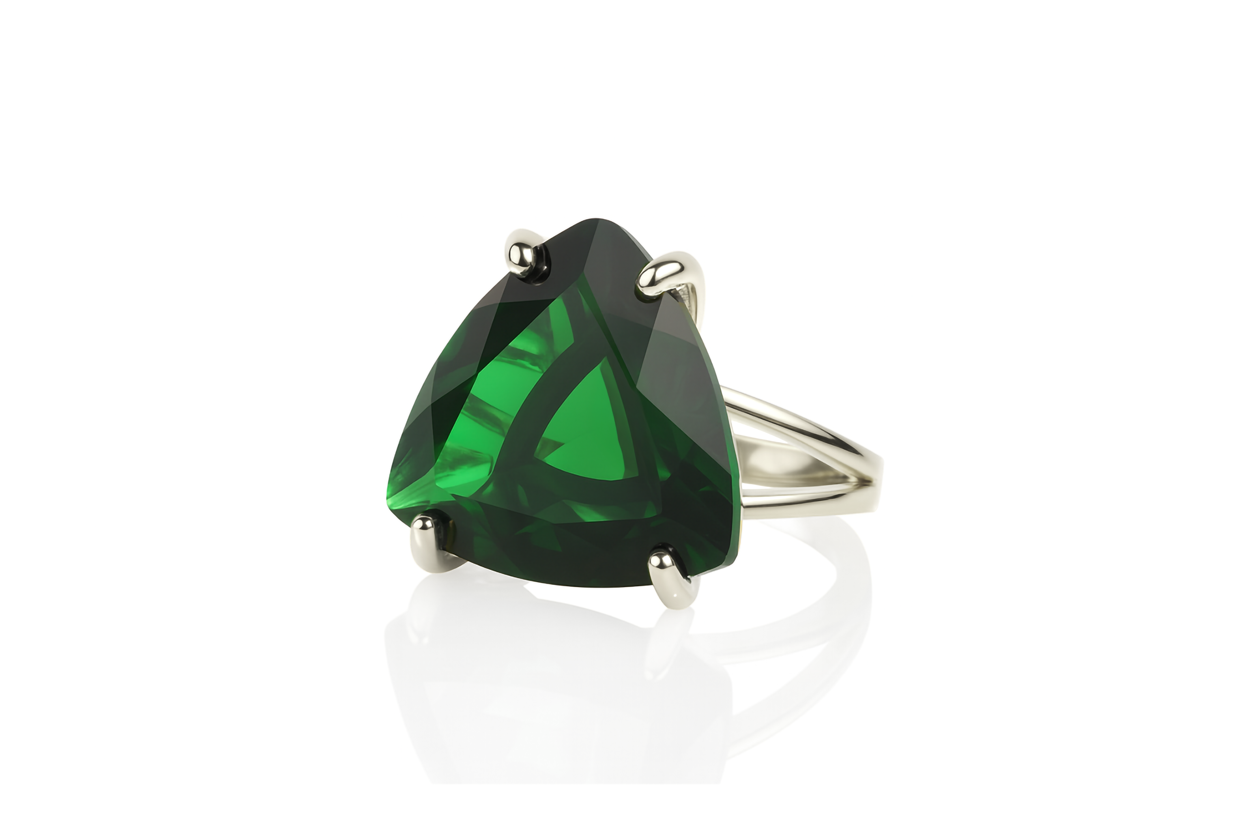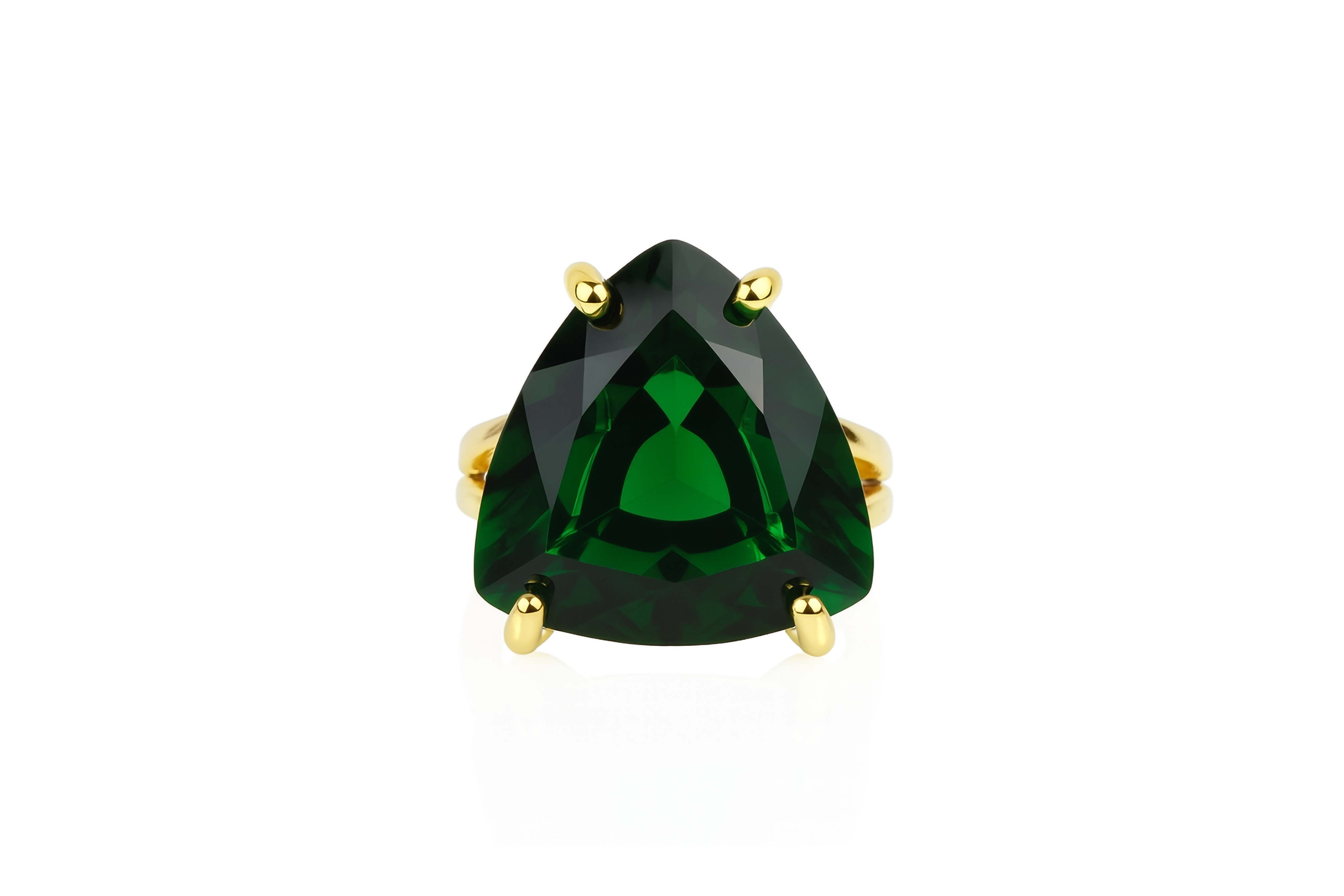 This striking trillion-cut emerald ring brings together geometric beauty and timeless charm. Set in polished gold, the vivid green gemstone shines from every angle, symbolizing May’s birthstone and renewal. Perfect as a statement piece or meaningful gift, it combines a bold triangular silhouette with the warmth of gold, making it an unforgettable choice for any occasion.